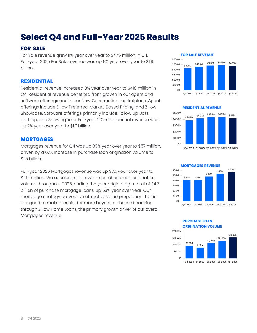 Select Q4 and Full-Year 2025 Results FOR SALE For Sale revenue grew 11% year over year to $475 million in Q4. Full-year 2025 For Sale revenue was up 9% year over year to $1.9 billion. RESIDENTIAL Residential revenue increased 8% year over year to $418 million in Q4. Residential revenue benefited from growth in our agent and software offerings and in our New Construction marketplace. Agent offerings include Zillow Preferred, Market-Based Pricing, and Zillow Showcase. Software offerings primarily include Follow Up Boss, dotloop, and ShowingTime. Full-year 2025 Residential revenue was up 7% year over year to $1.7 billion. MORTGAGES Mortgages revenue for Q4 was up 39% year over year to $57 million, driven by a 67% increase in purchase loan origination volume to $1.5 billion. Full-year 2025 Mortgages revenue was up 37% year over year to $199 million. We accelerated growth in purchase loan origination volume throughout 2025, ending the year originating a total of $4.7 billion of purchase mortgage loans, up 53% year over year. Our mortgage strategy delivers an attractive value proposition that is designed to make it easier for more buyers to choose financing through Zillow Home Loans, the primary growth driver of our overall Mortgages revenue. 8 | Q4 2025