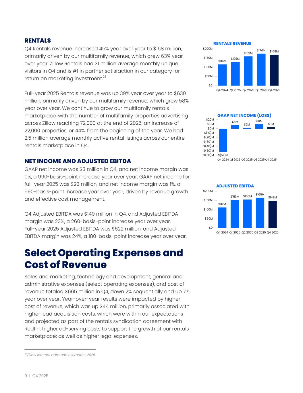 RENTALS Q4 Rentals revenue increased 45% year over year to $168 million, primarily driven by our multifamily revenue, which grew 63% year over year. Zillow Rentals had 31 million average monthly unique visitors in Q4 and is #1 in partner satisfaction in our category for return on marketing investment.23 Full-year 2025 Rentals revenue was up 39% year over year to $630 million, primarily driven by our multifamily revenue, which grew 58% year over year. We continue to grow our multifamily rentals marketplace, with the number of multifamily properties advertising across Zillow reaching 72,000 at the end of 2025, an increase of 22,000 properties, or 44%, from the beginning of the year. We had 2.5 million average monthly active rental listings across our entire rentals marketplace in Q4. NET INCOME AND ADJUSTED EBITDA GAAP net income was $3 million in Q4, and net income margin was 0%, a 990-basis-point increase year over year. GAAP net income for full-year 2025 was $23 million, and net income margin was 1%, a 590-basis-point increase year over year, driven by revenue growth and effective cost management. Q4 Adjusted EBITDA was $149 million in Q4, and Adjusted EBITDA margin was 23%, a 260-basis-point increase year over year. Full-year 2025 Adjusted EBITDA was $622 million, and Adjusted EBITDA margin was 24%, a 180-basis-point increase year over year. Select Operating Expenses and Cost of Revenue Sales and marketing, technology and development, general and administrative expenses (select operating expenses), and cost of revenue totaled $665 million in Q4, down 2% sequentially and up 7% year over year. Year-over-year results were impacted by higher cost of revenue, which was up $44 million, primarily associated with higher lead acquisition costs, which were within our expectations and projected as part of the rentals syndication agreement with Redfin; higher ad-serving costs to support the growth of our rentals marketplace; as well as higher legal expenses. 23Zillow internal data and estimates, 2025. 9 | Q4 2025