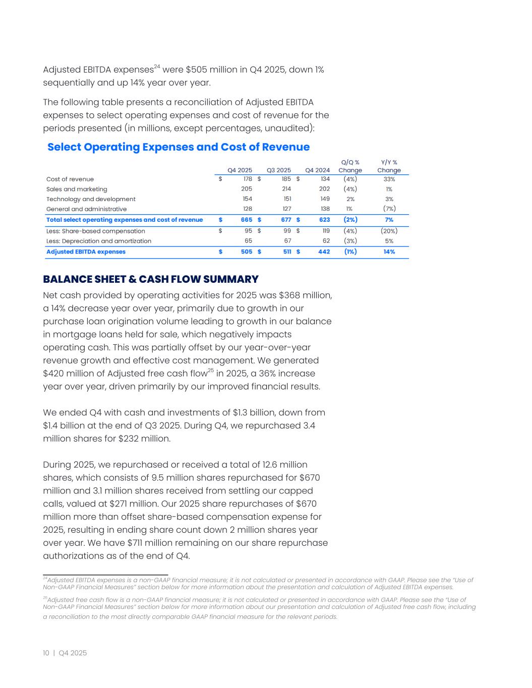 Adjusted EBITDA expenses24 were $505 million in Q4 2025, down 1% sequentially and up 14% year over year. The following table presents a reconciliation of Adjusted EBITDA expenses to select operating expenses and cost of revenue for the periods presented (in millions, except percentages, unaudited): BALANCE SHEET & CASH FLOW SUMMARY Net cash provided by operating activities for 2025 was $368 million, a 14% decrease year over year, primarily due to growth in our purchase loan origination volume leading to growth in our balance in mortgage loans held for sale, which negatively impacts operating cash. This was partially offset by our year-over-year revenue growth and effective cost management. We generated $420 million of Adjusted free cash flow25 in 2025, a 36% increase year over year, driven primarily by our improved financial results. We ended Q4 with cash and investments of $1.3 billion, down from $1.4 billion at the end of Q3 2025. During Q4, we repurchased 3.4 million shares for $232 million. During 2025, we repurchased or received a total of 12.6 million shares, which consists of 9.5 million shares repurchased for $670 million and 3.1 million shares received from settling our capped calls, valued at $271 million. Our 2025 share repurchases of $670 million more than offset share-based compensation expense for 2025, resulting in ending share count down 2 million shares year over year. We have $711 million remaining on our share repurchase authorizations as of the end of Q4. 24Adjusted EBITDA expenses is a non-GAAP financial measure; it is not calculated or presented in accordance with GAAP. Please see the “Use of Non-GAAP Financial Measures” section below for more information about the presentation and calculation of Adjusted EBITDA expenses. 25Adjusted free cash flow is a non-GAAP financial measure; it is not calculated or presented in accordance with GAAP. Please see the “Use of Non-GAAP Financial Measures” section below for more information about our presentation and calculation of Adjusted free cash flow, including a reconciliation to the most directly comparable GAAP financial measure for the relevant periods. 10 | Q4 2025