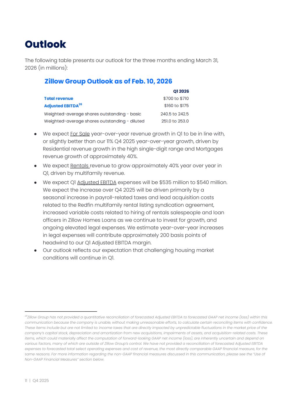 Outlook The following table presents our outlook for the three months ending March 31, 2026 (in millions): 26 ● We expect For Sale year-over-year revenue growth in Q1 to be in line with, or slightly better than our 11% Q4 2025 year-over-year growth, driven by Residential revenue growth in the high single-digit range and Mortgages revenue growth of approximately 40%. ● We expect Rentals revenue to grow approximately 40% year over year in Q1, driven by multifamily revenue. ● We expect Q1 Adjusted EBITDA expenses will be $535 million to $540 million. We expect the increase over Q4 2025 will be driven primarily by a seasonal increase in payroll-related taxes and lead acquisition costs related to the Redfin multifamily rental listing syndication agreement, increased variable costs related to hiring of rentals salespeople and loan officers in Zillow Homes Loans as we continue to invest for growth, and ongoing elevated legal expenses. We estimate year-over-year increases in legal expenses will contribute approximately 200 basis points of headwind to our Q1 Adjusted EBITDA margin. ● Our outlook reflects our expectation that challenging housing market conditions will continue in Q1. 26Zillow Group has not provided a quantitative reconciliation of forecasted Adjusted EBITDA to forecasted GAAP net income (loss) within this communication because the company is unable, without making unreasonable efforts, to calculate certain reconciling items with confidence. These items include but are not limited to: income taxes that are directly impacted by unpredictable fluctuations in the market price of the company’s capital stock, depreciation and amortization from new acquisitions, impairments of assets, and acquisition-related costs. These items, which could materially affect the computation of forward-looking GAAP net income (loss), are inherently uncertain and depend on various factors, many of which are outside of Zillow Group’s control. We have not provided a reconciliation of forecasted Adjusted EBITDA expenses to forecasted total select operating expenses and cost of revenue, the most directly comparable GAAP financial measure, for the same reasons. For more information regarding the non-GAAP financial measures discussed in this communication, please see the “Use of Non-GAAP Financial Measures” section below. 11 | Q4 2025