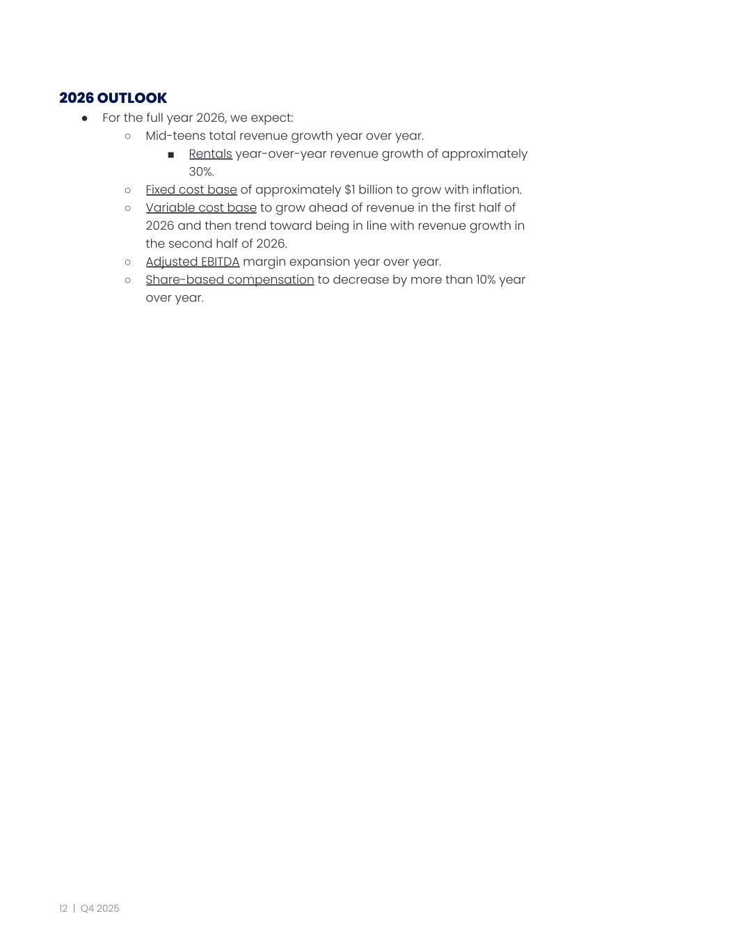 2026 OUTLOOK ●​ For the full year 2026, we expect: ○​ Mid-teens total revenue growth year over year. ■​ Rentals year-over-year revenue growth of approximately 30%. ○​ Fixed cost base of approximately $1 billion to grow with inflation. ○​ Variable cost base to grow ahead of revenue in the first half of 2026 and then trend toward being in line with revenue growth in the second half of 2026. ○​ Adjusted EBITDA margin expansion year over year. ○​ Share-based compensation to decrease by more than 10% year over year. 12 | Q4 2025