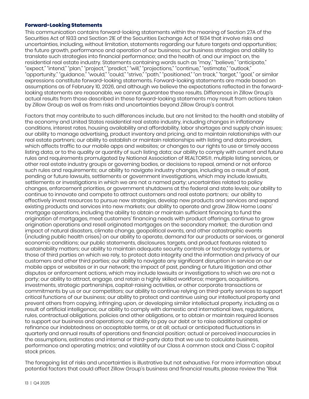 Forward-Looking Statements This communication contains forward-looking statements within the meaning of Section 27A of the Securities Act of 1933 and Section 21E of the Securities Exchange Act of 1934 that involve risks and uncertainties, including, without limitation, statements regarding our future targets and opportunities; the future growth, performance and operation of our business; our business strategies and ability to translate such strategies into financial performance; and the health of, and our impact on, the residential real estate industry. Statements containing words such as “may,” “believe,” “anticipate,” “expect,” “intend,” “plan,” “project,” “predict,” “will,” “projections,” “continue,” “estimate,” “outlook,” “opportunity,” “guidance,” “would,” “could,” “strive,” “path,” “positioned,” “on track,” “target,” “goal,” or similar expressions constitute forward-looking statements. Forward-looking statements are made based on assumptions as of February 10, 2026, and although we believe the expectations reflected in the forward- looking statements are reasonable, we cannot guarantee these results. Differences in Zillow Group’s actual results from those described in these forward-looking statements may result from actions taken by Zillow Group as well as from risks and uncertainties beyond Zillow Group’s control. Factors that may contribute to such differences include, but are not limited to: the health and stability of the economy and United States residential real estate industry, including changes in inflationary conditions, interest rates, housing availability and affordability, labor shortages and supply chain issues; our ability to manage advertising, product inventory and pricing, and to maintain relationships with our real estate partners; our ability to establish or maintain relationships with listing and data providers, which affects traffic to our mobile apps and websites; or changes to our rights to use or timely access listing data, or to the quality or quantity of such listing data; our ability to comply with current and future rules and requirements promulgated by National Association of REALTORS®, multiple listing services, or other real estate industry groups or governing bodies, or decisions to repeal, amend or not enforce such rules and requirements; our ability to navigate industry changes, including as a result of past, pending or future lawsuits, settlements or government investigations, which may include lawsuits, settlements or investigations in which we are not a named party; uncertainties related to policy changes, enforcement priorities, or government shutdowns at the federal and state levels; our ability to continue to innovate and compete to attract customers and real estate partners; our ability to effectively invest resources to pursue new strategies, develop new products and services and expand existing products and services into new markets; our ability to operate and grow Zillow Home Loans’ mortgage operations, including the ability to obtain or maintain sufficient financing to fund the origination of mortgages, meet customers’ financing needs with product offerings, continue to grow origination operations and resell originated mortgages on the secondary market; the duration and impact of natural disasters, climate change, geopolitical events, and other catastrophic events (including public health crises) on our ability to operate, demand for our products or services, or general economic conditions; our public statements, disclosures, targets, and product features related to sustainability matters; our ability to maintain adequate security controls or technology systems, or those of third parties on which we rely, to protect data integrity and the information and privacy of our customers and other third parties; our ability to navigate any significant disruption in service on our mobile apps or websites or in our network; the impact of past, pending or future litigation and other disputes or enforcement actions, which may include lawsuits or investigations to which we are not a party; our ability to attract, engage, and retain a highly skilled workforce; mergers, acquisitions, investments, strategic partnerships, capital-raising activities, or other corporate transactions or commitments by us or our competitors; our ability to continue relying on third-party services to support critical functions of our business; our ability to protect and continue using our intellectual property and prevent others from copying, infringing upon, or developing similar intellectual property, including as a result of artificial intelligence; our ability to comply with domestic and international laws, regulations, rules, contractual obligations, policies and other obligations, or to obtain or maintain required licenses to support our business and operations; our ability to pay our debt or to raise additional capital or refinance our indebtedness on acceptable terms, or at all; actual or anticipated fluctuations in quarterly and annual results of operations and financial position; actual or perceived inaccuracies in the assumptions, estimates and internal or third-party data that we use to calculate business, performance and operating metrics; and volatility of our Class A common stock and Class C capital stock prices. The foregoing list of risks and uncertainties is illustrative but not exhaustive. For more information about potential factors that could affect Zillow Group’s business and financial results, please review the “Risk 13 | Q4 2025