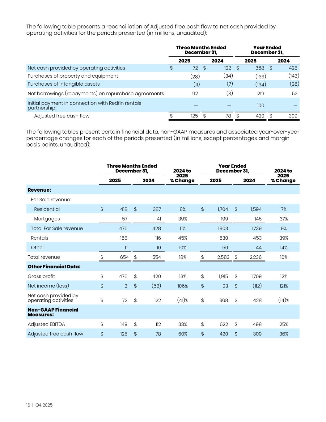 The following table presents a reconciliation of Adjusted free cash flow to net cash provided by operating activities for the periods presented (in millions, unaudited):   Three Months Ended December 31, Year Ended December 31, 2025 2024 2025 2024 Net cash provided by operating activities $ 72 $ 122 $ 368 $ 428 Purchases of property and equipment (28) (34) (133) (143) Purchases of intangible assets (11) (7) (134) (28) Net borrowings (repayments) on repurchase agreements 92 (3) 219 52 Initial payment in connection with Redfin rentals partnership — — 100 — Adjusted free cash flow $ 125 $ 78 $ 420 $ 309 The following tables present certain financial data, non-GAAP measures and associated year-over-year percentage changes for each of the periods presented (in millions, except percentages and margin basis points, unaudited): Three Months Ended December 31, 2024 to 2025 % Change Year Ended December 31, 2024 to 2025 % Change2025 2024 2025 2024 Revenue: For Sale revenue: Residential $ 418 $ 387 8% $ 1,704 $ 1,594 7% Mortgages 57 41 39% 199 145 37% Total For Sale revenue 475 428 11% 1,903 1,739 9% Rentals 168 116 45% 630 453 39% Other 11 10 10% 50 44 14% Total revenue $ 654 $ 554 18% $ 2,583 $ 2,236 16% Other Financial Data: Gross profit $ 476 $ 420 13% $ 1,915 $ 1,709 12% Net income (loss) $ 3 $ (52) 106% $ 23 $ (112) 121% Net cash provided by operating activities $ 72 $ 122 (41)% $ 368 $ 428 (14)% Non-GAAP Financial Measures: Adjusted EBITDA $ 149 $ 112 33% $ 622 $ 498 25% Adjusted free cash flow $ 125 $ 78 60% $ 420 $ 309 36% 16 | Q4 2025