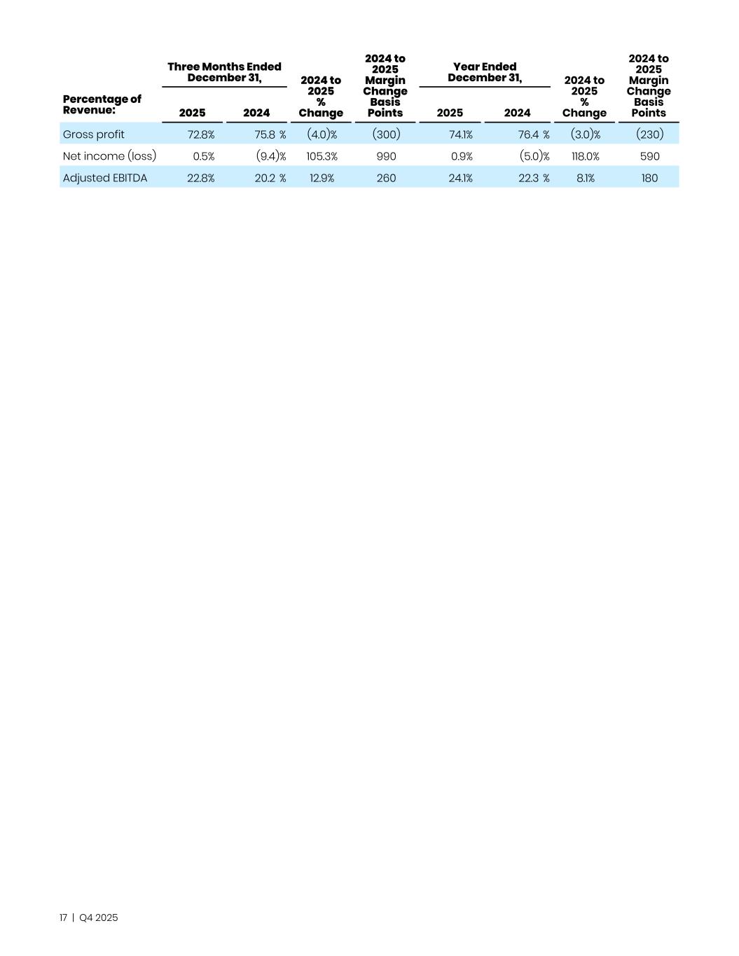 Three Months Ended December 31, 2024 to 2025 % Change 2024 to 2025 Margin Change Basis Points Year Ended December 31, 2024 to 2025 % Change 2024 to 2025 Margin Change Basis Points Percentage of Revenue: 2025 2024 2025 2024 Gross profit 72.8 % 75.8 % (4.0)% (300) 74.1 % 76.4 % (3.0)% (230) Net income (loss) 0.5 % (9.4) % 105.3% 990 0.9 % (5.0) % 118.0% 590 Adjusted EBITDA 22.8 % 20.2 % 12.9% 260 24.1 % 22.3 % 8.1% 180 17 | Q4 2025