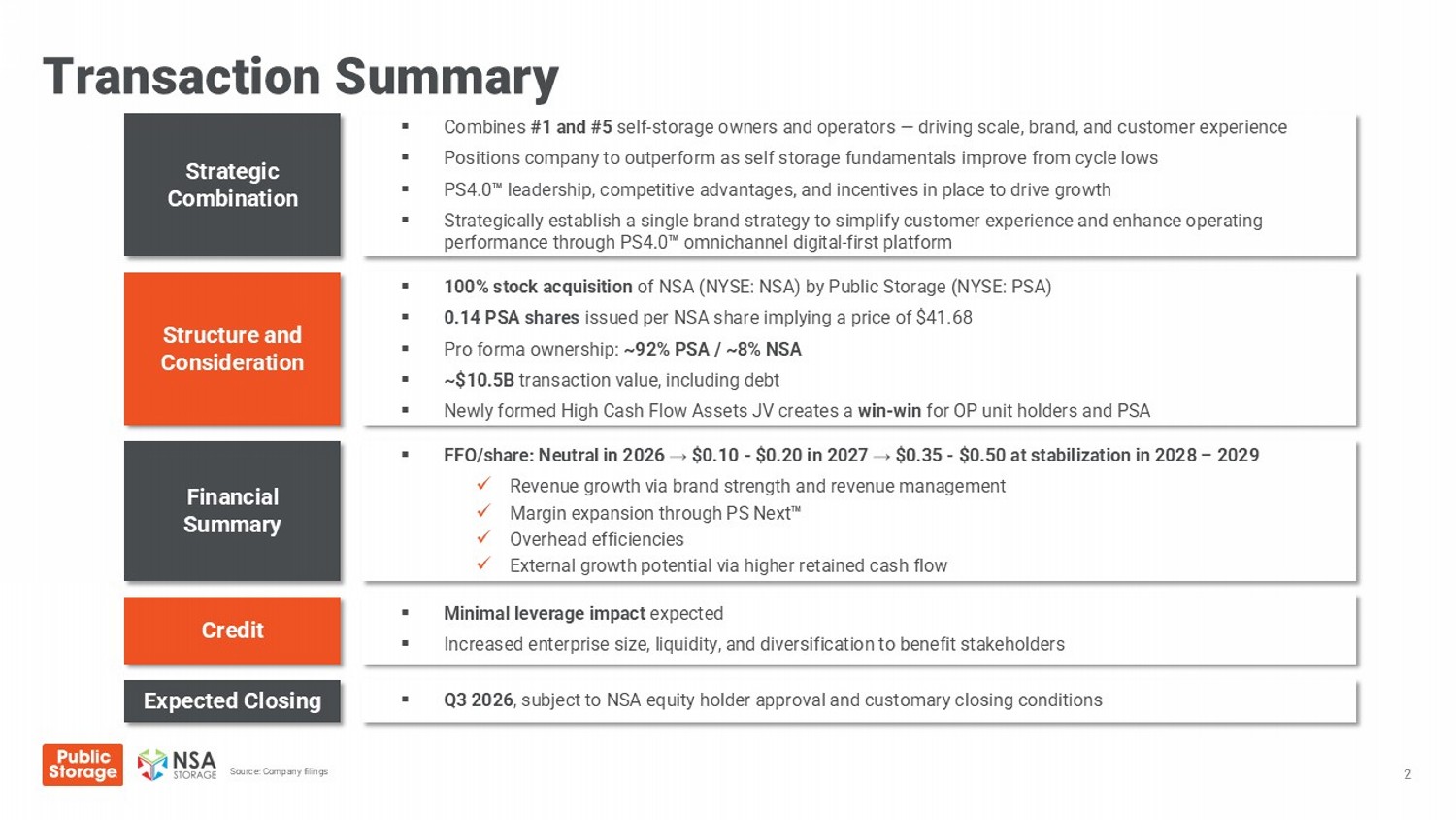 2 Transaction Summary Structure and Consideration Financial Summary Expected Closing ▪ 100% stock acquisition of NSA (NYSE: NSA) by Public Storage (NYSE: PSA) ▪ 0.14 PSA shares issued per NSA share implying a price of $41.68 ▪ Pro forma ownership: ~92% PSA / ~8% NSA ▪ ~$10.5B transaction value, including debt ▪ Newly formed High Cash Flow Assets JV creates a win - win for OP unit holders and PSA ▪ FFO/share: Neutral in 2026 → $0.10 - $0.20 in 2027 → $0.35 - $0.50 at stabilization in 2028 – 2029 x Revenue growth via brand strength and revenue management x Margin expansion through PS Next x Overhead efficiencies x External growth potential via higher retained cash flow ▪ Q3 2026 , subject to NSA equity holder approval and customary closing conditions Strategic Combination ▪ Combines #1 and #5 self - storage owners and operators — driving scale, brand, and customer experience ▪ Positions company to outperform as self storage fundamentals improve from cycle lows ▪ PS4.0 leadership, competitive advantages, and incentives in place to drive growth ▪ Strategically establish a single brand strategy to simplify customer experience and enhance operating performance through PS4.0 omnichannel digital - first platform Source: Company filings Credit ▪ Minimal leverage impact expected ▪ Increased enterprise size, liquidity, and diversification to benefit stakeholders