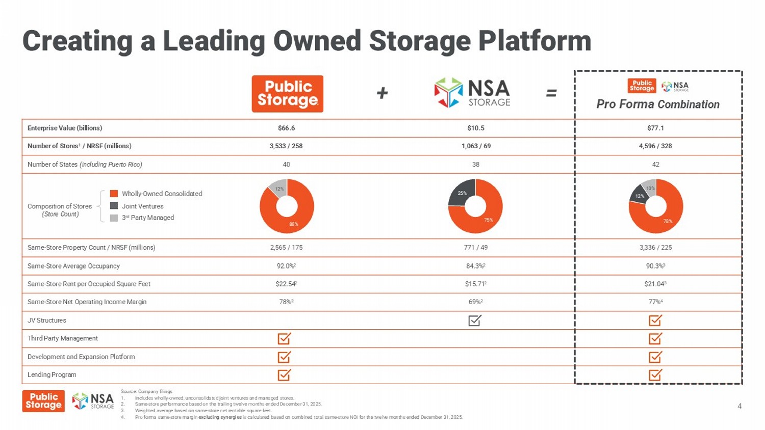 3 Strategic Rationale – A Win - Win for all stakeholders Source: Company filings • Wholly - owned portfolio (46% of NSA assets) deepens exposure to Sunbelt and core markets • Immediate integration into best - in - class PS Next operating platform • Majority Gen 1 single - story properties = strong access and efficiency Complementary Markets & Assets • New JV formed with 313 wholly - owned NSA properties at closing • OP unit holders own 80% of new High Cash Flow Assets JV; PSA owns 20 % • Balances yield for NSA holders with PSA's long - term growth focus in core markets Creative Joint Venture Structure • Increased enterprise scale, diversification and liquidity • Best - in - class credit profile maintained • Enhanced free cash flow supports continued external growth Exceptional Balance Sheet • $110 – 130M in identified, actionable synergies • ~900bps margin differential between overlapping markets presents material upside • ~11 – 15% revenue lift via PS Next platform Synergy & Margin Upside • FFO/share Impact: Neutral in ‘26 → $0.35 - $0.50 (2% - 3%) per share run - rate in Year 3+ • Expanded platform for acquisitions, development, lending, 3 rd party management and tenant reinsurance Accelerated Growth & Profitability • Further advances leading owned + operated self - storage platform • Unifies multiple brands under the #1 recognized name in storage • Expands industry's deepest datasets Category Leading Scale & Brand