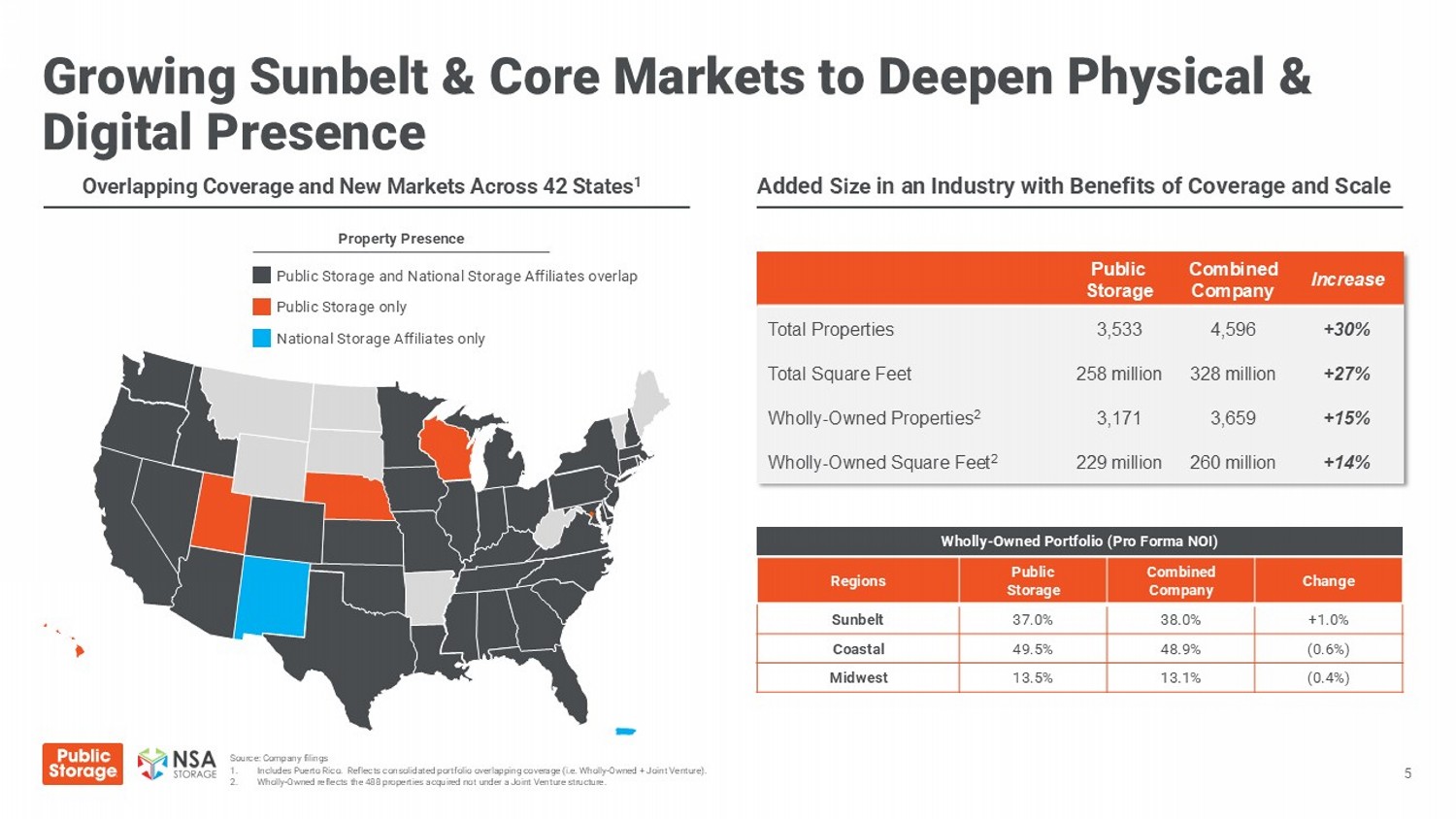 4 Creating a Leading Owned Storage Platform Source: Company filings 1. Includes wholly - owned, unconsolidated joint ventures and managed stores. 2. Same - store performance based on the trailing twelve months ended December 31, 2025. 3. Weighted average based on same - store net rentable square feet. 4. Pro forma same - store margin excluding synergies is calculated based on combined total same - store NOI for the twelve months ended December 31, 2025. $77.1 $10.5 $66.6 Enterprise Value (billions) 4,596 / 328 1,063 / 69 3,533 / 258 Number of Stores 1 / NRSF (millions) 42 38 40 Number of States (including Puerto Rico) Composition of Stores (Store Count) 3,336 / 225 771 / 49 2,565 / 175 Same - Store Property Count / NRSF (millions) 90.3% 3 84.3% 2 92.0% 2 Same - Store Average Occupancy $21.04 3 $15.71 2 $22.54 2 Same - Store Rent per Occupied Square Feet 77% 4 69% 2 78% 2 Same - Store Net Operating Income Margin JV Structures Third Party Management Development and Expansion Platform Lending Program + = Pro Forma Combination 88% 12% Wholly - Owned Consolidated Joint Ventures 3 rd Party Managed 75% 25% 78% 12% 10%