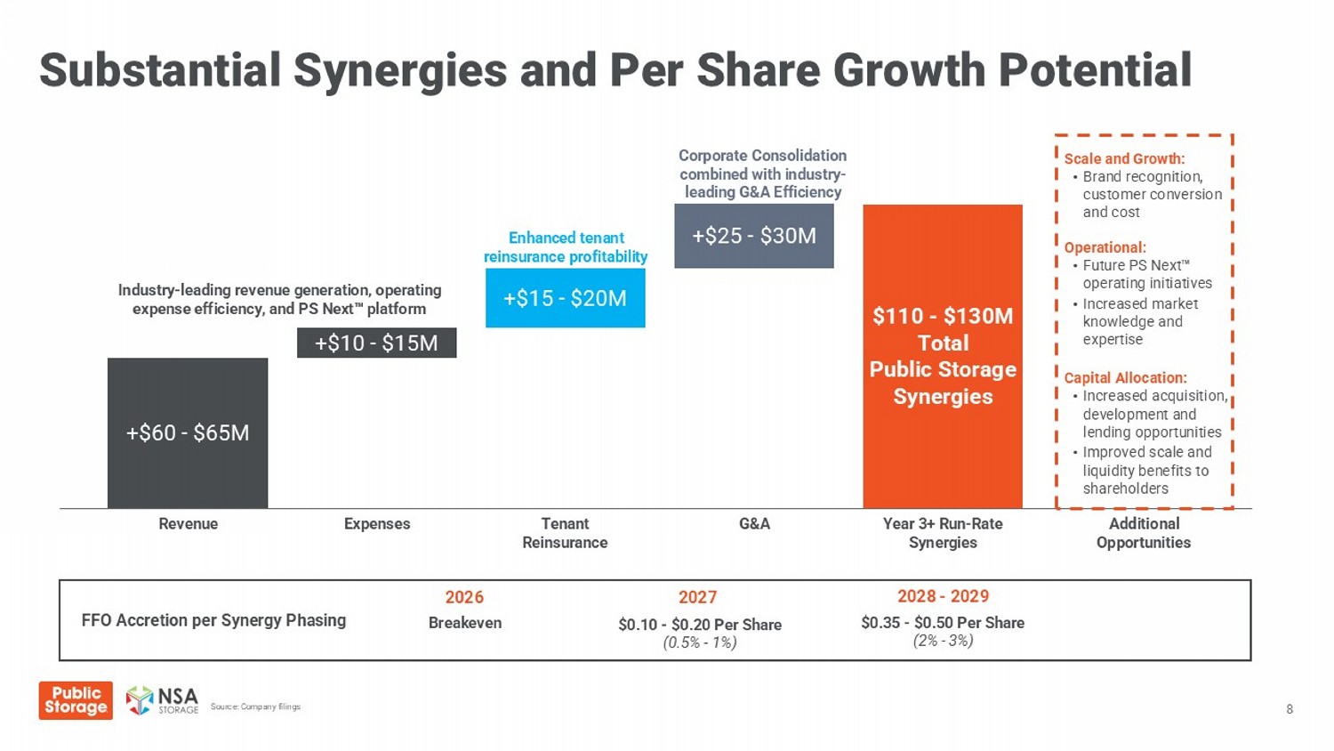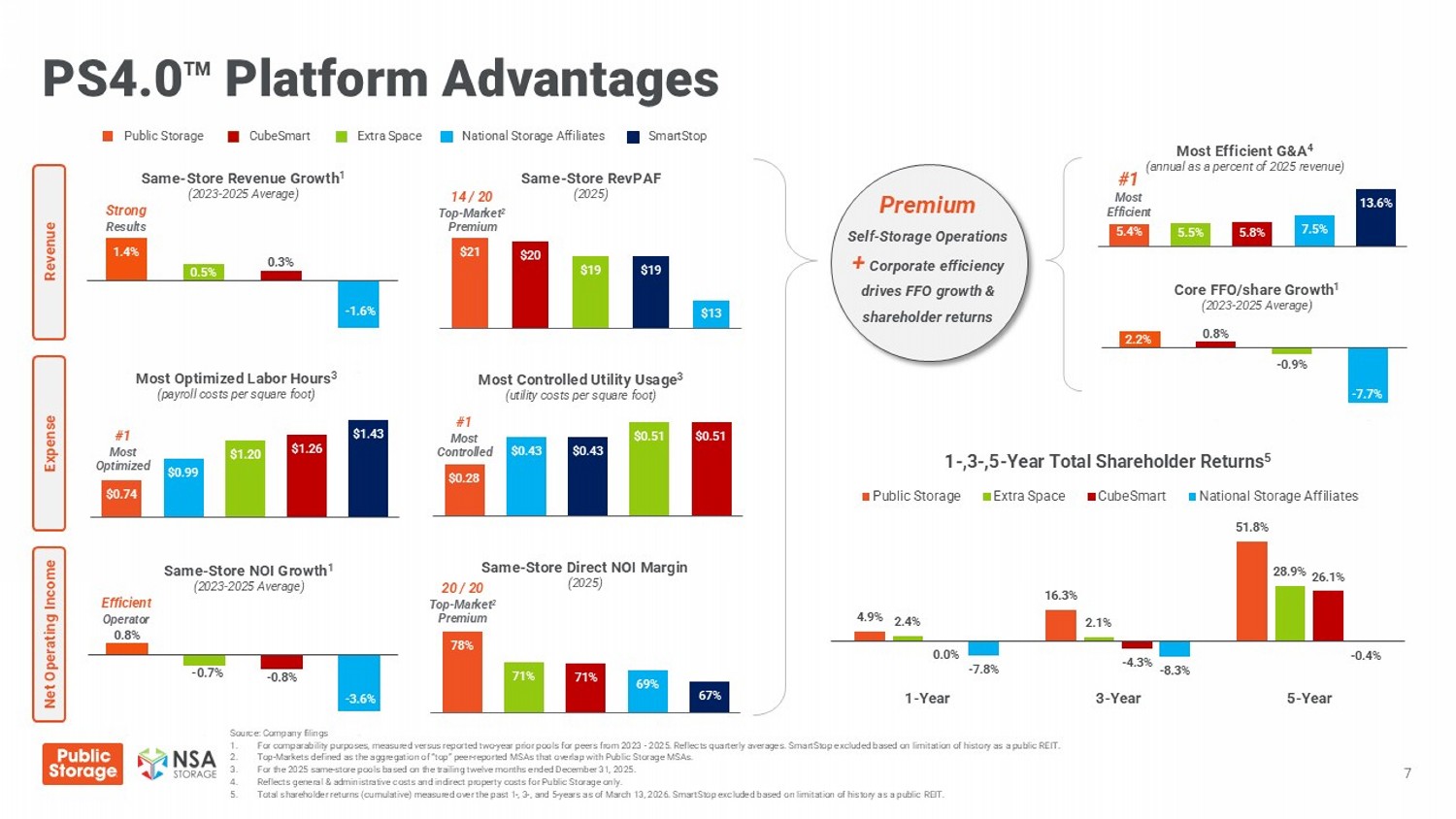 7 $21 $20 $19 $19 $13 Same - Store RevPAF (2025) PS4.0 TM Platform Advantages Source: Company filings 1. For comparability purposes, measured versus reported two - year prior pools for peers from 2023 - 2025. Reflects quarterly average s. SmartStop excluded based on limitation of history as a public REIT. 2. Top - Markets defined as the aggregation of “top” peer - reported MSAs that overlap with Public Storage MSAs. 3. For the 2025 same - store pools based on the trailing twelve months ended December 31, 2025. 4. Reflects general & administrative costs and indirect property costs for Public Storage only. 5. Total shareholder returns (cumulative) measured over the past 1 - , 3 - , and 5 - years as of March 13, 2026. SmartStop excluded based on limitation of history as a public REIT. $0.74 $0.99 $1.20 $1.26 $1.43 Most Optimized Labor Hours 3 (payroll costs per square foot) #1 Most Optimized 14 / 20 Top - Market 2 Premium $0.28 $0.43 $0.43 $0.51 $0.51 Most Controlled Utility Usage 3 (utility costs per square foot) #1 Most Controlled 5.4% 5.5% 5.8% 7.5% 13.6% Most Efficient G&A 4 (annual as a percent of 2025 revenue) #1 Most Efficient Net Operating Income Expense Revenue 1.4% 0.5% 0.3% - 1.6% PSA EXR CUBE NSA Same - Store Revenue Growth 1 (2023 - 2025 Average) 0.8% - 0.7% - 0.8% - 3.6% PSA CUBE EXR NSA Same - Store NOI Growth 1 (2023 - 2025 Average) 78% 71% 71% 69% 67% Same - Store Direct NOI Margin (2025) Public Storage CubeSmart Extra Space National Storage Affiliates SmartStop 20 / 20 Top - Market 2 Premium Strong Results Efficient Operator Premium Self - Storage Operations + Corporate efficiency drives FFO growth & shareholder returns 2.2% 0.8% - 0.9% - 7.7% PSA CUBE EXR NSA Core FFO/share Growth 1 (2023 - 2025 Average) 4.9% 16.3% 51.8% 2.4% 2.1% 28.9% 0.0% - 4.3% 26.1% - 7.8% - 8.3% - 0.4% 1-Year 3-Year 5-Year 1 - ,3 - ,5 - Year Total Shareholder Returns 5 Public Storage Extra Space CubeSmart National Storage Affiliates