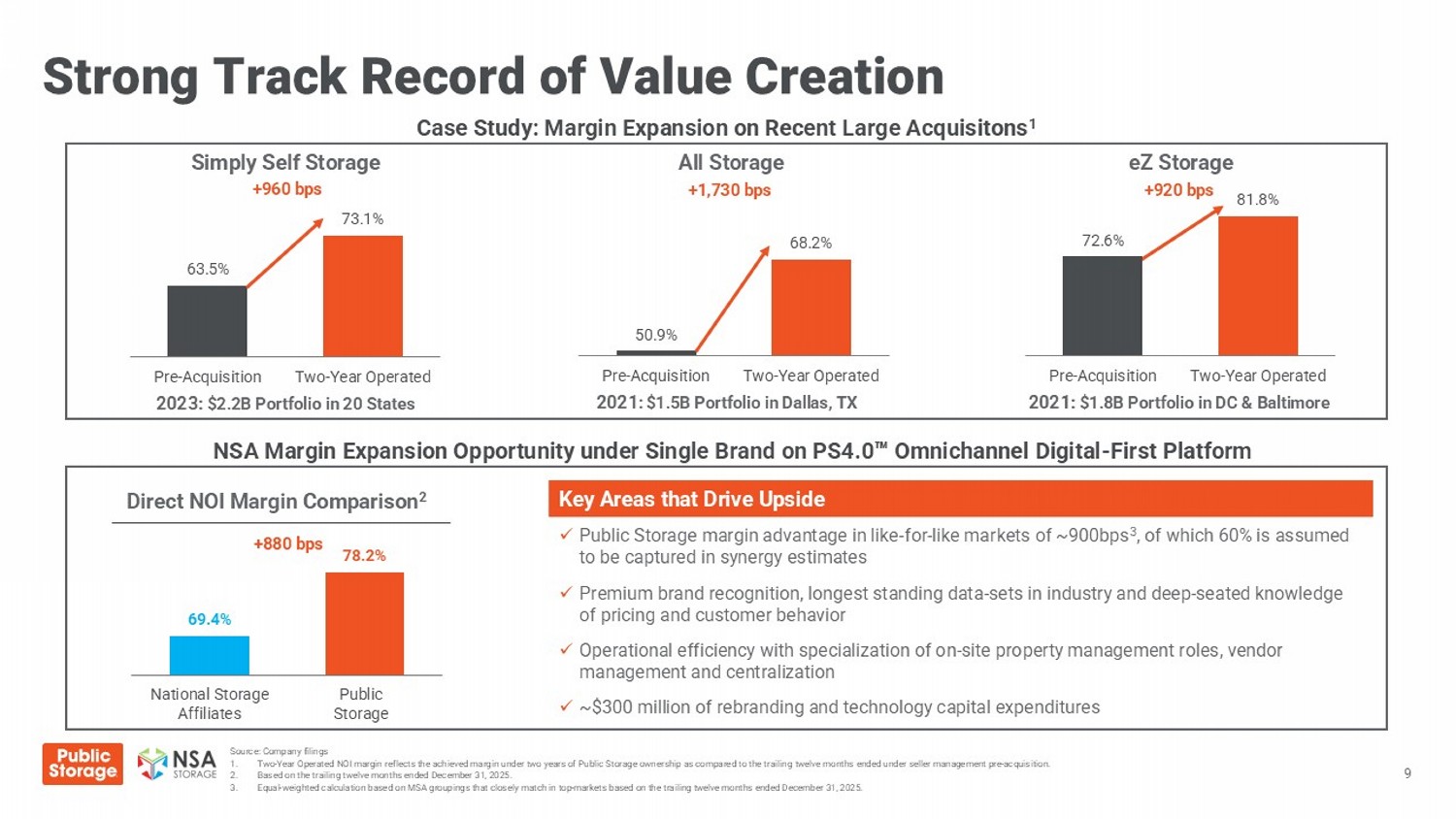 8 Substantial Synergies and Per Share Growth Potential +$60 - $65M +$15 - $20M +$25 - $30M Industry - leading revenue generation, operating expense efficiency, and PS Next platform Revenue Tenant Reinsurance $110 - $130M Total Public Storage Synergies Year 3+ Run - Rate Synergies Enhanced tenant reinsurance profitability Corporate Consolidation combined with industry - leading G&A Efficiency Source: Company filings +$10 - $15M Expenses G&A Additional Opportunities Scale and Growth: • Brand recognition, customer conversion and cost Operational: • Future PS Next operating initiatives • Increased market knowledge and expertise Capital Allocation: • Increased acquisition, development and lending opportunities • Improved scale and liquidity benefits to shareholders FFO Accretion per Synergy Phasing Breakeven $0.10 - $0.20 Per Share (0.5% - 1%) $0.35 - $0.50 Per Share (2% - 3%) 2026 2027 2028 - 2029