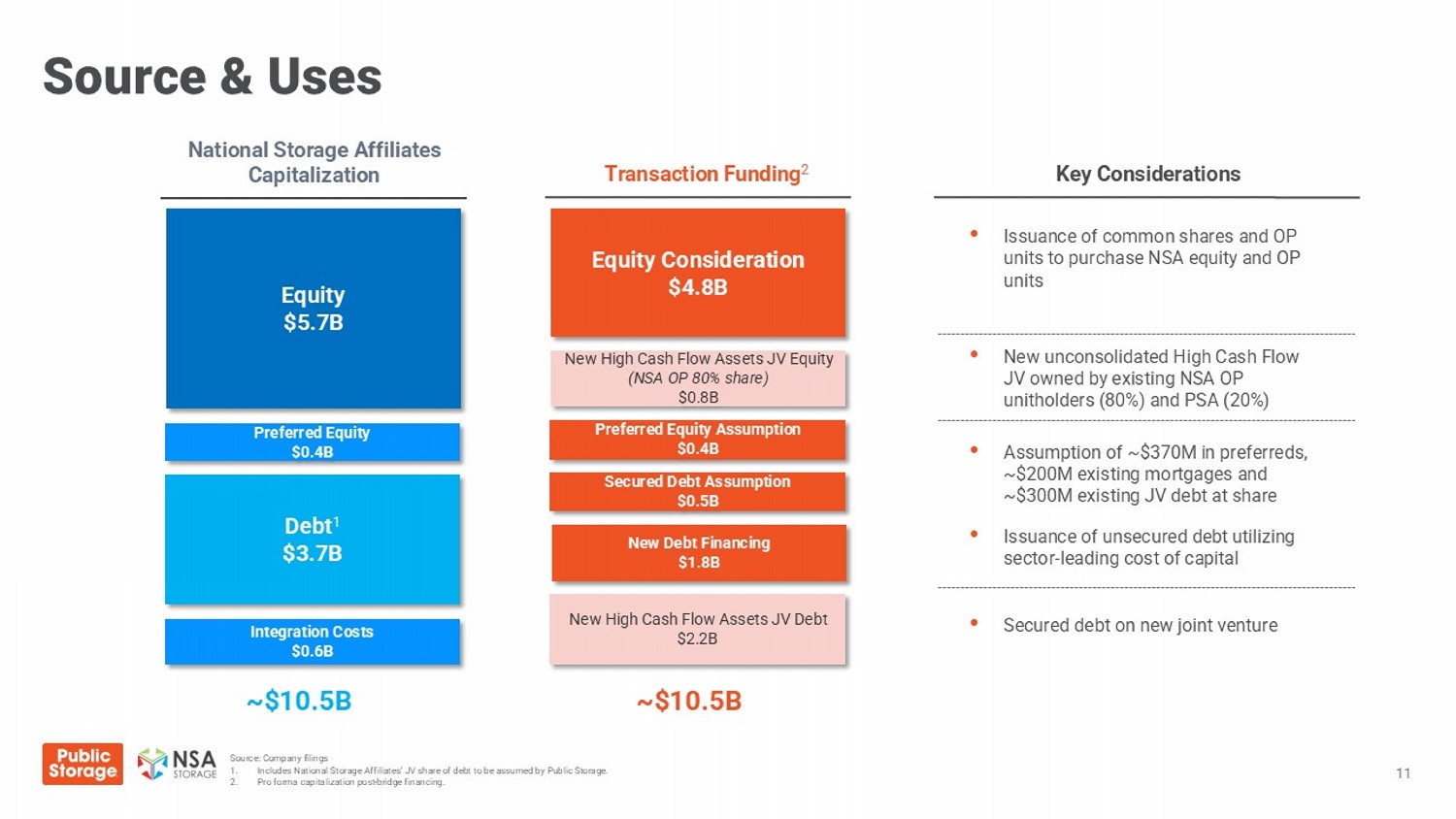 10 New Joint Venture Structure Creates Pro Forma Portfolio Source: Company filings, company - provided diligence materials 1. Due to intra period dispositions and recharacterizations of pools, values may not match recorded FY2025 National Storage Affi lia tes results. 2. For reconciliation purposes, table shows 20% share of New High Cash Flow Assets JV and 25% share of Existing JVs. 3. Based on full stabilization, at - share, with total synergies of $110 - 130 million, including $25 - 30 million of G&A synergies. Consolidated Pro Forma Ownership Pro Forma National Storage Affiliates Reconciliation Table 1 Existing JVs 2 New High Cash Flow Assets JV 2 Wholly - Owned Higher Growth Markets Existing JVs 2 Consolidated ($ millions, unless otherwise stated and based on trailing twelve months ended 12/31/25) 25% 20% 100% 25% 100% Ownership Percentage 1,063 262 313 488 262 801 Property Count 69.3 18.2 19.6 31.5 18.2 51.1 Net Rentable sqft (millions) $ 533 $ 62 $ 52 $ 419 $ 62 $ 679 Rental Revenue $ 360 $ 41 $ 36 $ 283 $ 41 $ 461 NOI $110 – $130 - $ 9 – $10 $ 76 – $90 - - PSA Share of Synergies 3 $ 3.3 $ 0.3 $ 0.6 $ 2.4 $ 0.3 $ 3.8 Debt & Preferred Equity ($ billions) • $110 – $130 million in synergies, at share, after 3+ years of stabilizing acquired properties • Existing NSA portfolio will be segmented into three components: Wholly - Owned, a new Joint Venture and Existing Joint Ventures • The balance of synergies comes from G&A $25 – $30 million