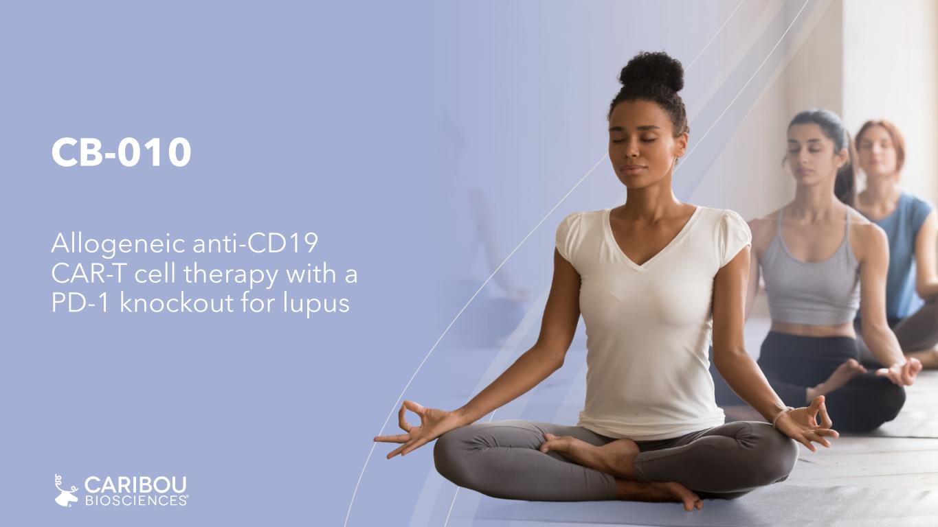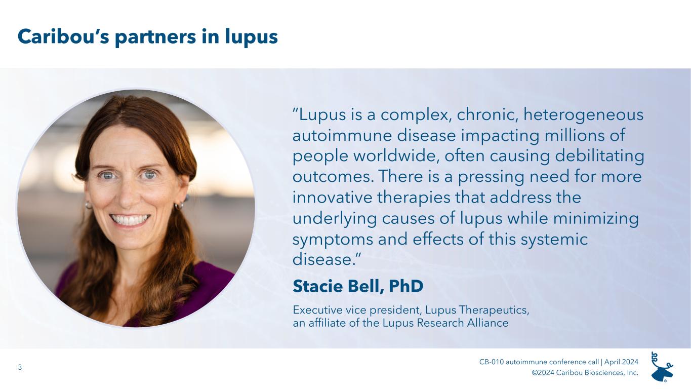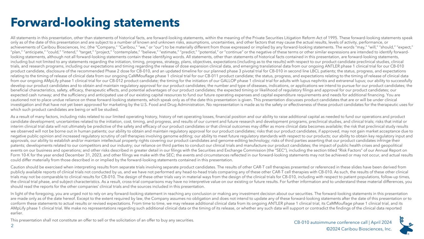 2 CB-010 autoimmune conference call | April 2024 ©2024 Caribou Biosciences, Inc. Forward-looking statements All statements in this presentation, other than statements of historical facts, are forward-looking statements, within the meaning of the Private Securities Litigation Reform Act of 1995. These forward-looking statements speak only as of the date of this presentation and are subject to a number of known and unknown risks, assumptions, uncertainties, and other factors that may cause the actual results, levels of activity, performance, or achievements of Caribou Biosciences, Inc. (the “Company,” “Caribou,” “we,” or “our”) to be materially different from those expressed or implied by any forward-looking statements. The words “may,” “will,” “should,” “expect,” “plan,” “anticipate,” “could,” “intend,” “target,” “project,” “contemplate,” “believe,” “estimate,” “predict,” “potential,” or “continue” or the negative of these terms or other similar expressions are intended to identify forward- looking statements, although not all forward-looking statements contain these identifying words. All statements, other than statements of historical facts contained in this presentation, are forward-looking statements, including but not limited to any statements regarding the initiation, timing, progress, strategy, plans, objectives, expectations (including as to the results) with respect to our product candidate preclinical studies, clinical trials, and research programs, including our expectations and timing regarding the release of dose expansion clinical data, and emerging translational data from our ongoing ANTLER phase 1 clinical trial for our CB-010 product candidate, disclosure of the recommended Phase 2 dose for CB-010, and an updated timeline for our planned phase 3 pivotal trial for CB-010 in second line LBCL patients; the status, progress, and expectations relating to the timing of release of clinical data from our ongoing CaMMouflage phase 1 clinical trial for our CB-011 product candidate; the status, progress, and expectations relating to the timing of release of clinical data from our ongoing AMpLify phase 1 clinical trial for our CB-012 product candidate; the timing for the initiation of our GALLOP phase 1 clinical trial for adults with lupus nephritis and extrarenal lupus; our ability to successfully develop our product candidates and to obtain and maintain regulatory approval for our product candidates; the number and type of diseases, indications, or applications we intend to pursue for our product candidates; the beneficial characteristics, safety, efficacy, therapeutic effects, and potential advantages of our product candidates; the expected timing or likelihood of regulatory filings and approval for our product candidates; our expected cash runway; and the sufficiency and anticipated use of our existing capital resources to fund our future operating expenses and capital expenditure requirements and needs for additional financing. You are cautioned not to place undue reliance on these forward-looking statements, which speak only as of the date this presentation is given. This presentation discusses product candidates that are or will be under clinical investigation and that have not yet been approved for marketing by the U.S. Food and Drug Administration. No representation is made as to the safety or effectiveness of these product candidates for the therapeutic uses for which such product candidates are being or will be studied. As a result of many factors, including risks related to our limited operating history, history of net operating losses, financial position and our ability to raise additional capital as needed to fund our operations and product candidate development; uncertainties related to the initiation, cost, timing, and progress, and results of our current and future research and development programs, preclinical studies, and clinical trials; risks that initial or interim clinical trial data will not ultimately be predictive of the safety and efficacy of our product candidates or that clinical outcomes may differ as more clinical data becomes available; the risk that preclinical study results we observed will not be borne out in human patients; our ability to obtain and maintain regulatory approval for our product candidates; risks that our product candidates, if approved, may not gain market acceptance due to negative public opinion and increased regulatory scrutiny of cell therapies involving genome editing; our ability to meet future regulatory standards with respect to our products; our ability to obtain key regulatory input and approvals, our ability to establish and/or maintain intellectual property rights covering our product candidates and genome-editing technology; risks of third parties asserting that our product candidates infringe their patents; developments related to our competitors and our industry; our reliance on third parties to conduct our clinical trials and manufacture our product candidates; the impact of public health crises and geopolitical events on our business and operations; and other risks described in greater detail in our filings with the Securities and Exchange Commission (the “SEC”), including the section titled “Risk Factors” of our Annual Report on Form 10-K for the year ended December 31, 2023, and other filings we make with the SEC; the events and circumstances reflected in our forward-looking statements may not be achieved or may not occur, and actual results could differ materially from those described in or implied by the forward-looking statements contained in this presentation. Caution should be exercised when interpreting results from separate trials involving separate product candidates. The results of other CAR-T cell therapies presented or referenced in these slides have been derived from publicly available reports of clinical trials no