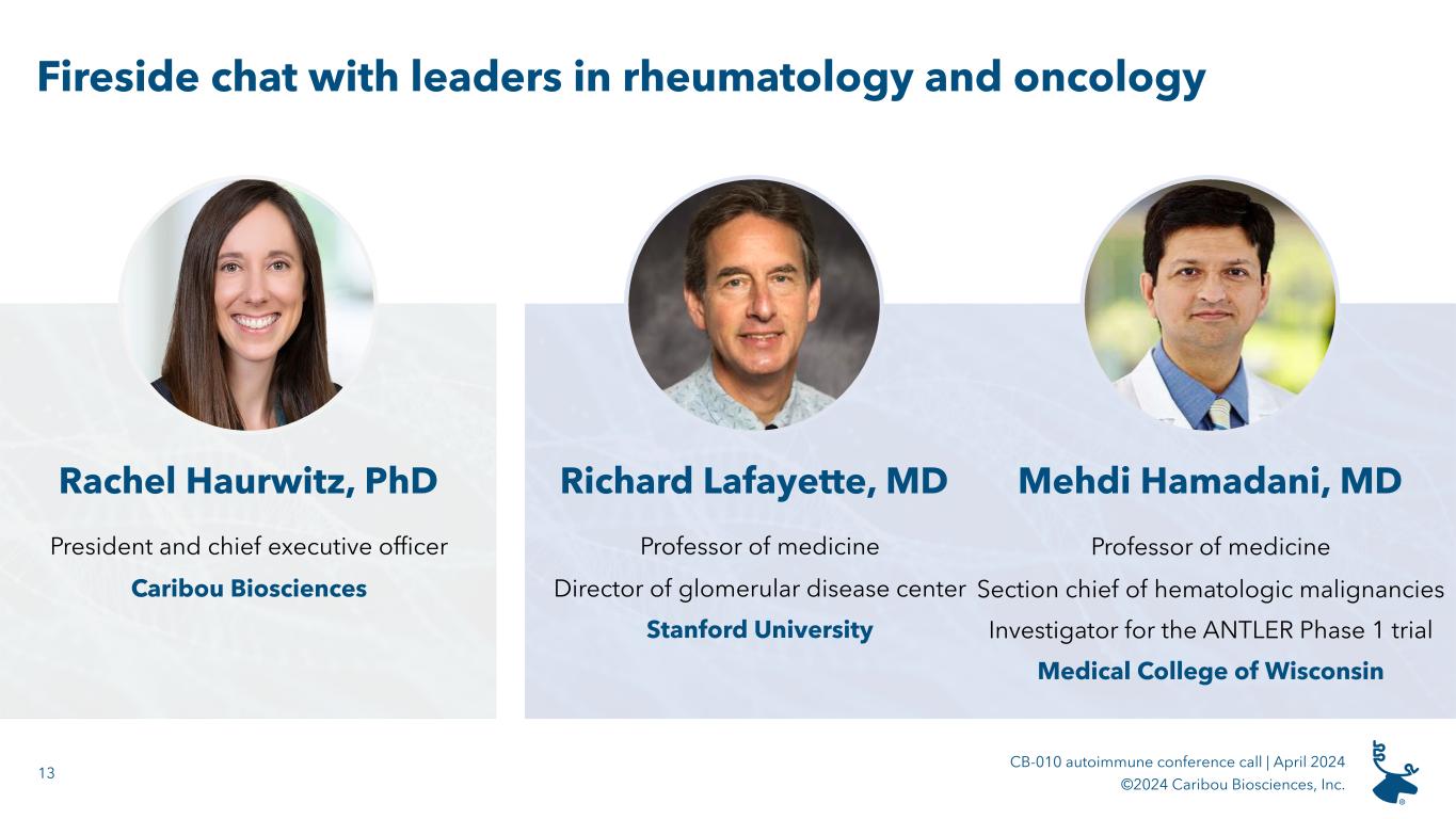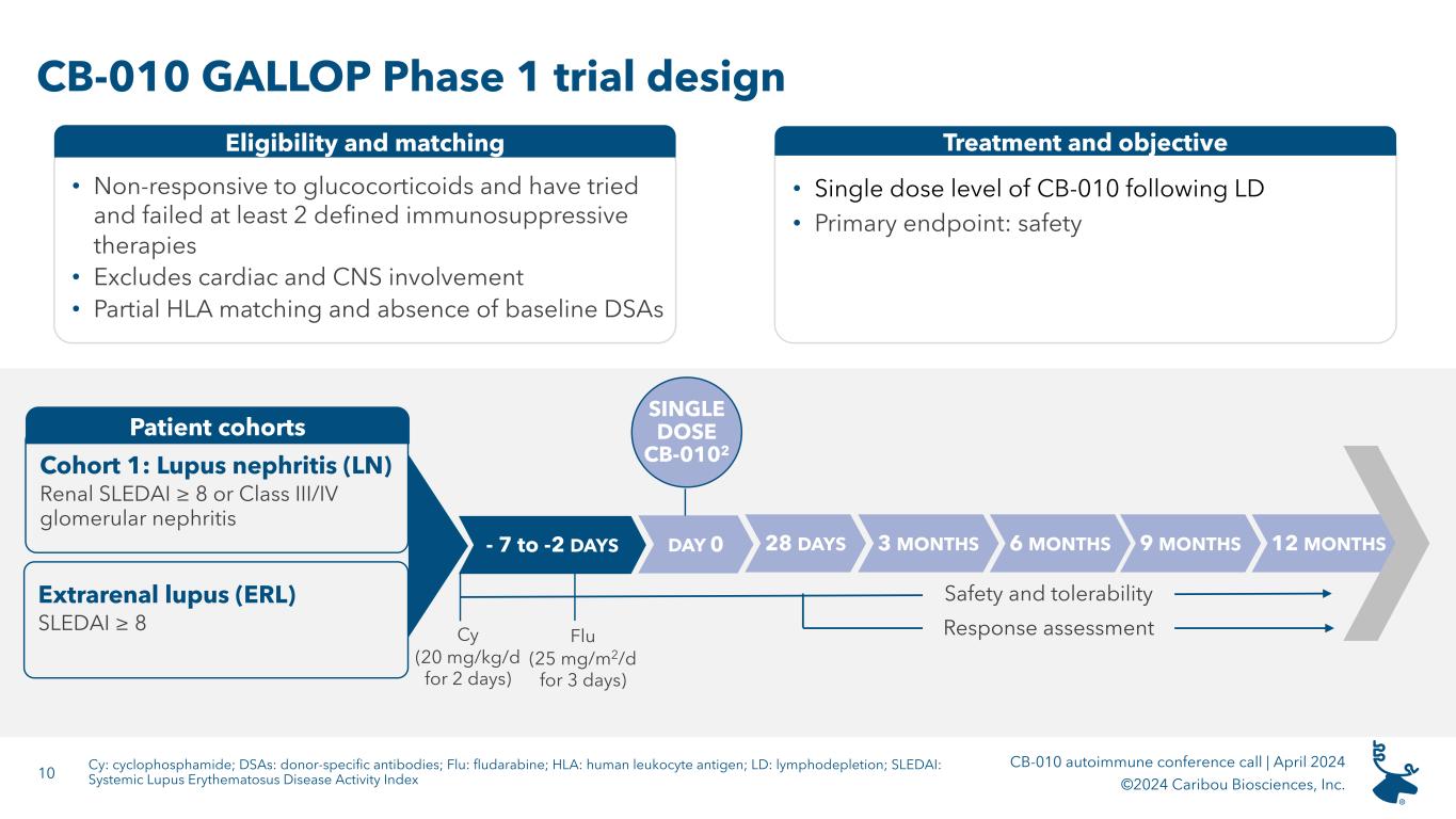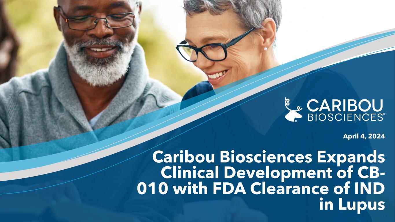 2 CB-010 autoimmune conference call | April 2024 ©2024 Caribou Biosciences, Inc. Forward-looking statements All statements in this presentation, other than statements of historical facts, are forward-looking statements, within the meaning of the Private Securities Litigation Reform Act of 1995. These forward-looking statements speak only as of the date of this presentation and are subject to a number of known and unknown risks, assumptions, uncertainties, and other factors that may cause the actual results, levels of activity, performance, or achievements of Caribou Biosciences, Inc. (the “Company,” “Caribou,” “we,” or “our”) to be materially different from those expressed or implied by any forward-looking statements. The words “may,” “will,” “should,” “expect,” “plan,” “anticipate,” “could,” “intend,” “target,” “project,” “contemplate,” “believe,” “estimate,” “predict,” “potential,” or “continue” or the negative of these terms or other similar expressions are intended to identify forward- looking statements, although not all forward-looking statements contain these identifying words. All statements, other than statements of historical facts contained in this presentation, are forward-looking statements, including but not limited to any statements regarding the initiation, timing, progress, strategy, plans, objectives, expectations (including as to the results) with respect to our product candidate preclinical studies, clinical trials, and research programs, including our expectations and timing regarding the release of dose expansion clinical data, and emerging translational data from our ongoing ANTLER phase 1 clinical trial for our CB-010 product candidate, disclosure of the recommended Phase 2 dose for CB-010, and an updated timeline for our planned phase 3 pivotal trial for CB-010 in second line LBCL patients; the status, progress, and expectations relating to the timing of release of clinical data from our ongoing CaMMouflage phase 1 clinical trial for our CB-011 product candidate; the status, progress, and expectations relating to the timing of release of clinical data from our ongoing AMpLify phase 1 clinical trial for our CB-012 product candidate; the timing for the initiation of our GALLOP phase 1 clinical trial for adults with lupus nephritis and extrarenal lupus; our ability to successfully develop our product candidates and to obtain and maintain regulatory approval for our product candidates; the number and type of diseases, indications, or applications we intend to pursue for our product candidates; the beneficial characteristics, safety, efficacy, therapeutic effects, and potential advantages of our product candidates; the expected timing or likelihood of regulatory filings and approval for our product candidates; our expected cash runway; and the sufficiency and anticipated use of our existing capital resources to fund our future operating expenses and capital expenditure requirements and needs for additional financing. You are cautioned not to place undue reliance on these forward-looking statements, which speak only as of the date this presentation is given. This presentation discusses product candidates that are or will be under clinical investigation and that have not yet been approved for marketing by the U.S. Food and Drug Administration. No representation is made as to the safety or effectiveness of these product candidates for the therapeutic uses for which such product candidates are being or will be studied. As a result of many factors, including risks related to our limited operating history, history of net operating losses, financial position and our ability to raise additional capital as needed to fund our operations and product candidate development; uncertainties related to the initiation, cost, timing, and progress, and results of our current and future research and development programs, preclinical studies, and clinical trials; risks that initial or interim clinical trial data will not ultimately be predictive of the safety and efficacy of our product candidates or that clinical outcomes may differ as more clinical data becomes available; the risk that preclinical study results we observed will not be borne out in human patients; our ability to obtain and maintain regulatory approval for our product candidates; risks that our product candidates, if approved, may not gain market acceptance due to negative public opinion and increased regulatory scrutiny of cell therapies involving genome editing; our ability to meet future regulatory standards with respect to our products; our ability to obtain key regulatory input and approvals, our ability to establish and/or maintain intellectual property rights covering our product candidates and genome-editing technology; risks of third parties asserting that our product candidates infringe their patents; developments related to our competitors and our industry; our reliance on third parties to conduct our clinical trials and manufacture our product candidates; the impact of public health crises and geopolitical events on our business and operations; and other risks described in greater detail in our filings with the Securities and Exchange Commission (the “SEC”), including the section titled “Risk Factors” of our Annual Report on Form 10-K for the year ended December 31, 2023, and other filings we make with the SEC; the events and circumstances reflected in our forward-looking statements may not be achieved or may not occur, and actual results could differ materially from those described in or implied by the forward-looking statements contained in this presentation. Caution should be exercised when interpreting results from separate trials involving separate product candidates. The results of other CAR-T cell therapies presented or referenced in these slides have been derived from publicly available reports of clinical trials no