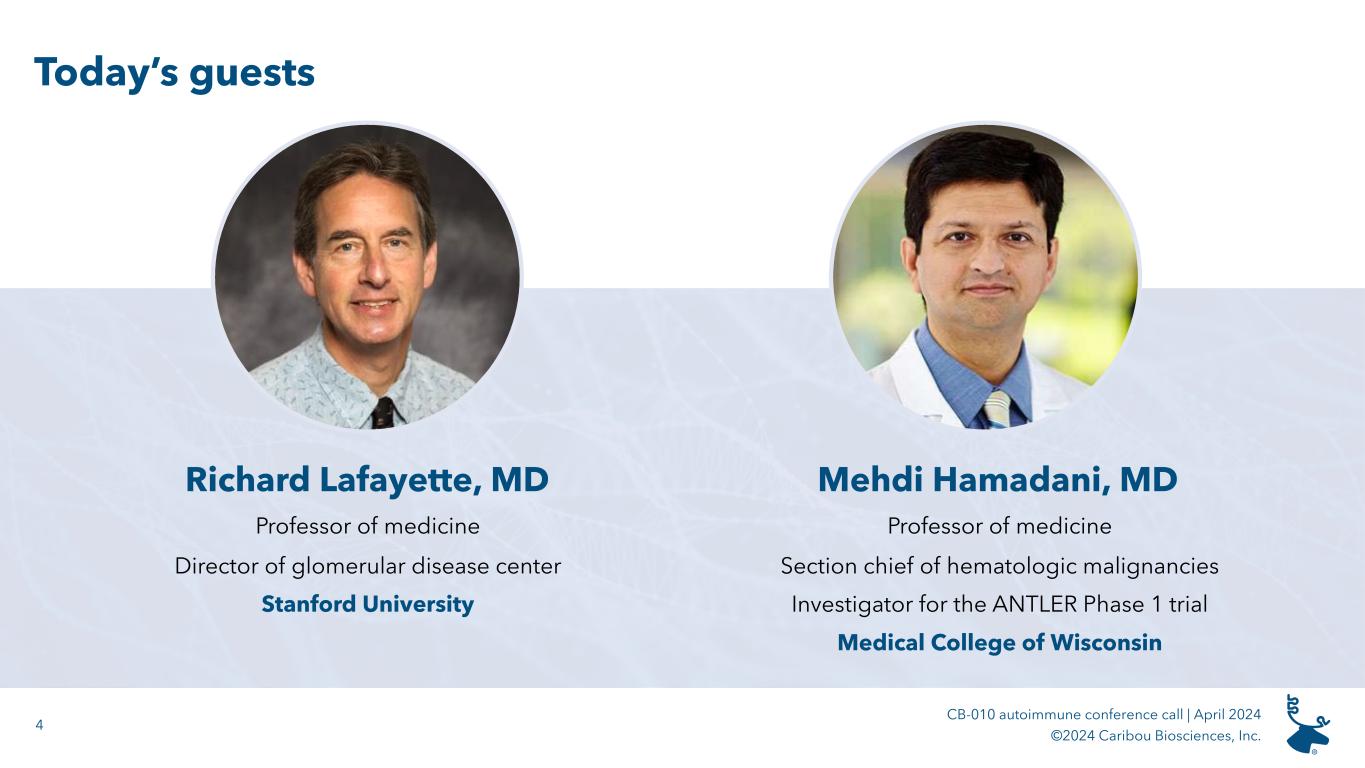3 CB-010 autoimmune conference call | April 2024 ©2024 Caribou Biosciences, Inc. ”Lupus is a complex, chronic, heterogeneous autoimmune disease impacting millions of people worldwide, often causing debilitating outcomes. There is a pressing need for more innovative therapies that address the underlying causes of lupus while minimizing symptoms and effects of this systemic disease.” Stacie Bell, PhD Executive vice president, Lupus Therapeutics, an affiliate of the Lupus Research Alliance Caribou’s partners in lupus