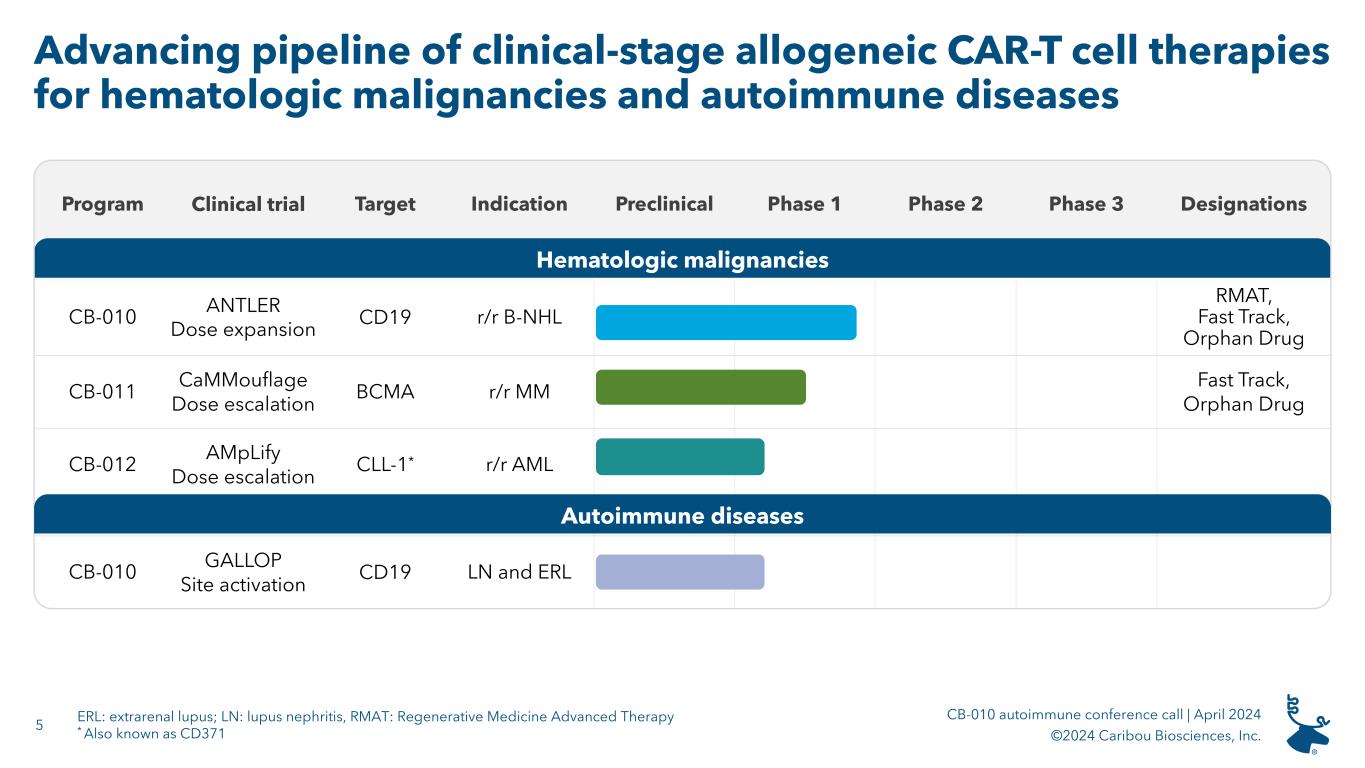 4 CB-010 autoimmune conference call | April 2024 ©2024 Caribou Biosciences, Inc. Today’s guests Professor of medicine Director of glomerular disease center Stanford University Richard Lafayette, MD Professor of medicine Section chief of hematologic malignancies Investigator for the ANTLER Phase 1 trial Medical College of Wisconsin Mehdi Hamadani, MD