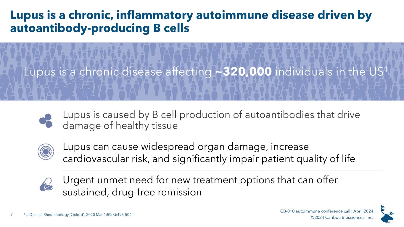 6 CB-010 autoimmune conference call | April 2024 ©2024 Caribou Biosciences, Inc. Allogeneic anti-CD19 CAR-T cell therapy with a PD-1 knockout for lupus CB-010