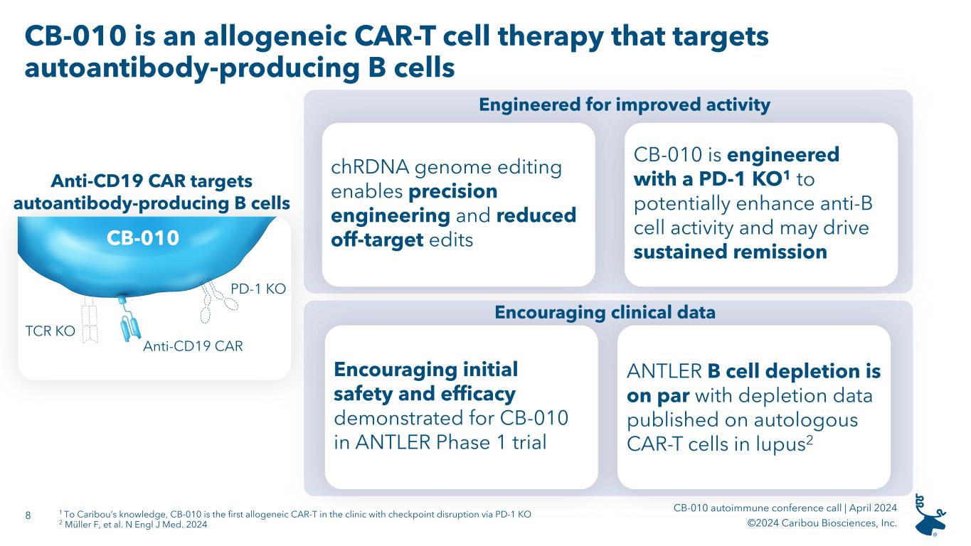 7 CB-010 autoimmune conference call | April 2024 ©2024 Caribou Biosciences, Inc. Lupus is a chronic, inflammatory autoimmune disease driven by autoantibody-producing B cells Lupus can cause widespread organ damage, increase cardiovascular risk, and significantly impair patient quality of life 1 Li D, et al. Rheumatology (Oxford). 2020 Mar 1;59(3):495-504. Lupus is caused by B cell production of autoantibodies that drive damage of healthy tissue Urgent unmet need for new treatment options that can offer sustained, drug-free remission Lupus is a chronic disease affecting ~320,000 individuals in the US1
