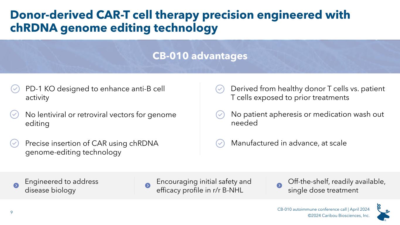 8 CB-010 autoimmune conference call | April 2024 ©2024 Caribou Biosciences, Inc. CB-010 is an allogeneic CAR-T cell therapy that targets autoantibody-producing B cells 1 To Caribou’s knowledge, CB-010 is the first allogeneic CAR-T in the clinic with checkpoint disruption via PD-1 KO 2 Müller F, et al. N Engl J Med. 2024 CB-010 is engineered with a PD-1 KO1 to potentially enhance anti-B cell activity and may drive sustained remission chRDNA genome editing enables precision engineering and reduced off-target edits Encouraging initial safety and efficacy demonstrated for CB-010 in ANTLER Phase 1 trial ANTLER B cell depletion is on par with depletion data published on autologous CAR-T cells in lupus2 CB-010 TCR KO Anti-CD19 CAR PD-1 KO Anti-CD19 CAR targets autoantibody-producing B cells Engineered for improved activity Encouraging clinical data