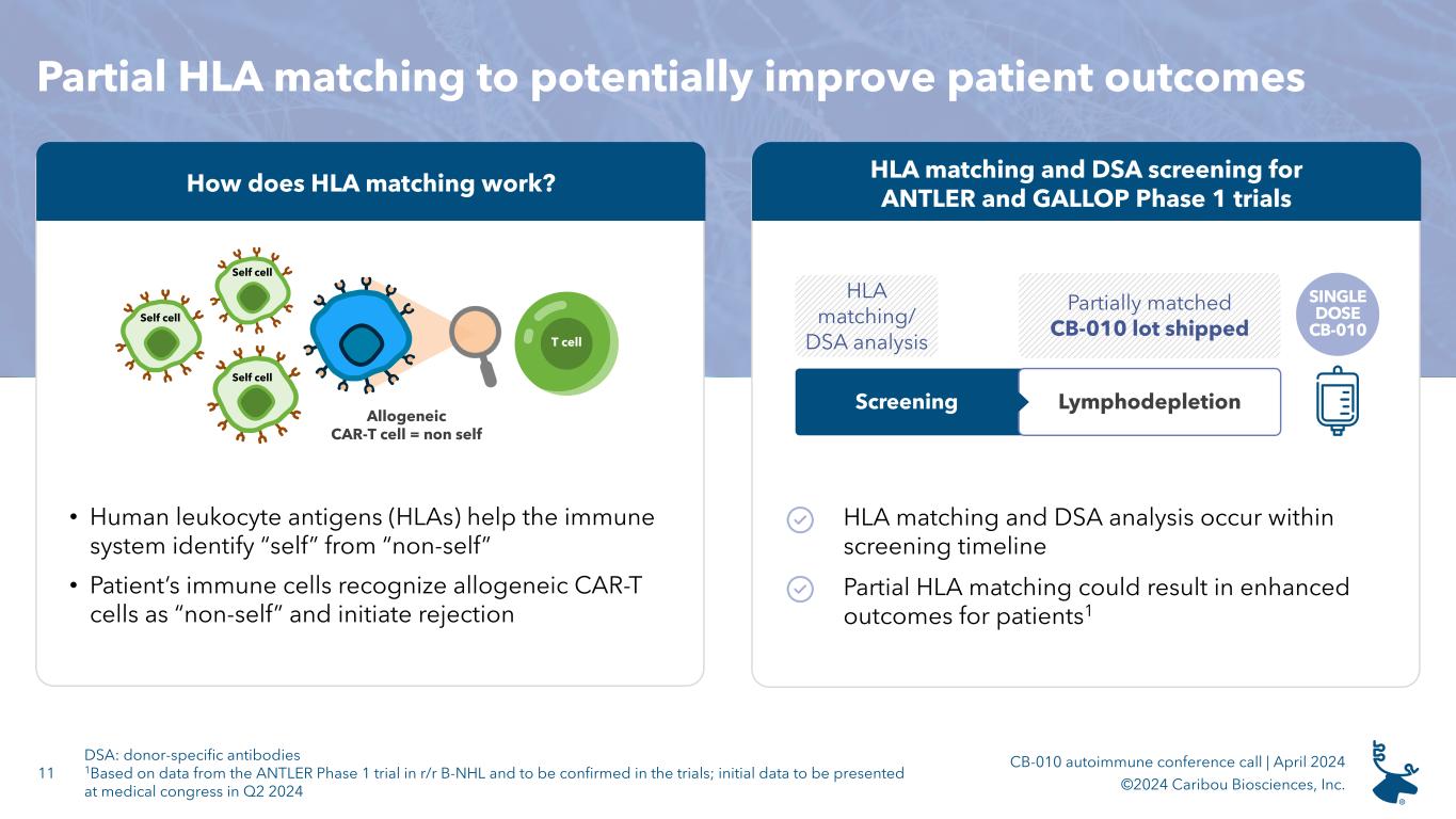 10 CB-010 autoimmune conference call | April 2024 ©2024 Caribou Biosciences, Inc. CB-010 GALLOP Phase 1 trial design v • Non-responsive to glucocorticoids and have tried and failed at least 2 defined immunosuppressive therapies • Excludes cardiac and CNS involvement • Partial HLA matching and absence of baseline DSAs SINGLE DOSE CB-0102 Cy (20 mg/kg/d for 2 days) Cy: cyclophosphamide; DSAs: donor-specific antibodies; Flu: fludarabine; HLA: human leukocyte antigen; LD: lymphodepletion; SLEDAI: Systemic Lupus Erythematosus Disease Activity Index • Single dose level of CB-010 following LD DAY 0 28 DAYS 3 MONTHS 6 MONTHS 9 MONTHS 12 MONTHS- 7 to -2 DAYS Safety and tolerability Response assessment Treatment and objective • Primary endpoint: safety Eligibility and matching Cohort 1: Lupus nephritis (LN) Renal SLEDAI ≥ 8 or Class III/IV glomerular nephritis Extrarenal lupus (ERL) SLEDAI ≥ 8 Patient cohorts Flu (25 mg/m2/d for 3 days)
