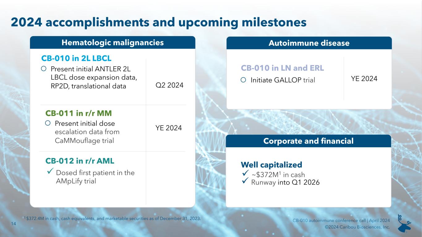 13 CB-010 autoimmune conference call | April 2024 ©2024 Caribou Biosciences, Inc. Fireside chat with leaders in rheumatology and oncology Professor of medicine Director of glomerular disease center Stanford University Richard Lafayette, MD Professor of medicine Section chief of hematologic malignancies Investigator for the ANTLER Phase 1 trial Medical College of Wisconsin Mehdi Hamadani, MD President and chief executive officer Caribou Biosciences Rachel Haurwitz, PhD