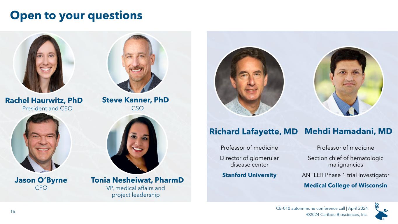 14 CB-010 autoimmune conference call | April 2024 ©2024 Caribou Biosciences, Inc. 2024 accomplishments and upcoming milestones 1 $372.4M in cash, cash equivalents, and marketable securities as of December 31, 2023. Hematologic malignancies CB-010 in 2L LBCL Present initial ANTLER 2L LBCL dose expansion data, RP2D, translational data CB-011 in r/r MM Present initial dose escalation data from CaMMouflage trial CB-012 in r/r AML ü Dosed first patient in the AMpLify trial Q2 2024 YE 2024 Autoimmune disease CB-010 in LN and ERL Initiate GALLOP trial YE 2024 Corporate and financial Well capitalized ü ~$372M1 in cash ü Runway into Q1 2026