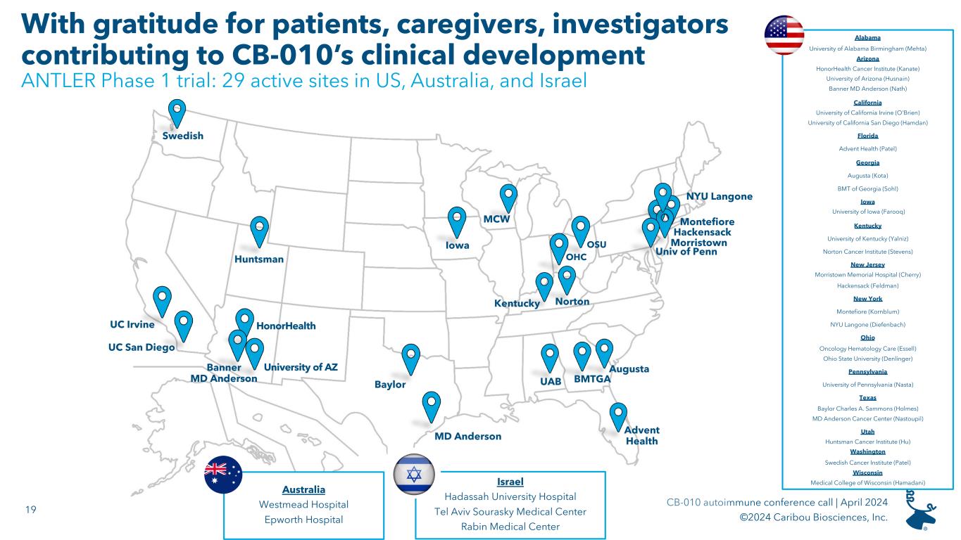 19 CB-010 autoimmune conference call | April 2024 ©2024 Caribou Biosciences, Inc. With gratitude for patients, caregivers, investigators contributing to CB-010’s clinical development ANTLER Phase 1 trial: 29 active sites in US, Australia, and Israel Alabama University of Alabama Birmingham (Mehta) Arizona HonorHealth Cancer Institute (Kanate) University of Arizona (Husnain) Banner MD Anderson (Nath) California University of California Irvine (O'Brien) University of California San Diego (Hamdan) Florida Advent Health (Patel) Georgia Augusta (Kota) BMT of Georgia (Sohl) Iowa University of Iowa (Farooq) Kentucky University of Kentucky (Yalniz) Norton Cancer Institute (Stevens) New Jersey Morristown Memorial Hospital (Cherry) Hackensack (Feldman) New York Montefiore (Kornblum) NYU Langone (Diefenbach) Ohio Oncology Hematology Care (Essell) Ohio State University (Denlinger) Pennsylvania University of Pennsylvania (Nasta) Texas Baylor Charles A. Sammons (Holmes) MD Anderson Cancer Center (Nastoupil) Utah Huntsman Cancer Institute (Hu) Washington Swedish Cancer Institute (Patel) Wisconsin Medical College of Wisconsin (Hamadani) UC Irvine UC San Diego HonorHealth Huntsman Baylor MD Anderson OHC OSU MorristownIowa University of AZ Augusta UAB Kentucky MCW BMTGA Montefiore Advent Health Norton Hackensack Swedish Israel Hadassah University Hospital Tel Aviv Sourasky Medical Center Rabin Medical Center Univ of Penn NYU Langone Australia Westmead Hospital Epworth Hospital Banner MD Anderson