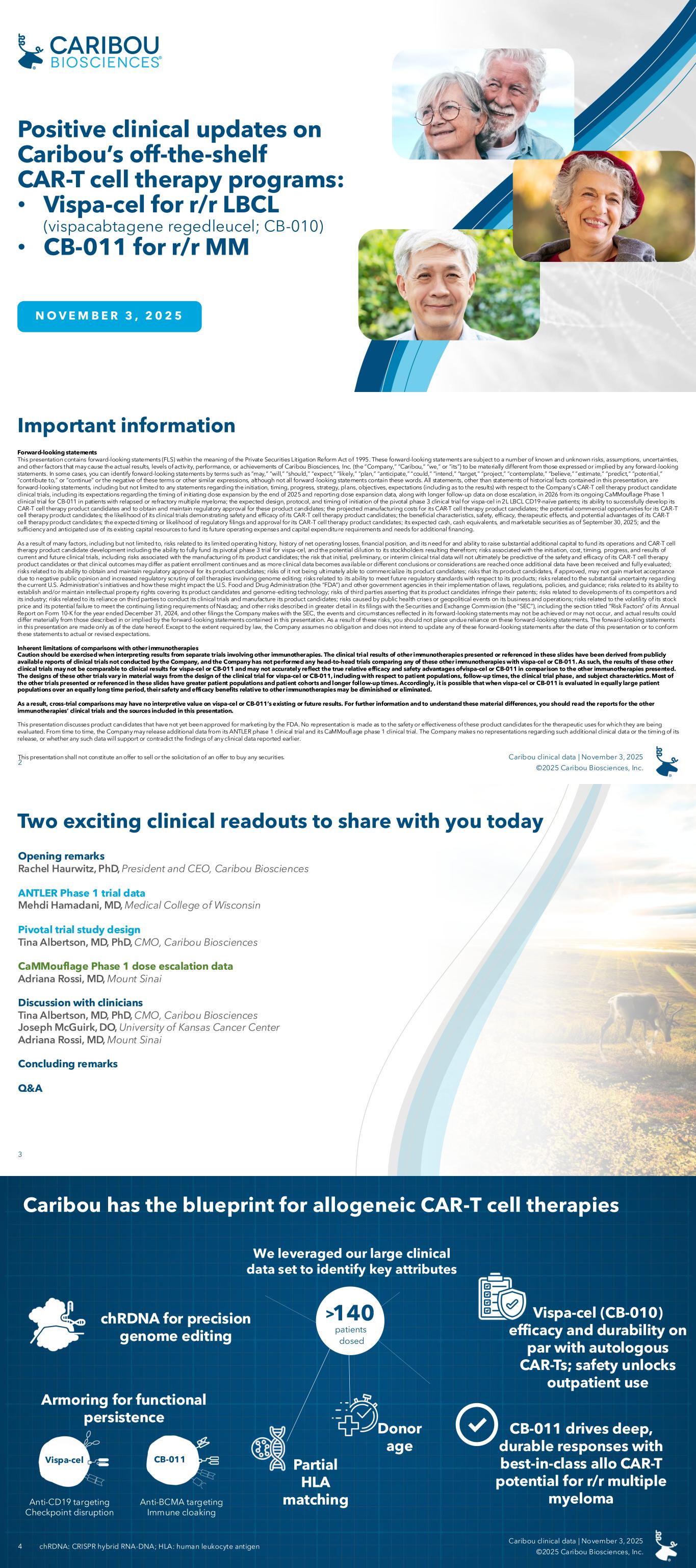 N O V E M B E R 3 , 2 0 2 5 Positive clinical updates on Caribou’s off-the-shelf CAR-T cell therapy programs: • Vispa-cel for r/r LBCL (vispacabtagene regedleucel; CB-010) • CB-011 for r/r MM 2 Caribou clinical data | November 3, 2025 ©2025 Caribou Biosciences, Inc. Important information Forward-looking statements This presentation contains forward-looking statements (FLS) within the meaning of the Private Securities Litigation Reform Act of 1995. These forward-looking statements are subject to a number of known and unknown risks, assumptions, uncertainties, and other factors that may cause the actual results, levels of activity, performance, or achievements of Caribou Biosciences, Inc. (the “Company,” “Caribou,” “we,” or “its”) to be materially different from those expressed or implied by any forward-looking statements. In some cases, you can identify forward-looking statements by terms such as “may,” “will,” “should,” “expect,” “likely,” “plan,” “anticipate,” “could,” “intend,” “target,” “project,” “contemplate,” “believe,” “estimate,” “predict,” “potential,” “contribute to,” or “continue” or the negative of these terms or other similar expressions, although not all forward-looking statements contain these words. All statements, other than statements of historical facts contained in this presentation, are forward-looking statements, including but not limited to any statements regarding the initiation, timing, progress, strategy, plans, objectives, expectations (including as to the results) with respect to the Company’s CAR-T cell therapy product candidate clinical trials, including its expectations regarding the timing of initiating dose expansion by the end of 2025 and reporting dose expansion data, along with longer follow-up data on dose escalation, in 2026 from its ongoing CaMMouflage Phase 1 clinical trial for CB-011 in patients with relapsed or refractory multiple myeloma; the expected design, protocol, and timing of initiation of the pivotal phase 3 clinical trial for vispa-cel in 2L LBCL CD19-naïve patients; its ability to successfully develop its CAR-T cell therapy product candidates and to obtain and maintain regulatory approval for these product candidates; the projected manufacturing costs for its CAR-T cell therapy product candidates; the potential commercial opportunities for its CAR-T cell therapy product candidates; the likelihood of its clinical trials demonstrating safety and efficacy of its CAR-T cell therapy product candidates; the beneficial characteristics, safety, efficacy, therapeutic effects, and potential advantages of its CAR-T cell therapy product candidates; the expected timing or likelihood of regulatory filings and approval for its CAR-T cell therapy product candidates; its expected cash, cash equivalents, and marketable securities as of September 30, 2025; and the sufficiency and anticipated use of its existing capital resources to fund its future operating expenses and capital expenditure requirements and needs for additional financing. As a result of many factors, including but not limited to, risks related to its limited operating history, history of net operating losses, financial position, and its need for and ability to raise substantial additional capital to fund its operations and CAR-T cell therapy product candidate development including the ability to fully fund its pivotal phase 3 trial for vispa-cel, and the potential dilution to its stockholders resulting therefrom; risks associated with the initiation, cost, timing, progress, and results of current and future clinical trials, including risks associated with the manufacturing of its product candidates; the risk that initial, preliminary, or interim clinical trial data will not ultimately be predictive of the safety and efficacy of its CAR-T cell therapy product candidates or that clinical outcomes may differ as patient enrollment continues and as more clinical data becomes available or different conclusions or considerations are reached once additional data have been received and fully evaluated; risks related to its ability to obtain and maintain regulatory approval for its product candidates; risks of it not being ult imately able to commercialize its product candidates; risks that its product candidates, if approved, may not gain market acceptance due to negative public opinion and increased regulatory scrutiny of cell therapies involving genome editing; risks related to its ability to meet future regulatory standards with respect to its products; risks related to the substantial uncertainty regarding the current U.S. Administration’s initiatives and how these might impact the U.S. Food and Drug Administration (the “FDA”) and other government agencies in their implementation of laws, regulations, policies, and guidance; risks related to its ability to establish and/or maintain intellectual property rights covering its product candidates and genome-editing technology; risks of third parties asserting that its product candidates infringe their patents; risks related to developments of its competitors and its industry; risks related to its reliance on third parties to conduct its clinical trials and manufacture its product candidates; risks caused by public health crises or geopolitical events on its business and operations; risks related to the volatili ty of its stock price and its potential failure to meet the continuing listing requirements of Nasdaq; and other risks described in greater detail in its filings with the Securities and Exchange Commission (the “SEC”), including the section titled “Risk Factors” of its Annual Report on Form 10-K for the year ended December 31, 2024, and other filings the Company makes with the SEC, the events and circumstances reflected in its forward-looking statements may not be achieved or may not occur, and actual results could differ materiall