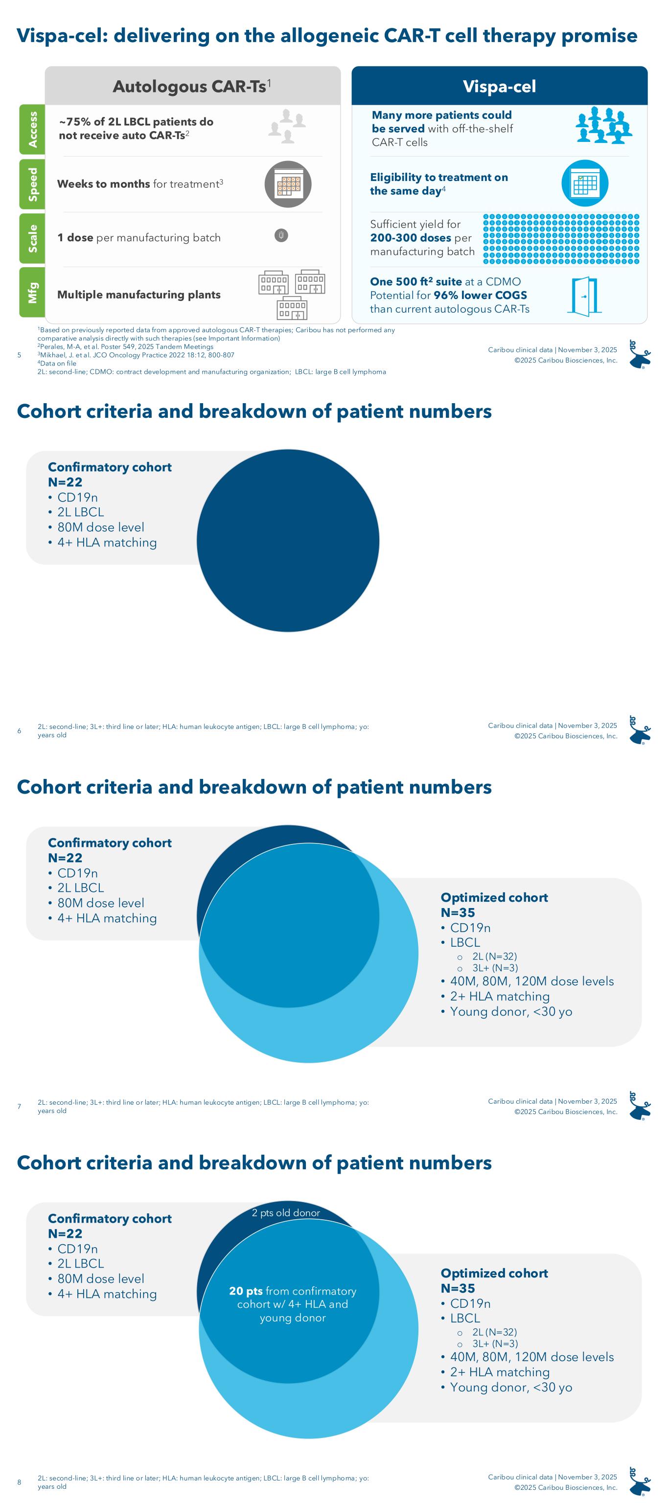 5 Caribou clinical data | November 3, 2025 ©2025 Caribou Biosciences, Inc. Vispa-cel: delivering on the allogeneic CAR-T cell therapy promise 1Based on previously reported data from approved autologous CAR-T therapies; Caribou has not performed any comparative analysis directly with such therapies (see Important Information) 2Perales, M-A, et al. Poster 549, 2025 Tandem Meetings 3Mikhael, J. et al. JCO Oncology Practice 2022 18:12, 800-807 4Data on file 2L: second-line; CDMO: contract development and manufacturing organization; LBCL: large B cell lymphoma Autologous CAR-Ts1 1 dose per manufacturing batch Weeks to months for treatment3 Vispa-cel ~75% of 2L LBCL patients do not receive auto CAR-Ts2 A cc e ss S p e e d S ca le Sufficient yield for 200-300 doses per manufacturing batch Eligibility to treatment on the same day4 Many more patients could be served with off-the-shelf CAR-T cells M fg Multiple manufacturing plants One 500 ft2 suite at a CDMO Potential for 96% lower COGS than current autologous CAR-Ts 6 Caribou clinical data | November 3, 2025 ©2025 Caribou Biosciences, Inc. Cohort criteria and breakdown of patient numbers 2L: second-line; 3L+: third line or later; HLA: human leukocyte antigen; LBCL: large B cell lymphoma; yo: years old Confirmatory cohort N=22 • CD19n • 2L LBCL • 80M dose level • 4+ HLA matching 7 Caribou clinical data | November 3, 2025 ©2025 Caribou Biosciences, Inc. Cohort criteria and breakdown of patient numbers 2L: second-line; 3L+: third line or later; HLA: human leukocyte antigen; LBCL: large B cell lymphoma; yo: years old Confirmatory cohort N=22 • CD19n • 2L LBCL • 80M dose level • 4+ HLA matching Optimized cohort N=35 • CD19n • LBCL o 2L (N=32) o 3L+ (N=3) • 40M, 80M, 120M dose levels • 2+ HLA matching • Young donor, <30 yo 8 Caribou clinical data | November 3, 2025 ©2025 Caribou Biosciences, Inc. Cohort criteria and breakdown of patient numbers 2L: second-line; 3L+: third line or later; HLA: human leukocyte antigen; LBCL: large B cell lymphoma; yo: years old Confirmatory cohort N=22 • CD19n • 2L LBCL • 80M dose level • 4+ HLA matching Optimized cohort N=35 • CD19n • LBCL o 2L (N=32) o 3L+ (N=3) • 40M, 80M, 120M dose levels • 2+ HLA matching • Young donor, <30 yo 20 pts from confirmatory cohort w/ 4+ HLA and young donor 2 pts old donor