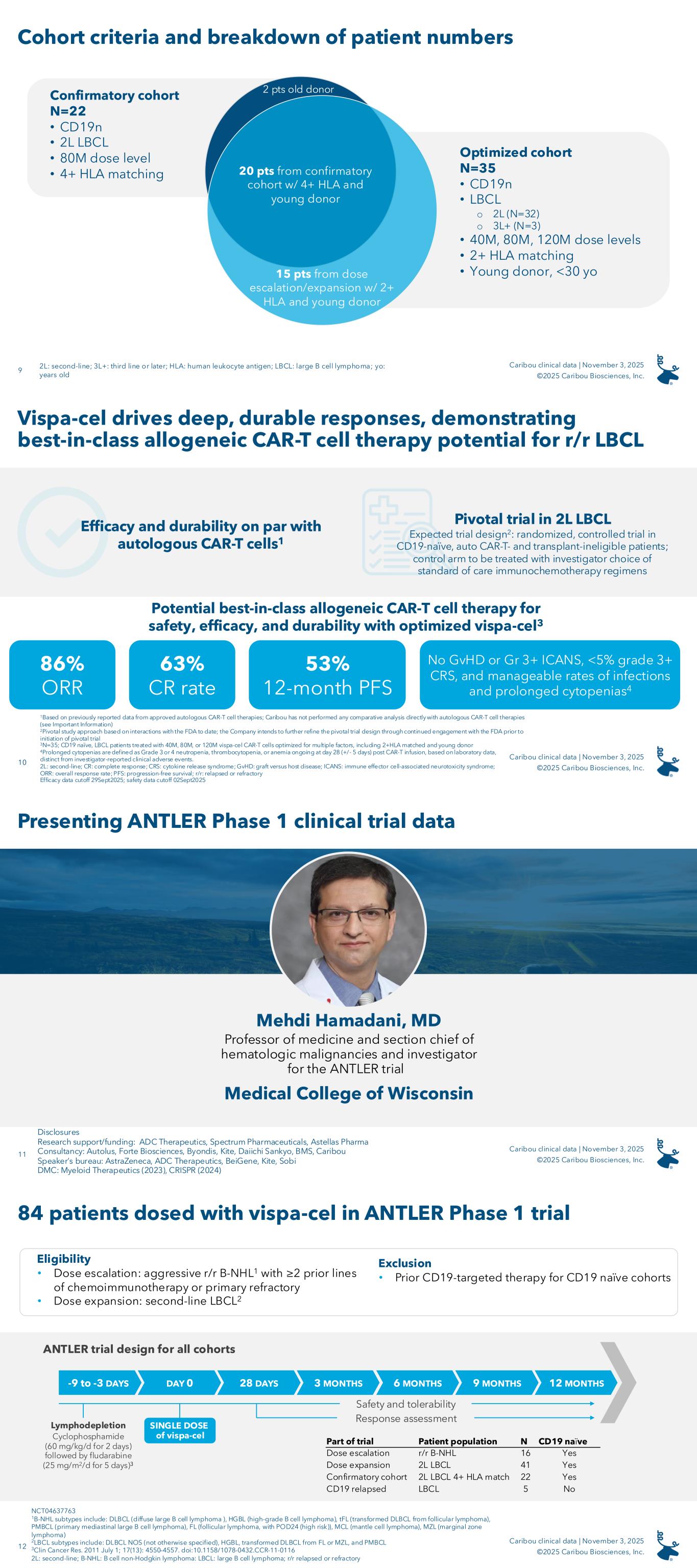 9 Caribou clinical data | November 3, 2025 ©2025 Caribou Biosciences, Inc. Cohort criteria and breakdown of patient numbers 2L: second-line; 3L+: third line or later; HLA: human leukocyte antigen; LBCL: large B cell lymphoma; yo: years old Confirmatory cohort N=22 • CD19n • 2L LBCL • 80M dose level • 4+ HLA matching Optimized cohort N=35 • CD19n • LBCL o 2L (N=32) o 3L+ (N=3) • 40M, 80M, 120M dose levels • 2+ HLA matching • Young donor, <30 yo 20 pts from confirmatory cohort w/ 4+ HLA and young donor 15 pts from dose escalation/expansion w/ 2+ HLA and young donor 2 pts old donor 10 Caribou clinical data | November 3, 2025 ©2025 Caribou Biosciences, Inc. Vispa-cel drives deep, durable responses, demonstrating best-in-class allogeneic CAR-T cell therapy potential for r/r LBCL 86% ORR 53% 12-month PFS 63% CR rate No GvHD or Gr 3+ ICANS, <5% grade 3+ CRS, and manageable rates of infections and prolonged cytopenias4 Efficacy and durability on par with autologous CAR-T cells1 Potential best-in-class allogeneic CAR-T cell therapy for safety, efficacy, and durability with optimized vispa-cel3 Pivotal trial in 2L LBCL Expected trial design2: randomized, controlled trial in CD19-naïve, auto CAR-T- and transplant-ineligible patients; control arm to be treated with investigator choice of standard of care immunochemotherapy regimens 1Based on previously reported data from approved autologous CAR-T cell therapies; Caribou has not performed any comparative analysis directly with autologous CAR-T cell therapies (see Important Information) 2Pivotal study approach based on interactions with the FDA to date; the Company intends to further refine the pivotal trial design through continued engagement with the FDA prior to initiation of pivotal trial 3N=35; CD19 naïve, LBCL patients treated with 40M, 80M, or 120M vispa-cel CAR-T cells optimized for multiple factors, including 2+HLA matched and young donor 4Prolonged cytopenias are defined as Grade 3 or 4 neutropenia, thrombocytopenia, or anemia ongoing at day 28 (+/- 5 days) post CAR-T infusion, based on laboratory data, distinct from investigator-reported clinical adverse events. 2L: second-line; CR: complete response; CRS: cytokine release syndrome; GvHD: graft versus host disease; ICANS: immune effector cell-associated neurotoxicity syndrome; ORR: overall response rate; PFS: progression-free survival; r/r: relapsed or refractory Efficacy data cutoff 29Sept2025; safety data cutoff 02Sept2025 11 Caribou clinical data | November 3, 2025 ©2025 Caribou Biosciences, Inc. Presenting ANTLER Phase 1 clinical trial data Disclosures Research support/funding: ADC Therapeutics, Spectrum Pharmaceuticals, Astellas Pharma Consultancy: Autolus, Forte Biosciences, Byondis, Kite, Daiichi Sankyo, BMS, Caribou Speaker’s bureau: AstraZeneca, ADC Therapeutics, BeiGene, Kite, Sobi DMC: Myeloid Therapeutics (2023), CRISPR (2024) Professor of medicine and section chief of hematologic malignancies and investigator for the ANTLER trial Medical College of Wisconsin Mehdi Hamadani, MD 12 Caribou clinical data | November 3, 2025 ©2025 Caribou Biosciences, Inc. 84 patients dosed with vispa-cel in ANTLER Phase 1 trial -9 to -3 DAYS DAY 0 28 DAYS 3 MONTHS 6 MONTHS 9 MONTHS 12 MONTHS Lymphodepletion Safety and tolerability Response assessment Cyclophosphamide (60 mg/kg/d for 2 days) followed by fludarabine (25 mg/m2/d for 5 days)3 SINGLE DOSE of vispa-cel NCT04637763 1B-NHL subtypes include: DLBCL (diffuse large B cell lymphoma ), HGBL (high-grade B cell lymphoma), tFL (transformed DLBCL from follicular lymphoma), PMBCL (primary mediastinal large B cell lymphoma), FL (follicular lymphoma, with POD24 (high risk)), MCL (mantle cell lymphoma), MZL (marginal zone lymphoma) 2LBCL subtypes include: DLBCL NOS (not otherwise specified), HGBL, transformed DLBCL from FL or MZL, and PMBCL 3Clin Cancer Res. 2011 July 1; 17(13): 4550–4557. doi:10.1158/1078-0432.CCR-11-0116 2L: second-line; B-NHL: B cell non-Hodgkin lymphoma: LBCL: large B cell lymphoma; r/r relapsed or refractory ANTLER trial design for all cohorts Eligibility • Dose escalation: aggressive r/r B-NHL1 with ≥2 prior lines of chemoimmunotherapy or primary refractory • Dose expansion: second-line LBCL2 Exclusion • Prior CD19-targeted therapy for CD19 naïve cohorts Part of trial Patient population N CD19 naïve Dose escalation r/r B-NHL 16 Yes Dose expansion 2L LBCL 41 Yes Confirmatory cohort 2L LBCL 4+ HLA match 22 Yes CD19 relapsed LBCL 5 No