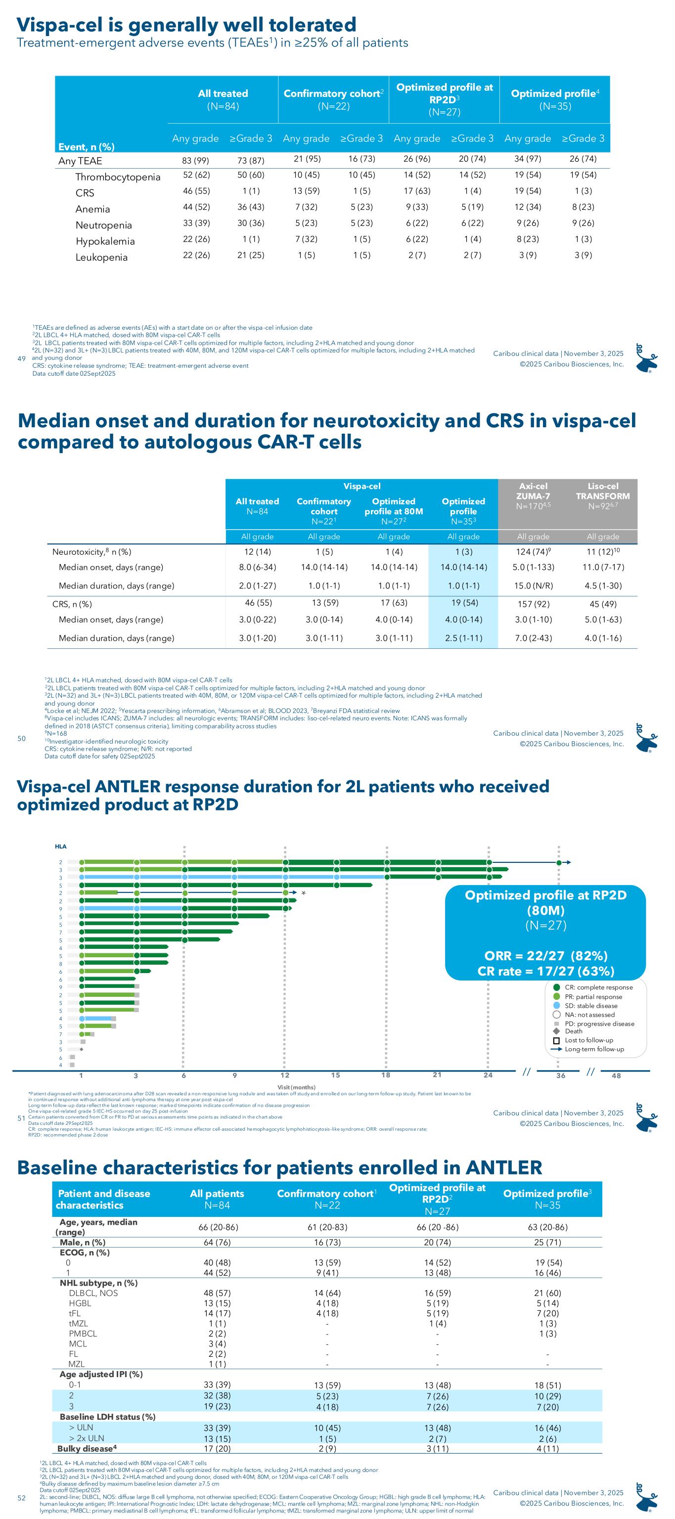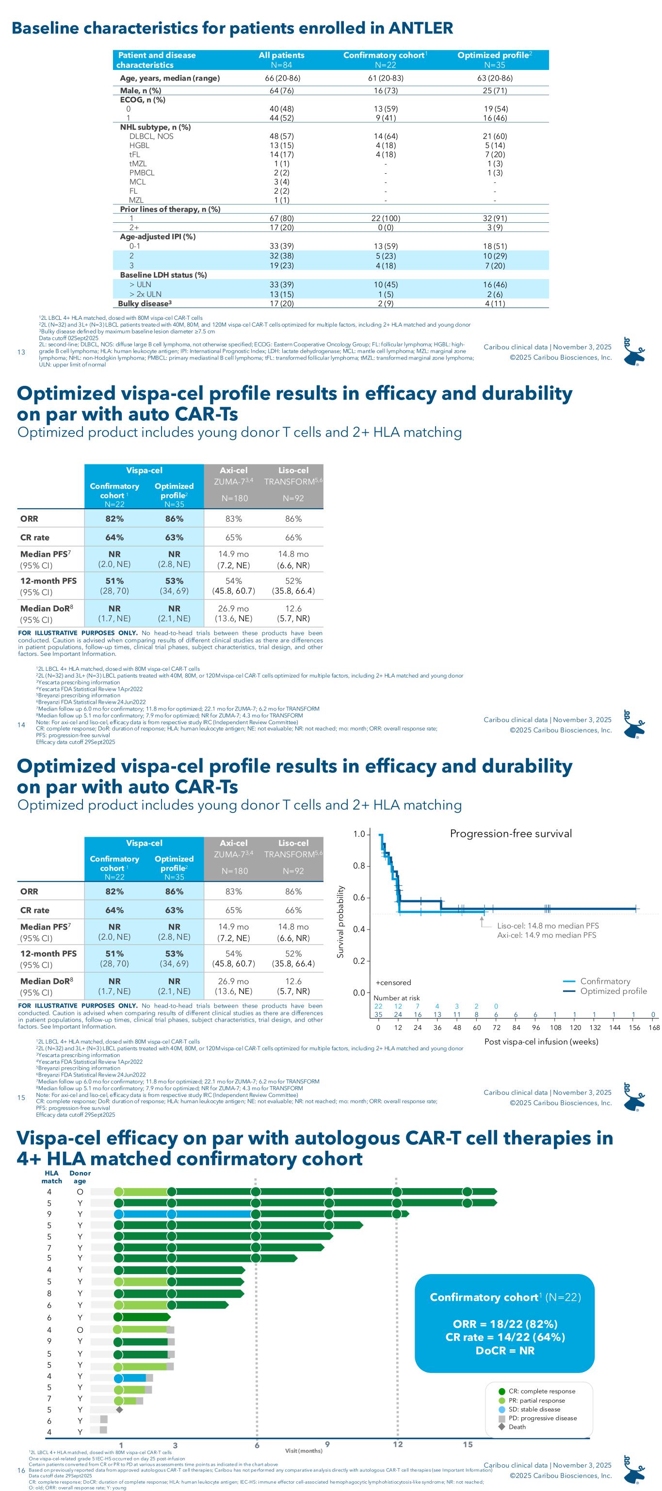 13 Caribou clinical data | November 3, 2025 ©2025 Caribou Biosciences, Inc. Baseline characteristics for patients enrolled in ANTLER Patient and disease characteristics All patients N=84 Confirmatory cohort1 N=22 Optimized profile2 N=35 Age, years, median (range) 66 (20-86) 61 (20-83) 63 (20-86) Male, n (%) 64 (76) 16 (73) 25 (71) ECOG, n (%) 0 40 (48) 13 (59) 19 (54) 1 44 (52) 9 (41) 16 (46) NHL subtype, n (%) DLBCL, NOS 48 (57) 14 (64) 21 (60) HGBL 13 (15) 4 (18) 5 (14) tFL 14 (17) 4 (18) 7 (20) tMZL 1 (1) - 1 (3) PMBCL 2 (2) - 1 (3) MCL 3 (4) - - FL 2 (2) - - MZL 1 (1) - - Prior lines of therapy, n (%) 1 67 (80) 22 (100) 32 (91) 2+ 17 (20) 0 (0) 3 (9) Age-adjusted IPI (%) 0-1 33 (39) 13 (59) 18 (51) 2 32 (38) 5 (23) 10 (29) 3 19 (23) 4 (18) 7 (20) Baseline LDH status (%) > ULN 33 (39) 10 (45) 16 (46) > 2x ULN 13 (15) 1 (5) 2 (6) Bulky disease3 17 (20) 2 (9) 4 (11) 12L LBCL 4+ HLA matched, dosed with 80M vispa-cel CAR-T cells 22L (N=32) and 3L+ (N=3) LBCL patients treated with 40M, 80M, and 120M vispa-cel CAR-T cells optimized for multiple factors, including 2+ HLA matched and young donor 3Bulky disease defined by maximum baseline lesion diameter ≥7.5 cm Data cutoff 02Sept2025 2L: second-line; DLBCL, NOS: diffuse large B cell lymphoma, not otherwise specified; ECOG: Eastern Cooperative Oncology Group; FL: follicular lymphoma; HGBL: high- grade B cell lymphoma; HLA: human leukocyte antigen; IPI: International Prognostic Index; LDH: lactate dehydrogenase; MCL: mantle cell lymphoma; MZL: marginal zone lymphoma; NHL: non-Hodgkin lymphoma; PMBCL: primary mediastinal B cell lymphoma; tFL: transformed follicular lymphoma; tMZL: transformed marginal zone lymphoma; ULN: upper limit of normal 14 Caribou clinical data | November 3, 2025 ©2025 Caribou Biosciences, Inc. Optimized vispa-cel profile results in efficacy and durability on par with auto CAR-Ts Optimized product includes young donor T cells and 2+ HLA matching Vispa-cel Axi-cel ZUMA-73,4 N=180 Liso-cel TRANSFORM5,6 N=92 Confirmatory cohort 1 N=22 Optimized profile2 N=35 ORR 82% 86% 83% 86% CR rate 64% 63% 65% 66% Median PFS7 (95% CI) NR (2.0, NE) NR (2.8, NE) 14.9 mo (7.2, NE) 14.8 mo (6.6, NR) 12-month PFS (95% CI) 51% (28, 70) 53% (34, 69) 54% (45.8, 60.7) 52% (35.8, 66.4) Median DoR8 (95% CI) NR (1.7, NE) NR (2.1, NE) 26.9 mo (13.6, NE) 12.6 (5.7, NR) FOR ILLUSTRATIVE PURPOSES ONLY. No head-to-head trials between these products have been conducted. Caution is advised when comparing results of different clinical studies as there are differences in patient populations, follow-up times, clinical trial phases, subject characteristics, trial design, and other factors. See Important Information. 12L LBCL 4+ HLA matched, dosed with 80M vispa-cel CAR-T cells 22L (N=32) and 3L+ (N=3) LBCL patients treated with 40M, 80M, or 120M vispa-cel CAR-T cells optimized for multiple factors, including 2+ HLA matched and young donor 3Yescarta prescribing information 4Yescarta FDA Statistical Review 1Apr2022 5Breyanzi prescribing information 6Breyanzi FDA Statistical Review 24Jun2022 7Median follow up 6.0 mo for confirmatory; 11.8 mo for optimized; 22.1 mo for ZUMA-7; 6.2 mo for TRANSFORM 8Median follow up 5.1 mo for confirmatory; 7.9 mo for optimized; NR for ZUMA-7; 4.3 mo for TRANSFORM Note: For axi-cel and liso-cel, efficacy data is from respective study IRC (Independent Review Committee) CR: complete response; DoR: duration of response; HLA: human leukocyte antigen; NE: not evaluable; NR: not reached; mo: month; ORR: overall response rate; PFS: progression-free survival Efficacy data cutoff 29Sept2025 15 Caribou clinical data | November 3, 2025 ©2025 Caribou Biosciences, Inc. Optimized vispa-cel profile results in efficacy and durability on par with auto CAR-Ts Optimized product includes young donor T cells and 2+ HLA matching Confirmatory Optimized profile 1.0 0.8 0.6 0.4 0.2 0.0 +censored Number at risk 22 12 7 4 3 2 0 35 24 16 13 11 8 6 6 6 1 1 1 1 1 0 S u rv iv a l p ro b a b il it y 0 12 24 36 48 60 72 84 96 108 120 132 144 156 168 Progression-free survival Post vispa-cel infusion (weeks) Liso-cel: 14.8 mo median PFS Axi-cel: 14.9 mo median PFS FOR ILLUSTRATIVE PURPOSES ONLY. No head-to-head trials between these products have been conducted. Caution is advised when comparing results of different clinical studies as there are differences in patient populations, follow-up times, clinical trial phases, subject characteristics, trial design, and other factors. See Important Information. Vispa-cel Axi-cel ZUMA-73,4 N=180 Liso-cel TRANSFORM5,6 N=92 Confirmatory cohort 1 N=22 Optimized profile2 N=35 ORR 82% 86% 83% 86% CR rate 64% 63% 65% 66% Median PFS7 (95% CI) NR (2.0, NE) NR (2.8, NE) 14.9 mo (7.2, NE) 14.8 mo (6.6, NR) 12-month PFS (95% CI) 51% (28, 70) 53% (34, 69) 54% (45.8, 60.7) 52% (35.8, 66.4) Median DoR8 (95% CI) NR (1.7, NE) NR (2.1, NE) 26.9 mo (13.6, NE) 12.6 (5.7, NR) 12L LBCL 4+ HLA matched, dosed with 80M vispa-cel CAR-T cells 22L (N=32) and 3L+ (N=3) LBCL patients treated with 40M, 80M, or 120M vispa-cel CAR-T cells optimized for multiple factors, including 2+ HLA matched and young donor 3Yescarta prescribing information 4Yescarta FDA Statistical Review 1Apr2022 5Breyanzi prescribing information 6Breyanzi FDA Statistical Review 24Jun2022 7Median follow up 6.0 mo for confirmatory; 11.8 mo for optimized; 22.1 mo for ZUMA-7; 6.2 mo for TRANSFORM 8Median follow up 5.1 mo for confirmatory; 7.9 mo for optimized; NR for ZUMA-7; 4.3 mo for TRANSFORM Note: For axi-cel and liso-cel, efficacy data is from respective study IRC (Independent Review Committee) CR: complete response; DoR: duration of response; HLA: human leukocyte antigen; NE: not evaluable; NR: not reached; mo: month; ORR: overall response rate; PFS: progression-free survival Efficacy data cutoff 29Sept2025 16 Caribou clinical data | November 3, 2025 ©2025 Caribou Biosciences, Inc. Vispa-cel efficacy on par with autologous CAR-T cell therapies in 4+ HLA matched confirmatory coh