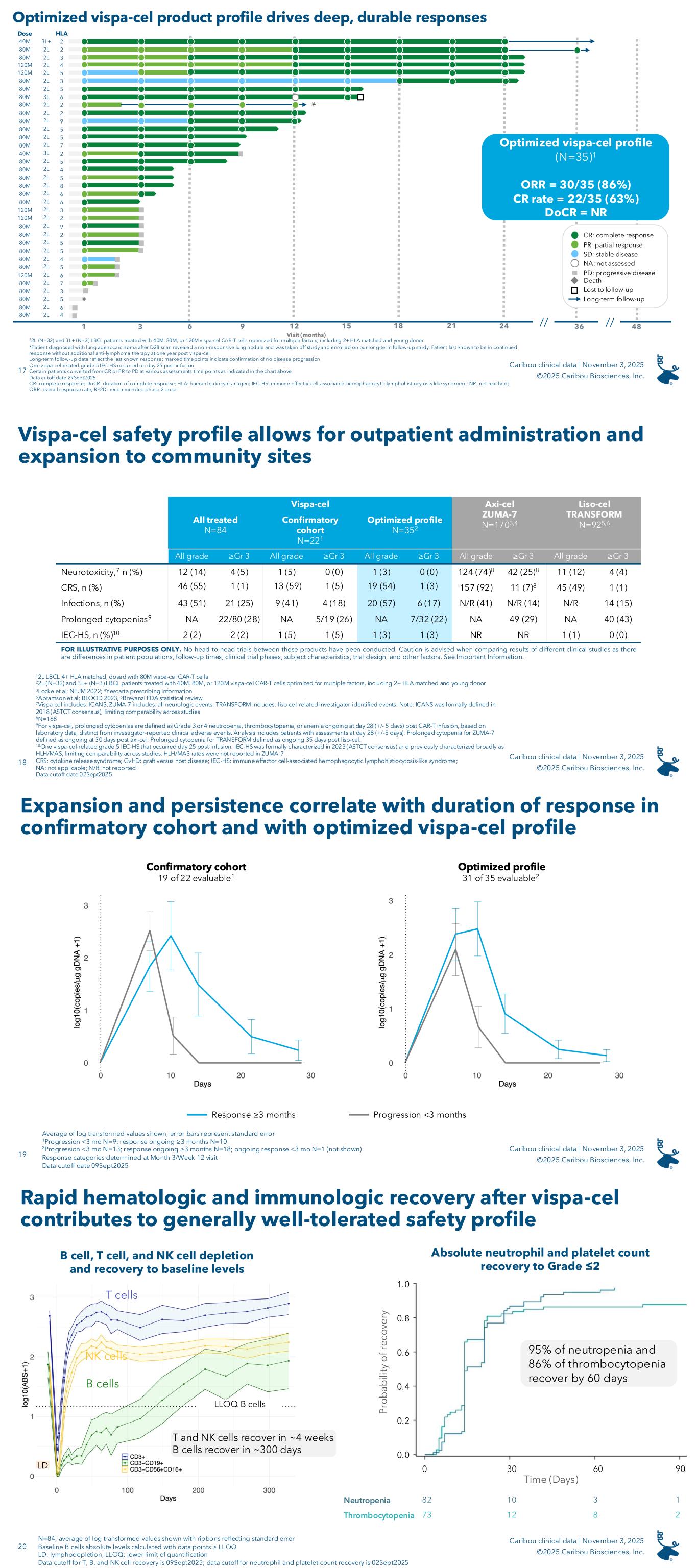 17 Caribou clinical data | November 3, 2025 ©2025 Caribou Biosciences, Inc. Optimized vispa-cel product profile drives deep, durable responses 1 6 12 18 21 243 9 15 Optimized vispa-cel profile (N=35)1 ORR = 30/35 (86%) CR rate = 22/35 (63%) DoCR = NR Dose HLA 40M 3L+ 2 80M 2L 2 80M 2L 3 120M 2L 4 120M 2L 5 80M 2L 3 80M 2L 5 80M 3L 6 80M 2L 2 80M 2L 2 80M 2L 9 80M 2L 5 80M 2L 5 80M 2L 7 40M 3L 2 80M 2L 5 80M 2L 4 80M 2L 5 80M 2L 8 80M 2L 6 80M 2L 6 120M 2L 3 120M 2L 2 80M 2L 9 80M 2L 2 80M 2L 5 80M 2L 5 80M 2L 4 80M 2L 5 120M 2L 6 80M 2L 7 80M 2L 3 80M 2L 5 80M 2L 6 80M 2L 4 CR: complete response PR: partial response SD: stable disease NA: not assessed PD: progressive disease Death Lost to follow-up Long-term follow-up // 36 48// Visit (months) 12L (N=32) and 3L+ (N=3) LBCL patients treated with 40M, 80M, or 120M vispa-cel CAR-T cells optimized for multiple factors, including 2+ HLA matched and young donor *Patient diagnosed with lung adenocarcinoma after D28 scan revealed a non-responsive lung nodule and was taken off study and enrolled on our long-term follow-up study. Patient last known to be in continued response without additional anti-lymphoma therapy at one year post vispa-cel Long-term follow-up data reflect the last known response; marked timepoints indicate confirmation of no disease progression One vispa-cel-related grade 5 IEC-HS occurred on day 25 post-infusion Certain patients converted from CR or PR to PD at various assessments time points as indicated in the chart above Data cutoff date 29Sept2025 CR: complete response; DoCR: duration of complete response; HLA: human leukocyte antigen; IEC-HS: immune effector cell-associated hemophagocytic lymphohistiocytosis-like syndrome; NR: not reached; ORR: overall response rate; RP2D: recommended phase 2 dose 18 Caribou clinical data | November 3, 2025 ©2025 Caribou Biosciences, Inc. Vispa-cel safety profile allows for outpatient administration and expansion to community sites Vispa-cel Axi-cel ZUMA-7 N=1703,4 Liso-cel TRANSFORM N=925,6All treated N=84 Confirmatory cohort N=221 Optimized profile N=352 All grade ≥Gr 3 All grade ≥Gr 3 All grade ≥Gr 3 All grade ≥Gr 3 All grade ≥Gr 3 Neurotoxicity,7 n (%) 12 (14) 4 (5) 1 (5) 0 (0) 1 (3) 0 (0) 124 (74)8 42 (25)8 11 (12) 4 (4) CRS, n (%) 46 (55) 1 (1) 13 (59) 1 (5) 19 (54) 1 (3) 157 (92) 11 (7)8 45 (49) 1 (1) Infections, n (%) 43 (51) 21 (25) 9 (41) 4 (18) 20 (57) 6 (17) N/R (41) N/R (14) N/R 14 (15) Prolonged cytopenias9 NA 22/80 (28) NA 5/19 (26) NA 7/32 (22) NA 49 (29) NA 40 (43) IEC-HS, n (%)10 2 (2) 2 (2) 1 (5) 1 (5) 1 (3) 1 (3) NR NR 1 (1) 0 (0) FOR ILLUSTRATIVE PURPOSES ONLY. No head-to-head trials between these products have been conducted. Caution is advised when comparing results of different clinical studies as there are differences in patient populations, follow-up times, clinical trial phases, subject characteristics, trial design, and other factors. See Important Information. 12L LBCL 4+ HLA matched, dosed with 80M vispa-cel CAR-T cells 22L (N=32) and 3L+ (N=3) LBCL patients treated with 40M, 80M, or 120M vispa-cel CAR-T cells optimized for multiple factors, including 2+ HLA matched and young donor 3Locke et al; NEJM 2022; 4Yescarta prescribing information 5Abramson et al; BLOOD 2023, 6Breyanzi FDA statistical review 7Vispa-cel includes: ICANS; ZUMA-7 includes: all neurologic events; TRANSFORM includes: liso-cel–related investigator-identified events. Note: ICANS was formally defined in 2018 (ASTCT consensus), limiting comparability across studies 8N=168 9For vispa-cel, prolonged cytopenias are defined as Grade 3 or 4 neutropenia, thrombocytopenia, or anemia ongoing at day 28 (+/- 5 days) post CAR-T infusion, based on laboratory data, distinct from investigator-reported clinical adverse events. Analysis includes patients with assessments at day 28 (+/-5 days). Prolonged cytopenia for ZUMA-7 defined as ongoing at 30 days post axi-cel. Prolonged cytopenia for TRANSFORM defined as ongoing 35 days post liso-cel. 10One vispa-cel-related grade 5 IEC-HS that occurred day 25 post-infusion. IEC-HS was formally characterized in 2023 (ASTCT consensus) and previously characterized broadly as HLH/MAS, limiting comparability across studies. HLH/MAS rates were not reported in ZUMA-7 CRS: cytokine release syndrome; GvHD: graft versus host disease; IEC-HS: immune effector cell-associated hemophagocytic lymphohistiocytosis-like syndrome; NA: not applicable; N/R: not reported Data cutoff date 02Sept2025 19 Caribou clinical data | November 3, 2025 ©2025 Caribou Biosciences, Inc. Expansion and persistence correlate with duration of response in confirmatory cohort and with optimized vispa-cel profile Optimized profile 31 of 35 evaluable2 Confirmatory cohort 19 of 22 evaluable1 Response ≥3 months Progression <3 months Average of log transformed values shown; error bars represent standard error 1Progression <3 mo N=9; response ongoing ≥3 months N=10 2Progression <3 mo N=13; response ongoing ≥3 months N=18; ongoing response <3 mo N=1 (not shown) Response categories determined at Month 3/Week 12 visit Data cutoff date 09Sept2025 20 Caribou clinical data | November 3, 2025 ©2025 Caribou Biosciences, Inc. Rapid hematologic and immunologic recovery after vispa-cel contributes to generally well-tolerated safety profile B cell, T cell, and NK cell depletion and recovery to baseline levels LLOQ B cells LD T cells NK cells B cells Absolute neutrophil and platelet count recovery to Grade ≤2 N=84; average of log transformed values shown with ribbons reflecting standard error Baseline B cells absolute levels calculated with data points ≥ LLOQ LD: lymphodepletion; LLOQ: lower limit of quantification Data cutoff for T, B, and NK cell recovery is 09Sept2025; data cutoff for neutrophil and platelet count recovery is 02Sept2025 T and NK cells recover in ~4 weeks B cells recover in ~300 days 95% of neutropenia and 86% of thrombocytopenia recover by 60 days Pr ob ab ili ty o f r ec ov er y Ti