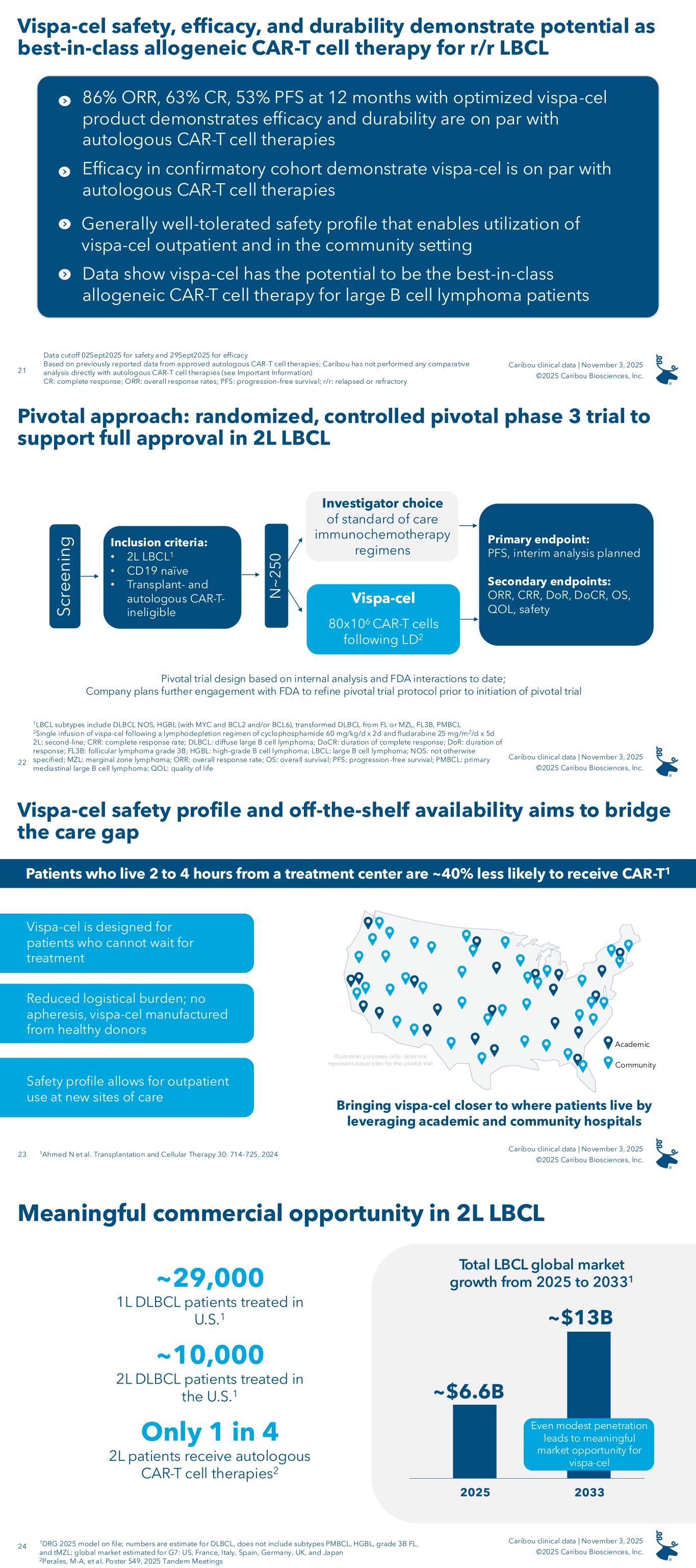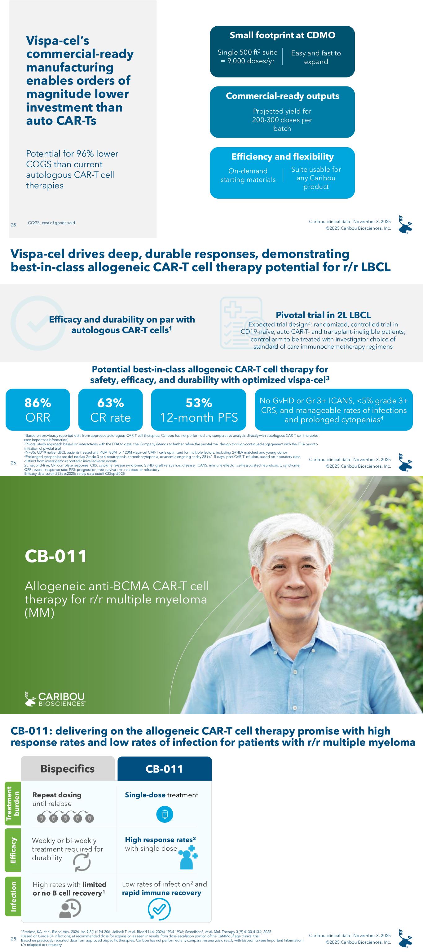 21 Caribou clinical data | November 3, 2025 ©2025 Caribou Biosciences, Inc. Vispa-cel safety, efficacy, and durability demonstrate potential as best-in-class allogeneic CAR-T cell therapy for r/r LBCL Data cutoff 02Sept2025 for safety and 29Sept2025 for efficacy Based on previously reported data from approved autologous CAR-T cell therapies; Caribou has not performed any comparative analysis directly with autologous CAR-T cell therapies (see Important Information) CR: complete response; ORR: overall response rates; PFS: progression-free survival; r/r: relapsed or refractory Generally well-tolerated safety profile that enables utilization of vispa-cel outpatient and in the community setting Data show vispa-cel has the potential to be the best-in-class allogeneic CAR-T cell therapy for large B cell lymphoma patients Efficacy in confirmatory cohort demonstrate vispa-cel is on par with autologous CAR-T cell therapies 86% ORR, 63% CR, 53% PFS at 12 months with optimized vispa-cel product demonstrates efficacy and durability are on par with autologous CAR-T cell therapies 22 Caribou clinical data | November 3, 2025 ©2025 Caribou Biosciences, Inc. Pivotal approach: randomized, controlled pivotal phase 3 trial to support full approval in 2L LBCL 1LBCL subtypes include DLBCL NOS, HGBL (with MYC and BCL2 and/or BCL6), transformed DLBCL from FL or MZL, FL3B, PMBCL 2Single infusion of vispa-cel following a lymphodepletion regimen of cyclophosphamide 60 mg/kg/d x 2d and fludarabine 25 mg/m2/d x 5d 2L: second-line; CRR: complete response rate; DLBCL: diffuse large B cell lymphoma; DoCR: duration of complete response; DoR: duration of response; FL3B: follicular lymphoma grade 3B; HGBL: high-grade B cell lymphoma; LBCL: large B cell lymphoma; NOS: not otherwise specified; MZL: marginal zone lymphoma; ORR: overall response rate; OS: overall survival; PFS: progression -free survival; PMBCL: primary mediastinal large B cell lymphoma; QOL: quality of life Vispa-cel Inclusion criteria: • 2L LBCL1 • CD19 naïve • Transplant- and autologous CAR-T- ineligibleSc re en in g Primary endpoint: PFS, interim analysis planned Secondary endpoints: ORR, CRR, DoR, DoCR, OS, QOL, safety 80x106 CAR-T cells following LD2 Investigator choice of standard of care immunochemotherapy regimens N ~2 50 Pivotal trial design based on internal analysis and FDA interactions to date; Company plans further engagement with FDA to refine pivotal trial protocol prior to initiation of pivotal trial 23 Caribou clinical data | November 3, 2025 ©2025 Caribou Biosciences, Inc. Vispa-cel safety profile and off-the-shelf availability aims to bridge the care gap Vispa-cel is designed for patients who cannot wait for treatment Safety profile allows for outpatient use at new sites of care Patients who live 2 to 4 hours from a treatment center are ~40% less likely to receive CAR-T1 1Ahmed N et al. Transplantation and Cellular Therapy 30: 714-725, 2024 Reduced logistical burden; no apheresis, vispa-cel manufactured from healthy donors Bringing vispa-cel closer to where patients live by leveraging academic and community hospitals Illustration purposes only, does not represent actual sites for the pivotal trial Academic Community 24 Caribou clinical data | November 3, 2025 ©2025 Caribou Biosciences, Inc. Meaningful commercial opportunity in 2L LBCL ~29,000 1L DLBCL patients treated in U.S.1 Only 1 in 4 2L patients receive autologous CAR-T cell therapies2 ~10,000 2L DLBCL patients treated in the U.S.1 ~$6.6B ~$13B Total LBCL global market growth from 2025 to 20331 1DRG 2025 model on file; numbers are estimate for DLBCL, does not include subtypes PMBCL, HGBL, grade 3B FL, and tMZL; global market estimated for G7: US, France, Italy, Spain, Germany, UK, and Japan 2Perales, M-A, et al. Poster 549, 2025 Tandem Meetings Even modest penetration leads to meaningful market opportunity for vispa-cel 2025 2033