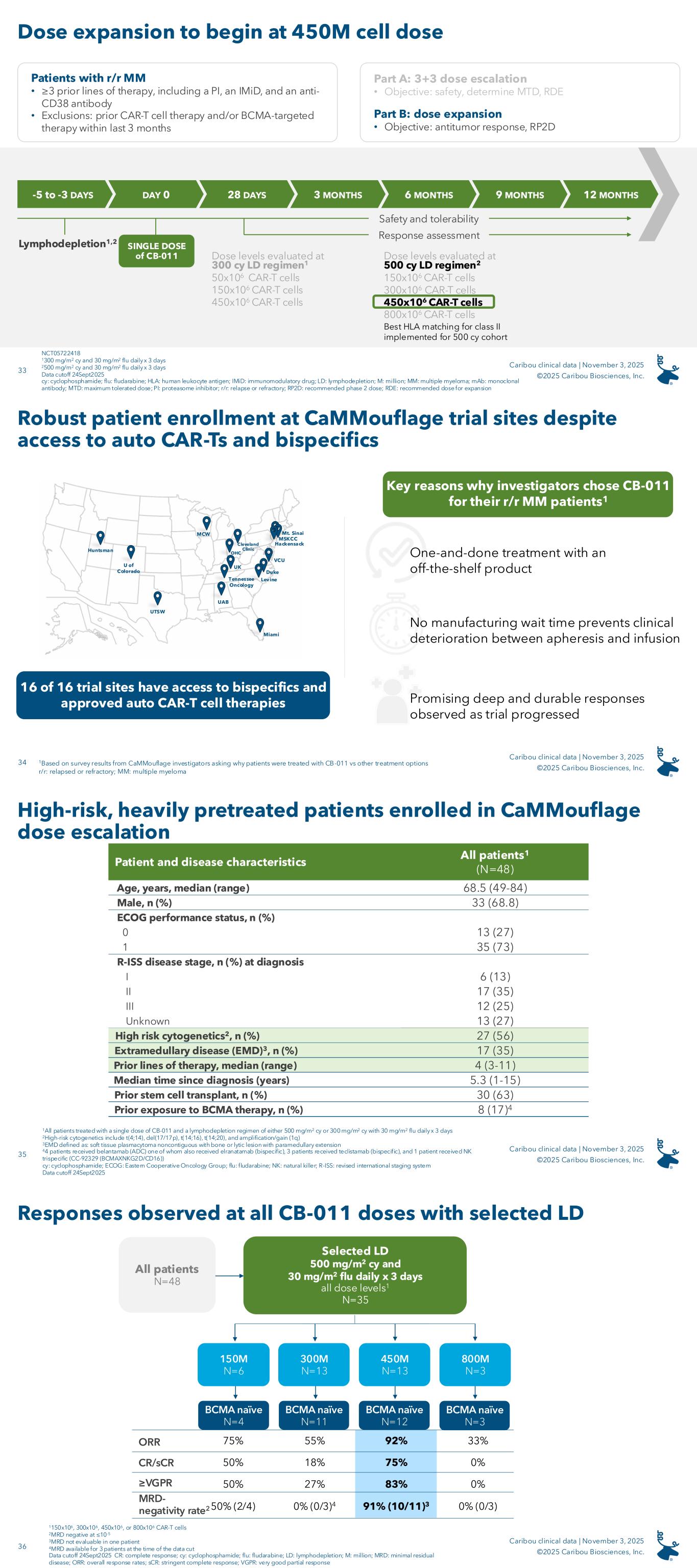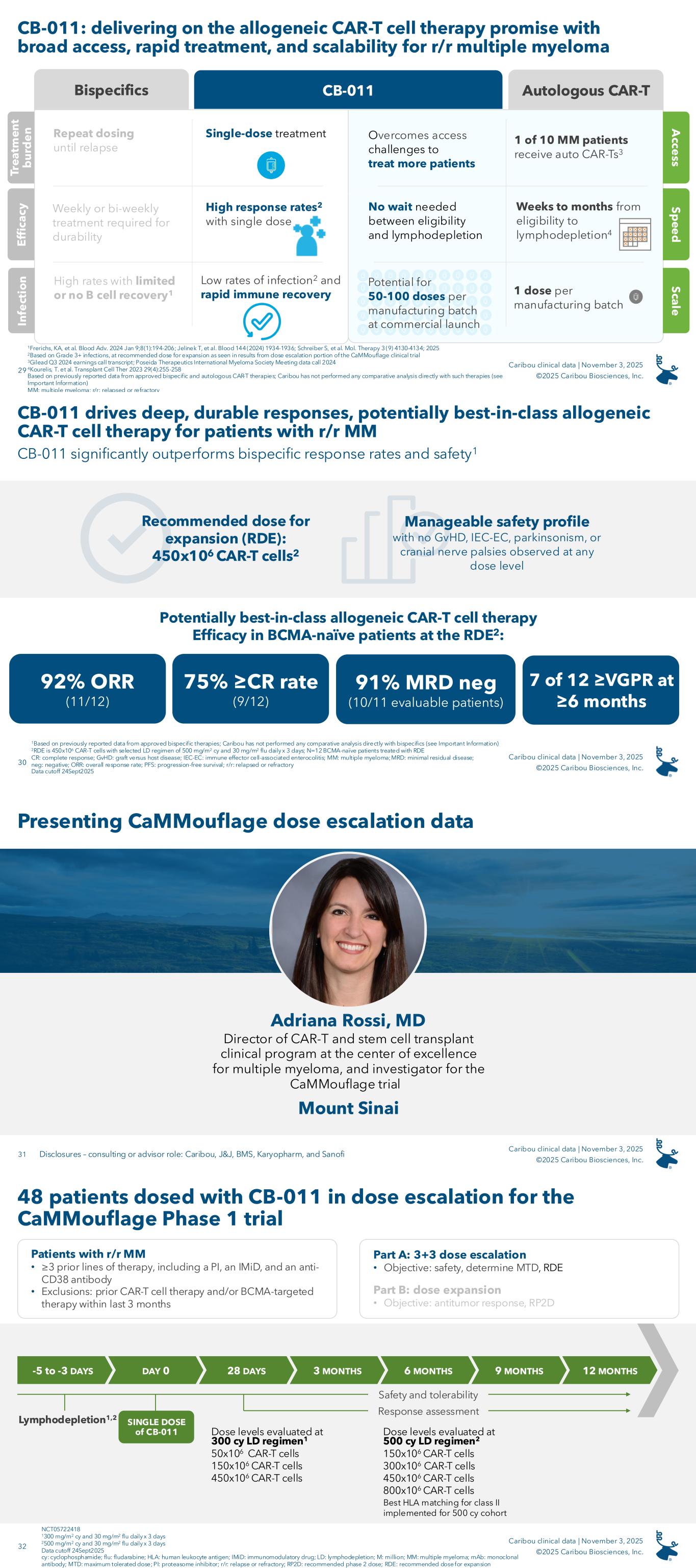 29 Caribou clinical data | November 3, 2025 ©2025 Caribou Biosciences, Inc. CB-011: delivering on the allogeneic CAR-T cell therapy promise with broad access, rapid treatment, and scalability for r/r multiple myeloma 1Frerichs, KA, et al. Blood Adv. 2024 Jan 9;8(1):194-206; Jelinek T, et al. Blood 144 (2024) 1934-1936; Schreiber S, et al. Mol. Therapy 3 (9) 4130-4134; 2025 2Based on Grade 3+ infections, at recommended dose for expansion as seen in results from dose escalation portion of the CaMMouflage clinical trial 3Gilead Q3 2024 earnings call transcript; Poseida Therapeutics International Myeloma Society Meeting data call 2024 4Kourelis, T. et al. Transplant Cell Ther 2023 29(4):255-258 Based on previously reported data from approved bispecific and autologous CAR-T therapies; Caribou has not performed any comparative analysis directly with such therapies (see Important Information) MM: multiple myeloma; r/r: relapsed or refractory Bispecifics CB-011 1 dose per manufacturing batch Weeks to months from eligibility to lymphodepletion4 1 of 10 MM patients receive auto CAR-Ts3 E ff ic a c y In fe ct io n Potential for 50-100 doses per manufacturing batch at commercial launch No wait needed between eligibility and lymphodepletion Overcomes access challenges to treat more patients A cc e ss S p e e d S ca le Autologous CAR-T High response rates2 with single dose High rates with limited or no B cell recovery1 Repeat dosing until relapse Single-dose treatment Weekly or bi-weekly treatment required for durability Tr e a tm e n t b u rd e n Low rates of infection2 and rapid immune recovery 30 Caribou clinical data | November 3, 2025 ©2025 Caribou Biosciences, Inc. CB-011 drives deep, durable responses, potentially best-in-class allogeneic CAR-T cell therapy for patients with r/r MM CB-011 significantly outperforms bispecific response rates and safety1 1Based on previously reported data from approved bispecific therapies; Caribou has not performed any comparative analysis directly with bispecifics (see Important Information) 2RDE is 450x106 CAR-T cells with selected LD regimen of 500 mg/m2 cy and 30 mg/m2 flu daily x 3 days; N=12 BCMA-naïve patients treated with RDE CR: complete response; GvHD: graft versus host disease; IEC-EC: immune effector cell-associated enterocolitis; MM: multiple myeloma; MRD: minimal residual disease; neg: negative; ORR: overall response rate; PFS: progression-free survival; r/r: relapsed or refractory Data cutoff 24Sept2025 92% ORR (11/12) 91% MRD neg (10/11 evaluable patients) 75% ≥CR rate (9/12) 7 of 12 ≥VGPR at ≥6 months Manageable safety profile with no GvHD, IEC-EC, parkinsonism, or cranial nerve palsies observed at any dose level Recommended dose for expansion (RDE): 450x106 CAR-T cells2 Potentially best-in-class allogeneic CAR-T cell therapy Efficacy in BCMA-naïve patients at the RDE2: 31 Caribou clinical data | November 3, 2025 ©2025 Caribou Biosciences, Inc. Presenting CaMMouflage dose escalation data Disclosures – consulting or advisor role: Caribou, J&J, BMS, Karyopharm, and Sanofi Director of CAR-T and stem cell transplant clinical program at the center of excellence for multiple myeloma, and investigator for the CaMMouflage trial Mount Sinai Adriana Rossi, MD 32 Caribou clinical data | November 3, 2025 ©2025 Caribou Biosciences, Inc. 48 patients dosed with CB-011 in dose escalation for the CaMMouflage Phase 1 trial NCT05722418 1300 mg/m2 cy and 30 mg/m2 flu daily x 3 days 2500 mg/m2 cy and 30 mg/m2 flu daily x 3 days Data cutoff 24Sept2025 cy: cyclophosphamide; flu: fludarabine; HLA: human leukocyte antigen; IMiD: immunomodulatory drug; LD: lymphodepletion; M: million; MM: multiple myeloma; mAb: monoclonal antibody; MTD: maximum tolerated dose; PI: proteasome inhibitor; r/r: relapse or refractory; RP2D: recommended phase 2 dose; RDE: recommended dose for expansion Patients with r/r MM • ≥3 prior lines of therapy, including a PI, an IMiD, and an anti- CD38 antibody • Exclusions: prior CAR-T cell therapy and/or BCMA-targeted therapy within last 3 months Part A: 3+3 dose escalation • Objective: safety, determine MTD, RDE Part B: dose expansion • Objective: antitumor response, RP2D -5 to -3 DAYS DAY 0 28 DAYS 3 MONTHS 6 MONTHS 9 MONTHS 12 MONTHS Lymphodepletion1,2 Safety and tolerability Response assessment SINGLE DOSE of CB-011 Dose levels evaluated at 300 cy LD regimen1 50x106 CAR-T cells 150x106 CAR-T cells 450x106 CAR-T cells Dose levels evaluated at 500 cy LD regimen2 150x106 CAR-T cells 300x106 CAR-T cells 450x106 CAR-T cells 800x106 CAR-T cells Best HLA matching for class II implemented for 500 cy cohort