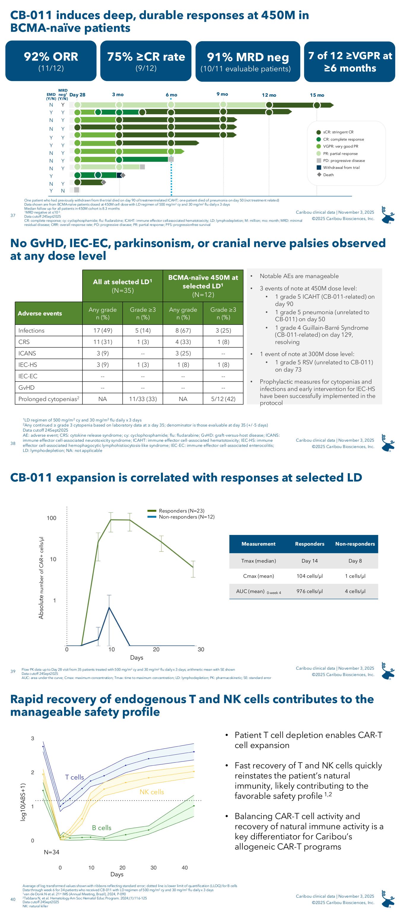 37 Caribou clinical data | November 3, 2025 ©2025 Caribou Biosciences, Inc. EMD (Y/N) MRD neg1 (Y/N) N Y Y Y N Y N Y Y Y Y Y N Y N Y N Y Y N Y Y N 12 mo9 mo6 mo3 moDay 28 One patient who had previously withdrawn from the trial died on day 90 of treatment-related ICAHT; one patient died of pneumonia on day 50 (not treatment related) Data shown are from BCMA-naïve patients dosed at 450M cell dose with LD regimen of 500 mg/m2 cy and 30 mg/m2 flu daily x 3 days Median follow up for all patients in 450M cohort is 8.3 months 1MRD negative at ≤10-5 Data cutoff 24Sept2025 CR: complete response; cy: cyclophosphamide; flu: fludarabine; ICAHT: immune effector cell-associated hematotoxicity; LD: lymphodepletion; M: million; mo: month; MRD: minimal residual disease; ORR: overall response rate; PD: progressive disease; PR: partial response; PFS: progression-free survival 92% ORR (11/12) sCR: stringent CR CR: complete response VGPR: very good PR PR: partial response PD: progressive disease Withdrawal from trial Death 91% MRD neg (10/11 evaluable patients) 75% ≥CR rate (9/12) 15 mo 7 of 12 ≥VGPR at ≥6 months CB-011 induces deep, durable responses at 450M in BCMA-naïve patients 38 Caribou clinical data | November 3, 2025 ©2025 Caribou Biosciences, Inc. All at selected LD1 (N=35) BCMA-naïve 450M at selected LD1 (N=12) Adverse events Any grade n (%) Grade ≥3 n (%) Any grade n (%) Grade ≥3 n (%) Infections 17 (49) 5 (14) 8 (67) 3 (25) CRS 11 (31) 1 (3) 4 (33) 1 (8) ICANS 3 (9) -- 3 (25) -- IEC-HS 3 (9) 1 (3) 1 (8) 1 (8) IEC-EC -- -- -- -- GvHD -- -- -- -- Prolonged cytopenias2 NA 11/33 (33) NA 5/12 (42) 1LD regimen of 500 mg/m2 cy and 30 mg/m2 flu daily x 3 days 2Any continued ≥ grade 3 cytopenia based on laboratory data at ≥ day 35; denominator is those evaluable at day 35 (+/ -5 days) Data cutoff 24Sept2025 AE: adverse event; CRS: cytokine release syndrome; cy: cyclophosphamide; flu: fludarabine; GvHD: graft-versus-host disease; ICANS: immune effector cell-associated neurotoxicity syndrome; ICAHT: immune effector cell-associated hematotoxicity; IEC-HS: immune effector cell-associated hemophagocytic lymphohistiocytosis-like syndrome; IEC-EC: immune effector cell-associated enterocolitis; LD: lymphodepletion; NA: not applicable • Notable AEs are manageable • 3 events of note at 450M dose level: • 1 grade 5 ICAHT (CB-011-related) on day 90 • 1 grade 5 pneumonia (unrelated to CB-011) on day 50 • 1 grade 4 Guillain-Barré Syndrome (CB-011-related) on day 129, resolving • 1 event of note at 300M dose level: • 1 grade 5 RSV (unrelated to CB-011) on day 73 • Prophylactic measures for cytopenias and infections and early intervention for IEC-HS have been successfully implemented in the protocol No GvHD, IEC-EC, parkinsonism, or cranial nerve palsies observed at any dose level 39 Caribou clinical data | November 3, 2025 ©2025 Caribou Biosciences, Inc. CB-011 expansion is correlated with responses at selected LD Flow PK data up to Day 28 visit from 35 patients treated with 500 mg/m2 cy and 30 mg/m2 flu daily x 3 days; arithmetic mean with SE shown Data cutoff 24Sept2025 AUC: area under the curve; Cmax: maximum concentration; Tmax: time to maximum concentration; LD: lymphodepletion; PK: pharmacokinetic; SE: standard error Responders (N=23) Non-responders (N=12) Days A bs ol ut e nu m be r o f C A R+ c el ls /µ l Measurement Responders Non-responders Tmax (median) Day 14 Day 8 Cmax (mean) 104 cells/µl 1 cells/µl AUC (mean) 0-week 4 976 cells/µl 4 cells/µl 40 Caribou clinical data | November 3, 2025 ©2025 Caribou Biosciences, Inc. Rapid recovery of endogenous T and NK cells contributes to the manageable safety profile Average of log transformed values shown with ribbons reflecting standard error; dotted line is lower limit of quantification (LLOQ) for B cells Data through week 6 for 34 patients who received CB-011 with LD regimen of 500 mg/m2 cy and 30 mg/m2 flu daily x 3 days 1van de Donk N et al. 21st IMS (Annual Meeting, Brazil), 2024, P-090 2Tabbara N, et al. Hematology Am Soc Hematol Educ Program. 2024;(1):116-125 Data cutoff 24Sept2025 NK: natural killer B cells T cells NK cells • Patient T cell depletion enables CAR-T cell expansion • Fast recovery of T and NK cells quickly reinstates the patient’s natural immunity, likely contributing to the favorable safety profile 1,2 • Balancing CAR-T cell activity and recovery of natural immune activity is a key differentiator for Caribou’s allogeneic CAR-T programs N=34 Days lo g1 0( AB S+ 1)