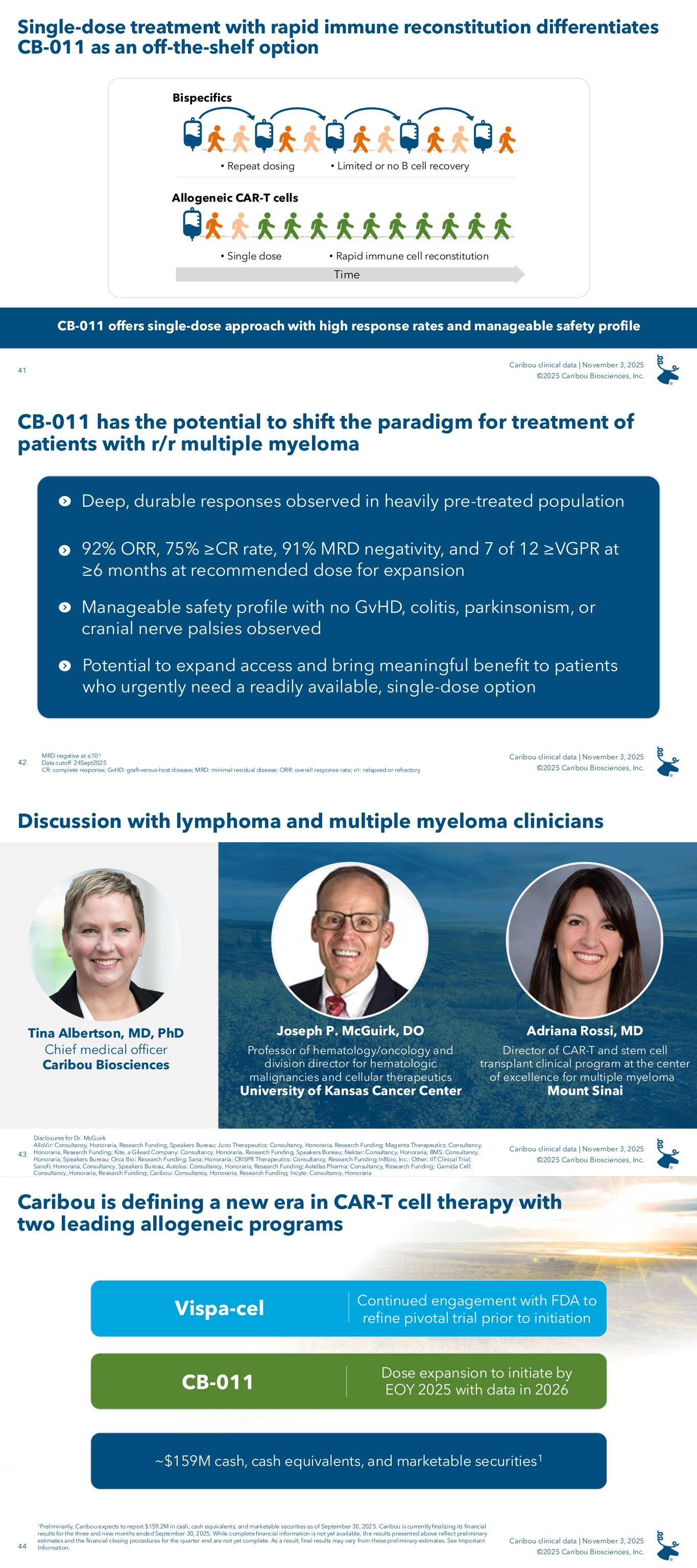 41 Caribou clinical data | November 3, 2025 ©2025 Caribou Biosciences, Inc. Single-dose treatment with rapid immune reconstitution differentiates CB-011 as an off-the-shelf option CB-011 offers single-dose approach with high response rates and manageable safety profile Allogeneic CAR-T cells Time • Repeat dosing Bispecifics • Limited or no B cell recovery • Single dose • Rapid immune cell reconstitution 42 Caribou clinical data | November 3, 2025 ©2025 Caribou Biosciences, Inc. CB-011 has the potential to shift the paradigm for treatment of patients with r/r multiple myeloma Manageable safety profile with no GvHD, colitis, parkinsonism, or cranial nerve palsies observed Potential to expand access and bring meaningful benefit to patients who urgently need a readily available, single-dose option Deep, durable responses observed in heavily pre-treated population 92% ORR, 75% ≥CR rate, 91% MRD negativity, and 7 of 12 ≥VGPR at ≥6 months at recommended dose for expansion MRD negative at ≤10-5 Data cutoff 24Sept2025 CR: complete response; GvHD: graft-versus-host disease; MRD: minimal residual disease; ORR: overall response rate; r/r: relapsed or refractory 43 Caribou clinical data | November 3, 2025 ©2025 Caribou Biosciences, Inc. Discussion with lymphoma and multiple myeloma clinicians Professor of hematology/oncology and division director for hematologic malignancies and cellular therapeutics University of Kansas Cancer Center Joseph P. McGuirk, DOTina Albertson, MD, PhD Chief medical officer Caribou Biosciences Disclosures for Dr. McGuirk AlloVir: Consultancy, Honoraria, Research Funding, Speakers Bureau; Juno Therapeutics: Consultancy, Honoraria, Research Funding; Magenta Therapeutics: Consultancy, Honoraria, Research Funding; Kite, a Gilead Company: Consultancy, Honoraria, Research Funding, Speakers Bureau; Nektar: Consultancy, Honoraria; BMS: Consultancy, Honoraria, Speakers Bureau; Orca Bio: Research Funding; Sana: Honoraria; CRISPR Therapeutics: Consultancy, Research Funding; In8bio, Inc.: Other: IIT Clinical Trial; Sanofi: Honoraria, Consultancy, Speakers Bureau; Autolus: Consultancy, Honoraria, Research Funding; Astellas Pharma: Consultancy, Research Funding; Gamida Cell: Consultancy, Honoraria, Research Funding; Caribou: Consultancy, Honoraria, Research Funding; Incyte: Consultancy, Honoraria Director of CAR-T and stem cell transplant clinical program at the center of excellence for multiple myeloma Mount Sinai Adriana Rossi, MD 44 Caribou clinical data | November 3, 2025 ©2025 Caribou Biosciences, Inc. Caribou is defining a new era in CAR-T cell therapy with two leading allogeneic programs ~$159M cash, cash equivalents, and marketable securities1 Continued engagement with FDA to refine pivotal trial prior to initiation Vispa-cel Dose expansion to initiate by EOY 2025 with data in 2026CB-011 1Preliminarily, Caribou expects to report $159.2M in cash, cash equivalents, and marketable securities as of September 30, 2025. Caribou is currently finalizing its financial results for the three and nine months ended September 30, 2025. While complete financial information is not yet available, the results presented above reflect preliminary estimates and the financial closing procedures for the quarter end are not yet complete. As a result, final results may vary from these preliminary estimates. See Important Information.