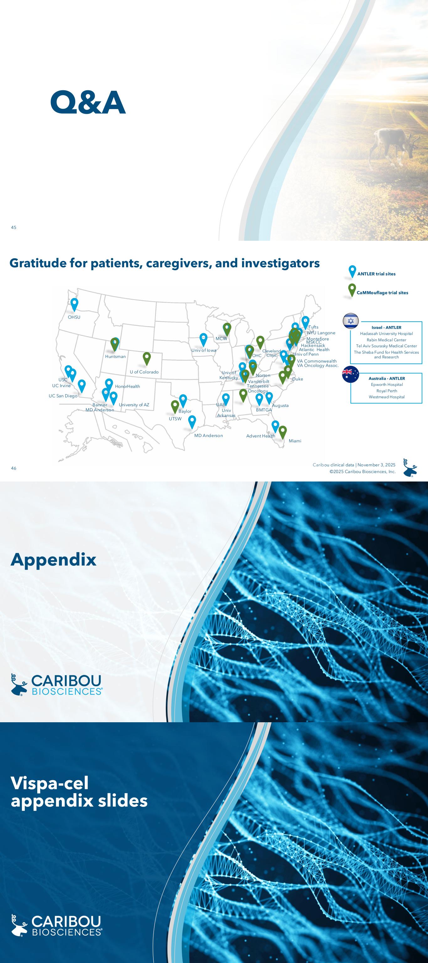 45 Caribou clinical data | November 3, 2025 ©2025 Caribou Biosciences, Inc. 1 Initial safety and efficacy data on the confirmatory cohort (20 patients) with partial HLA matching, with a minimum of six months of follow up for the majority of patients, as well as an update on the larger, maturing dataset presented previously. Q&A 46 Caribou clinical data | November 3, 2025 ©2025 Caribou Biosciences, Inc. Gratitude for patients, caregivers, and investigators UC Irvine UC San Diego HonorHealth Huntsman Baylor MD Anderson OHC Atlantic HealthUniv of Iowa University of AZ Augusta Univ Arkansas Univ of Kentucky MCW BMTGA Montefiore Advent Health Norton Hackensack USC Univ of Penn NYU Langone Banner MD Anderson Vanderbilt Tufts OHSU VA Commonwealth VA Oncology Assoc. Israel - ANTLER Hadassah University Hospital Rabin Medical Center Tel Aviv Sourasky Medical Center The Sheba Fund for Health Services and Research Australia - ANTLER Epworth Hospital Royal Perth Westmead Hospital Miami MSKCC Cleveland Clinic UTSW U of Colorado Duke UAB Tennessee Oncology ANTLER trial sites CaMMouflage trial sites Appendix Vispa-cel appendix slides