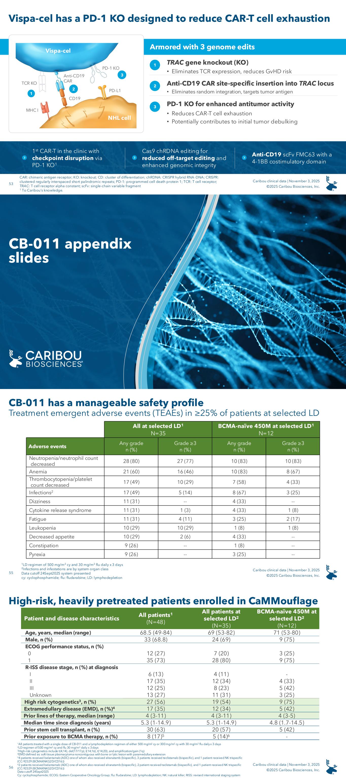 53 Caribou clinical data | November 3, 2025 ©2025 Caribou Biosciences, Inc. Vispa-cel has a PD-1 KO designed to reduce CAR-T cell exhaustion Vispa-cel NHL cell 1 2 3 TCR KO MHC I Anti-CD19 CAR CD19 PD-L1 PD-1 KO Armored with 3 genome edits 1 2 3 TRAC gene knockout (KO) • Eliminates TCR expression, reduces GvHD risk Anti-CD19 CAR site-specific insertion into TRAC locus • Eliminates random integration, targets tumor antigen PD-1 KO for enhanced antitumor activity • Reduces CAR-T cell exhaustion • Potentially contributes to initial tumor debulking CAR: chimeric antigen receptor; KO: knockout; CD: cluster of differentiation; chRDNA: CRISPR hybrid RNA-DNA; CRISPR: clustered regularly interspaced short palindromic repeats; PD-1: programmed cell death protein 1; TCR: T cell receptor; TRAC: T cell receptor alpha constant; scFv: single-chain variable fragment 1 To Caribou’s knowledge. 1st CAR-T in the clinic with checkpoint disruption via PD-1 KO1 Cas9 chRDNA editing for reduced off-target editing and enhanced genomic integrity Anti-CD19 scFv FMC63 with a 4-1BB costimulatory domain CB-011 appendix slides 55 Caribou clinical data | November 3, 2025 ©2025 Caribou Biosciences, Inc. 1LD regimen of 500 mg/m2 cy and 30 mg/m2 flu daily x 3 days 2Infections and infestations are by system organ class Data cutoff 24Sept2025 system presented cy: cyclophosphamide; flu: fludarabine; LD: lymphodepletion All at selected LD1 N=35 BCMA-naïve 450M at selected LD1 N=12 Adverse events Any grade n (%) Grade ≥3 n (%) Any grade n (%) Grade ≥3 n (%) Neutropenia/neutrophil count decreased 28 (80) 27 (77) 10 (83) 10 (83) Anemia 21 (60) 16 (46) 10 (83) 8 (67) Thrombocytopenia/platelet count decreased 17 (49) 10 (29) 7 (58) 4 (33) Infections2 17 (49) 5 (14) 8 (67) 3 (25) Dizziness 11 (31) -- 4 (33) -- Cytokine release syndrome 11 (31) 1 (3) 4 (33) 1 (8) Fatigue 11 (31) 4 (11) 3 (25) 2 (17) Leukopenia 10 (29) 10 (29) 1 (8) 1 (8) Decreased appetite 10 (29) 2 (6) 4 (33) -- Constipation 9 (26) -- 1 (8) -- Pyrexia 9 (26) -- 3 (25) -- CB-011 has a manageable safety profile Treatment emergent adverse events (TEAEs) in ≥25% of patients at selected LD 56 Caribou clinical data | November 3, 2025 ©2025 Caribou Biosciences, Inc. High-risk, heavily pretreated patients enrolled in CaMMouflage Patient and disease characteristics All patients1 (N=48) All patients at selected LD2 (N=35) BCMA-naïve 450M at selected LD2 (N=12) Age, years, median (range) 68.5 (49-84) 69 (53-82) 71 (53-80) Male, n (%) 33 (68.8) 24 (69) 9 (75) ECOG performance status, n (%) 0 12 (27) 7 (20) 3 (25) 1 35 (73) 28 (80) 9 (75) R-ISS disease stage, n (%) at diagnosis I 6 (13) 4 (11) - II 17 (35) 12 (34) 4 (33) III 12 (25) 8 (23) 5 (42) Unknown 13 (27) 11 (31) 3 (25) High risk cytogenetics3, n (%) 27 (56) 19 (54) 9 (75) Extramedullary disease (EMD), n (%)4 17 (35) 12 (34) 5 (42) Prior lines of therapy, median (range) 4 (3-11) 4 (3-11) 4 (3-5) Median time since diagnosis (years) 5.3 (1-14.9) 5.3 (1-14.9) 4.8 (1.7-14.5) Prior stem cell transplant, n (%) 30 (63) 20 (57) 5 (42) Prior exposure to BCMA therapy, n (%) 8 (17)5 5 (14)6 - 1All patients treated with a single dose of CB-011 and a lymphodepletion regimen of either 500 mg/m2 cy or 300 mg/m2 cy with 30 mg/m2 flu daily x 3 days 2LD regimen of 500 mg/m2 cy and flu 30 mg/m2 daily x 3 days 3High-risk cytogenetics include t(4;14), del(17/17p), t(14;16), t(14;20), and amplification/gain (1q) 4EMD defined as: soft tissue plasmacytoma noncontiguous with bone or lytic lesion with paramedullary extension 54 patients received belantamab (ADC) one of whom also received elranatamb (bispecific), 3 patients received teclistamab (bispecific), and 1 patient received NK trispecific (CC-92329 (BCMAXNKG2D/CD16)) 62 patients received belantamab (ADC) one of whom also received elranatamb (bispecific), 2 patient received teclistamab (bispecific), and 1 patient received NK trispecific (CC-92329 (BCMAXNKG2D/CD16)) Data cutoff 24Sept2025 Cy: cyclophosphamide; ECOG: Eastern Cooperative Oncology Group; flu: fludarabine; LD: lymphodepletion; NK: natural killer; R-ISS: revised international staging system