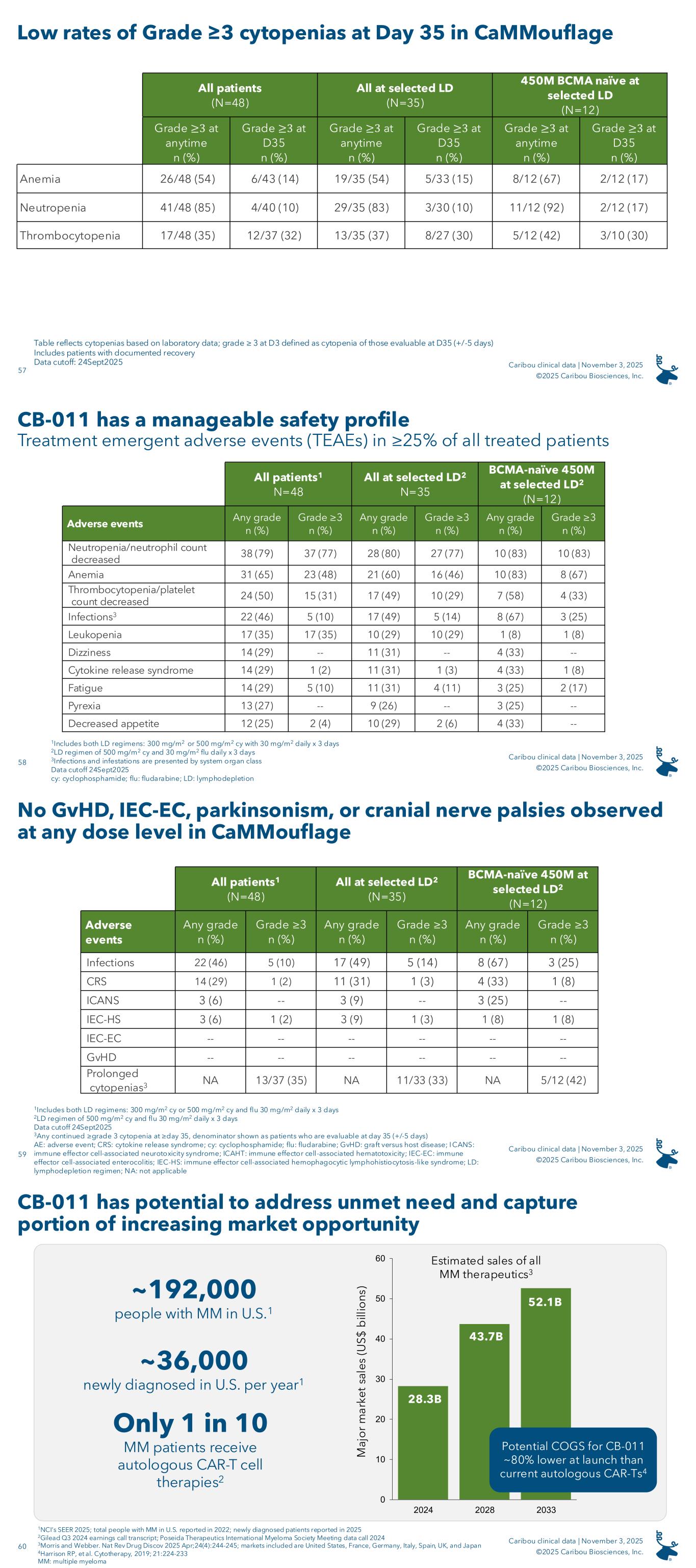 57 Caribou clinical data | November 3, 2025 ©2025 Caribou Biosciences, Inc. Low rates of Grade ≥3 cytopenias at Day 35 in CaMMouflage All patients (N=48) All at selected LD (N=35) 450M BCMA naïve at selected LD (N=12) Grade ≥3 at anytime n (%) Grade ≥3 at D35 n (%) Grade ≥3 at anytime n (%) Grade ≥3 at D35 n (%) Grade ≥3 at anytime n (%) Grade ≥3 at D35 n (%) Anemia 26/48 (54) 6/43 (14) 19/35 (54) 5/33 (15) 8/12 (67) 2/12 (17) Neutropenia 41/48 (85) 4/40 (10) 29/35 (83) 3/30 (10) 11/12 (92) 2/12 (17) Thrombocytopenia 17/48 (35) 12/37 (32) 13/35 (37) 8/27 (30) 5/12 (42) 3/10 (30) Table reflects cytopenias based on laboratory data; grade ≥ 3 at D3 defined as cytopenia of those evaluable at D35 (+/-5 days) Includes patients with documented recovery Data cutoff: 24Sept2025 58 Caribou clinical data | November 3, 2025 ©2025 Caribou Biosciences, Inc. 1Includes both LD regimens: 300 mg/m2 or 500 mg/m2 cy with 30 mg/m2 daily x 3 days 2LD regimen of 500 mg/m2 cy and 30 mg/m2 flu daily x 3 days 3Infections and infestations are presented by system organ class Data cutoff 24Sept2025 cy: cyclophosphamide; flu: fludarabine; LD: lymphodepletion All patients1 N=48 All at selected LD2 N=35 BCMA-naïve 450M at selected LD2 (N=12) Adverse events Any grade n (%) Grade ≥3 n (%) Any grade n (%) Grade ≥3 n (%) Any grade n (%) Grade ≥3 n (%) Neutropenia/neutrophil count decreased 38 (79) 37 (77) 28 (80) 27 (77) 10 (83) 10 (83) Anemia 31 (65) 23 (48) 21 (60) 16 (46) 10 (83) 8 (67) Thrombocytopenia/platelet count decreased 24 (50) 15 (31) 17 (49) 10 (29) 7 (58) 4 (33) Infections3 22 (46) 5 (10) 17 (49) 5 (14) 8 (67) 3 (25) Leukopenia 17 (35) 17 (35) 10 (29) 10 (29) 1 (8) 1 (8) Dizziness 14 (29) -- 11 (31) -- 4 (33) -- Cytokine release syndrome 14 (29) 1 (2) 11 (31) 1 (3) 4 (33) 1 (8) Fatigue 14 (29) 5 (10) 11 (31) 4 (11) 3 (25) 2 (17) Pyrexia 13 (27) -- 9 (26) -- 3 (25) -- Decreased appetite 12 (25) 2 (4) 10 (29) 2 (6) 4 (33) -- CB-011 has a manageable safety profile Treatment emergent adverse events (TEAEs) in ≥25% of all treated patients 59 Caribou clinical data | November 3, 2025 ©2025 Caribou Biosciences, Inc. All patients1 (N=48) All at selected LD2 (N=35) BCMA-naïve 450M at selected LD2 (N=12) Adverse events Any grade n (%) Grade ≥3 n (%) Any grade n (%) Grade ≥3 n (%) Any grade n (%) Grade ≥3 n (%) Infections 22 (46) 5 (10) 17 (49) 5 (14) 8 (67) 3 (25) CRS 14 (29) 1 (2) 11 (31) 1 (3) 4 (33) 1 (8) ICANS 3 (6) -- 3 (9) -- 3 (25) -- IEC-HS 3 (6) 1 (2) 3 (9) 1 (3) 1 (8) 1 (8) IEC-EC -- -- -- -- -- -- GvHD -- -- -- -- -- -- Prolonged cytopenias3 NA 13/37 (35) NA 11/33 (33) NA 5/12 (42) 1Includes both LD regimens: 300 mg/m2 cy or 500 mg/m2 cy and flu 30 mg/m2 daily x 3 days 2LD regimen of 500 mg/m2 cy and flu 30 mg/m2 daily x 3 days Data cutoff 24Sept2025 3Any continued ≥grade 3 cytopenia at ≥day 35, denominator shown as patients who are evaluable at day 35 (+/-5 days) AE: adverse event; CRS: cytokine release syndrome; cy: cyclophosphamide; flu: fludarabine; GvHD: graft versus host disease; I CANS: immune effector cell-associated neurotoxicity syndrome; ICAHT: immune effector cell-associated hematotoxicity; IEC-EC: immune effector cell-associated enterocolitis; IEC-HS: immune effector cell-associated hemophagocytic lymphohistiocytosis-like syndrome; LD: lymphodepletion regimen; NA: not applicable No GvHD, IEC-EC, parkinsonism, or cranial nerve palsies observed at any dose level in CaMMouflage 60 Caribou clinical data | November 3, 2025 ©2025 Caribou Biosciences, Inc. CB-011 has potential to address unmet need and capture portion of increasing market opportunity ~192,000 people with MM in U.S.1 Only 1 in 10 MM patients receive autologous CAR-T cell therapies2 1NCI’s SEER 2025; total people with MM in U.S. reported in 2022; newly diagnosed patients reported in 2025 2Gilead Q3 2024 earnings call transcript; Poseida Therapeutics International Myeloma Society Meeting data call 2024 3Morris and Webber. Nat Rev Drug Discov 2025 Apr;24(4):244-245; markets included are United States, France, Germany, Italy, Spain, UK, and Japan 4Harrison RP, et al. Cytotherapy, 2019; 21:224-233 MM: multiple myeloma 0 10 20 30 40 50 60 2024 2028 2033 28.3B M aj or m ar ke t s al es (U S$ b ill io ns ) 43.7B 52.1B Estimated sales of all MM therapeutics3 ~36,000 newly diagnosed in U.S. per year1 Potential COGS for CB-011 ~80% lower at launch than current autologous CAR-Ts4