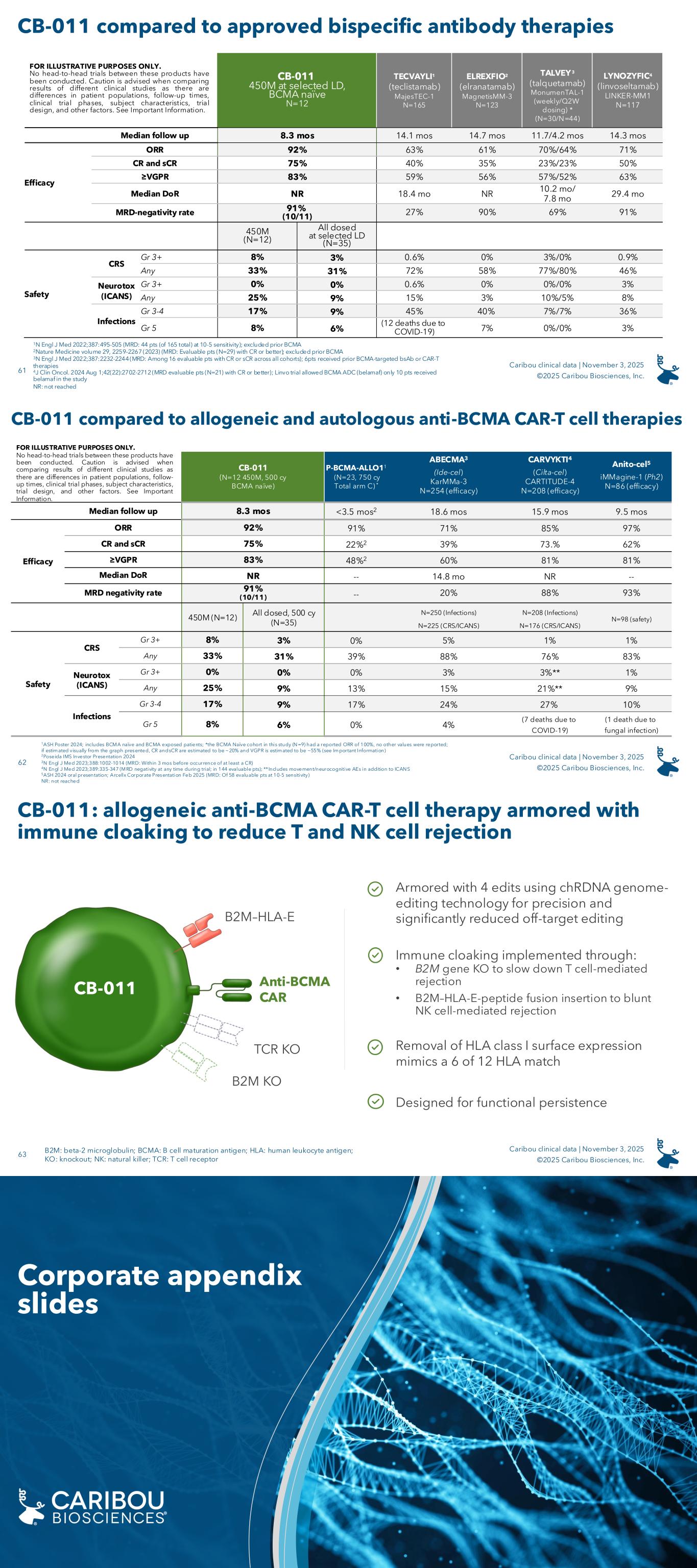 61 Caribou clinical data | November 3, 2025 ©2025 Caribou Biosciences, Inc. CB-011 450M at selected LD, BCMA naïve N=12 TECVAYLI1 (teclistamab) MajesTEC-1 N=165 ELREXFIO2 (elranatamab) MagnetisMM-3 N=123 TALVEY 3 (talquetamab) MonumenTAL-1 (weekly/Q2W dosing) * (N=30/N=44) LYNOZYFIC4 (linvoseltamab) LINKER-MM1 N=117 Median follow up 8.3 mos 14.1 mos 14.7 mos 11.7/4.2 mos 14.3 mos Efficacy ORR 92% 63% 61% 70%/64% 71% CR and sCR 75% 40% 35% 23%/23% 50% ≥VGPR 83% 59% 56% 57%/52% 63% Median DoR NR 18.4 mo NR 10.2 mo/ 7.8 mo 29.4 mo MRD-negativity rate 91% (10/11) 27% 90% 69% 91% 450M (N=12) All dosed at selected LD (N=35) Safety CRS Gr 3+ 8% 3% 0.6% 0% 3%/0% 0.9% Any 33% 31% 72% 58% 77%/80% 46% Neurotox (ICANS) Gr 3+ 0% 0% 0.6% 0% 0%/0% 3% Any 25% 9% 15% 3% 10%/5% 8% Infections Gr 3-4 17% 9% 45% 40% 7%/7% 36% Gr 5 8% 6% (12 deaths due to COVID-19) 7% 0%/0% 3% CB-011 compared to approved bispecific antibody therapies 1N Engl J Med 2022;387:495-505 (MRD: 44 pts (of 165 total) at 10-5 sensitivity); excluded prior BCMA 2Nature Medicine volume 29, 2259–2267 (2023) (MRD: Evaluable pts (N=29) with CR or better); excluded prior BCMA 3N Engl J Med 2022;387:2232-2244 (MRD: Among 16 evaluable pts with CR or sCR across all cohorts); 6pts received prior BCMA-targeted bsAb or CAR-T therapies 4J Clin Oncol. 2024 Aug 1;42(22):2702-2712 (MRD evaluable pts (N=21) with CR or better); Linvo trial allowed BCMA ADC (belamaf) only 10 pts received belamaf in the study NR: not reached FOR ILLUSTRATIVE PURPOSES ONLY. No head-to-head trials between these products have been conducted. Caution is advised when comparing results of different clinical studies as there are differences in patient populations, follow-up times, clinical trial phases, subject characteristics, trial design, and other factors. See Important Information. 62 Caribou clinical data | November 3, 2025 ©2025 Caribou Biosciences, Inc. CB-011 compared to allogeneic and autologous anti-BCMA CAR-T cell therapies CB-011 (N=12 450M, 500 cy BCMA naïve) P-BCMA-ALLO11 (N=23, 750 cy Total arm C) * ABECMA3 (Ide-cel) KarMMa-3 N=254 (efficacy) CARVYKTI4 (Cilta-cel) CARTITUDE-4 N=208 (efficacy) Anito-cel5 iMMagine-1 (Ph2) N=86 (efficacy) Median follow up 8.3 mos <3.5 mos2 18.6 mos 15.9 mos 9.5 mos Efficacy ORR 92% 91% 71% 85% 97% CR and sCR 75% 22%2 39% 73.% 62% ≥VGPR 83% 48%2 60% 81% 81% Median DoR NR -- 14.8 mo NR -- MRD negativity rate 91% (10/11) -- 20% 88% 93% 450M (N=12) All dosed, 500 cy (N=35) N=250 (Infections) N=225 (CRS/ICANS) N=208 (Infections) N=176 (CRS/ICANS) N=98 (safety) Safety CRS Gr 3+ 8% 3% 0% 5% 1% 1% Any 33% 31% 39% 88% 76% 83% Neurotox (ICANS) Gr 3+ 0% 0% 0% 3% 3%** 1% Any 25% 9% 13% 15% 21%** 9% Infections Gr 3-4 17% 9% 17% 24% 27% 10% Gr 5 8% 6% 0% 4% (7 deaths due to COVID-19) (1 death due to fungal infection) 1ASH Poster 2024; includes BCMA naïve and BCMA exposed patients; *the BCMA Naïve cohort in this study (N=9) had a reported ORR of 100%, no other values were reported; if estimated visually from the graph presented, CR and sCR are estimated to be ~20% and VGPR is estimated to be ~55% (see Important Information) 2Poseida IMS Investor Presentation 2024 3N Engl J Med 2023;388:1002-1014 (MRD: Within 3 mos before occurrence of at least a CR) 4N Engl J Med 2023;389:335-347 (MRD negativity at any time during trial; in 144 evaluable pts); ** Includes movement/neurocognitive AEs in addition to ICANS 5ASH 2024 oral presentation; Arcellx Corporate Presentation Feb 2025 (MRD: Of 58 evaluable pts at 10-5 sensitivity) NR: not reached FOR ILLUSTRATIVE PURPOSES ONLY. No head-to-head trials between these products have been conducted. Caution is advised when comparing results of different clinical studies as there are differences in patient populations, follow- up times, clinical trial phases, subject characteristics, trial design, and other factors. See Important Information. 63 Caribou clinical data | November 3, 2025 ©2025 Caribou Biosciences, Inc. Armored with 4 edits using chRDNA genome- editing technology for precision and significantly reduced off-target editing Removal of HLA class I surface expression mimics a 6 of 12 HLA match 63 CB-011: allogeneic anti-BCMA CAR-T cell therapy armored with immune cloaking to reduce T and NK cell rejection CB-011 B2M–HLA-E Anti-BCMA CAR TCR KO B2M KO Designed for functional persistence Immune cloaking implemented through: • B2M gene KO to slow down T cell-mediated rejection • B2M–HLA-E-peptide fusion insertion to blunt NK cell-mediated rejection B2M: beta-2 microglobulin; BCMA: B cell maturation antigen; HLA: human leukocyte antigen; KO: knockout; NK: natural killer; TCR: T cell receptor Corporate appendix slides