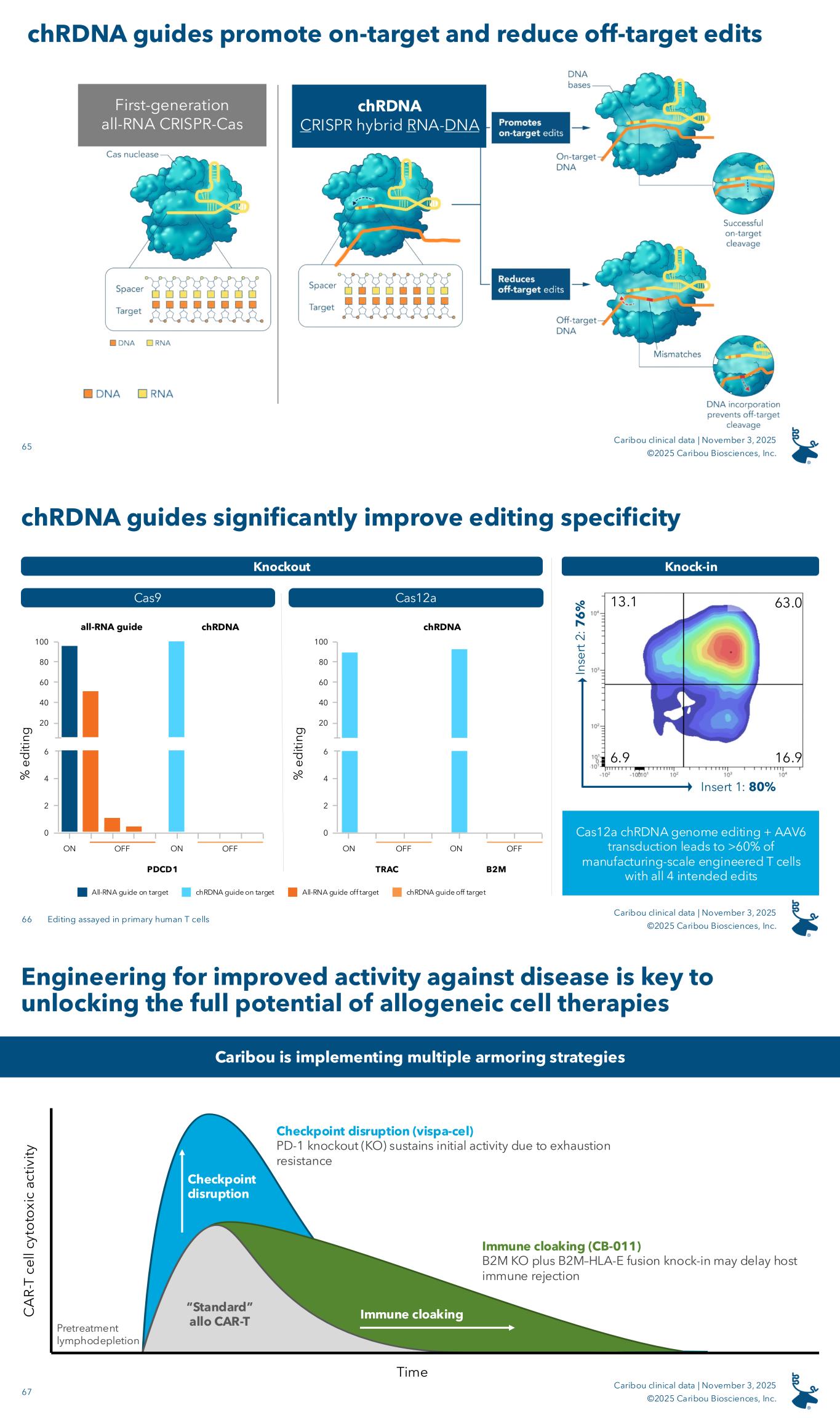 65 Caribou clinical data | November 3, 2025 ©2025 Caribou Biosciences, Inc. chRDNA guides promote on-target and reduce off-target edits First-generation all-RNA CRISPR-Cas chRDNA CRISPR hybrid RNA-DNA 66 Caribou clinical data | November 3, 2025 ©2025 Caribou Biosciences, Inc. Cas9 Cas12a chRDNA guides significantly improve editing specificity Editing assayed in primary human T cells Insert 1: 80% In se rt 2 : 7 6 % Knockout Knock-in Cas12a chRDNA genome editing + AAV6 transduction leads to >60% of manufacturing-scale engineered T cells with all 4 intended edits % e d it in g chRDNA guide on target chRDNA guide off targetAll-RNA guide on target All-RNA guide off target 0 2 4 6 20 40 60 80 100 all-RNA guide chRDNA PDCD1 ON OFF ON OFF TRAC B2M 0 2 4 6 20 40 60 80 100 chRDNA ON OFFON OFF % e d it in g 13.1 6.9 16.9 63.0 67 Caribou clinical data | November 3, 2025 ©2025 Caribou Biosciences, Inc. Engineering for improved activity against disease is key to unlocking the full potential of allogeneic cell therapies Caribou is implementing multiple armoring strategies Time C A R -T c e ll cy to to x ic a c ti v it y Checkpoint disruption (vispa-cel) PD-1 knockout (KO) sustains initial activity due to exhaustion resistance Immune cloaking (CB-011) B2M KO plus B2M–HLA-E fusion knock-in may delay host immune rejection Pretreatment lymphodepletion “Standard” allo CAR-T Checkpoint disruption Immune cloaking
