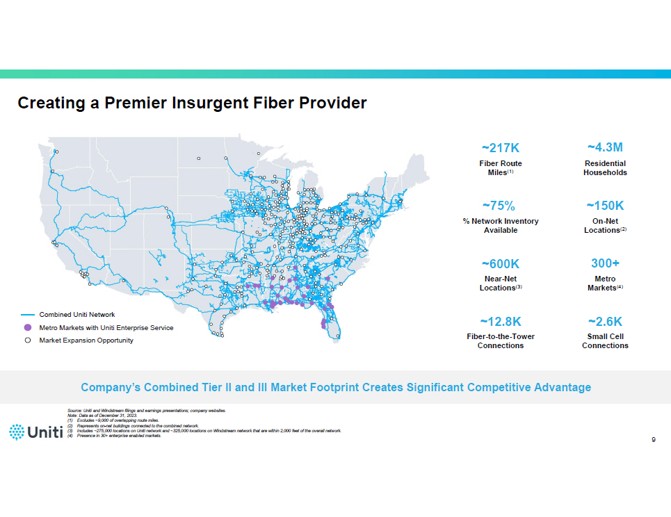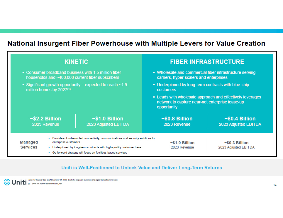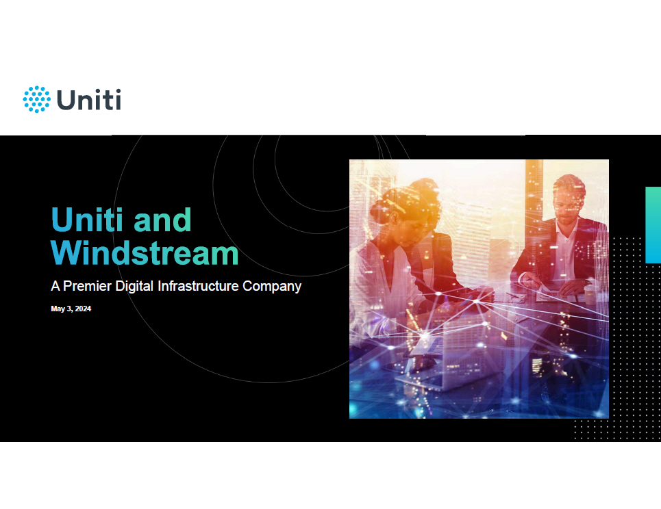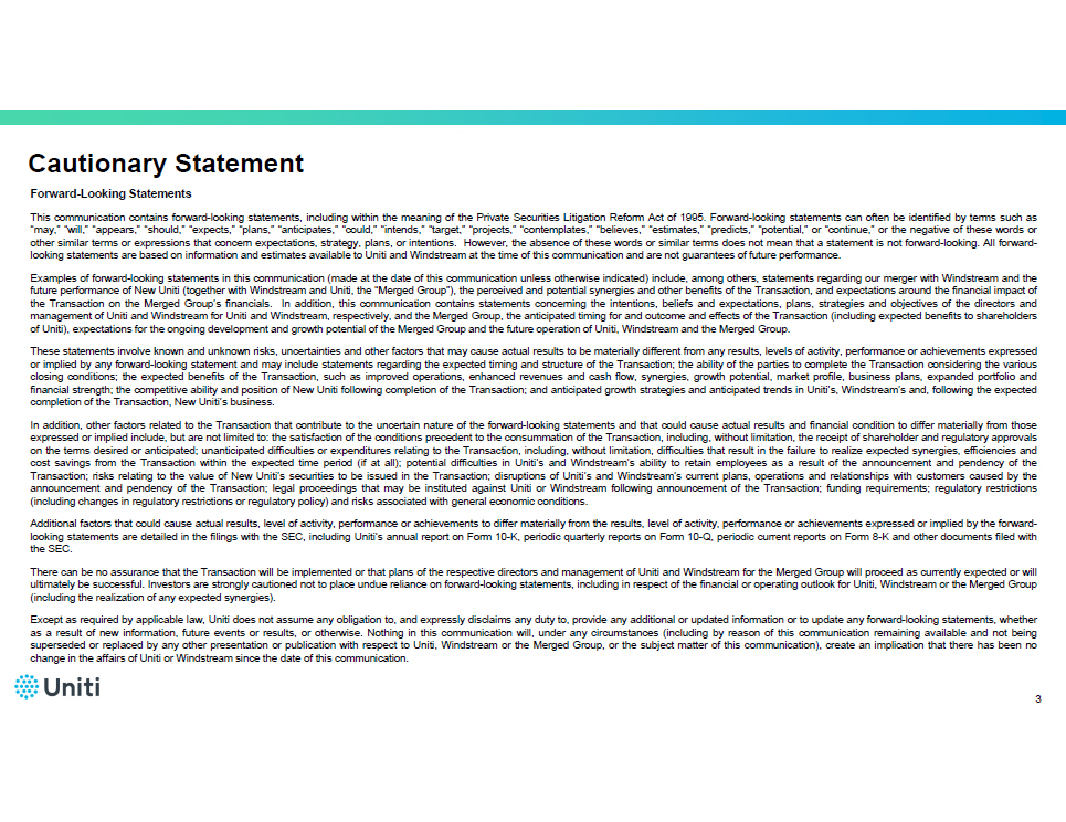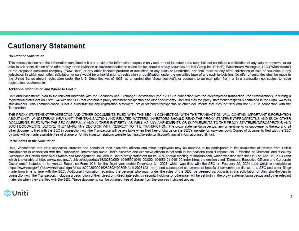 No Offer or Solicitation This communication and the information contained in it are provided for information purposes only and are not intended to be and shall not constitute a solicitation of any vote or approval, or an offer to sell or solicitation of an offer to buy, or an invitation or recommendation to subscribe for, acquire or buy securities of Uniti Group Inc . (“Uniti”), Windstream Holdings II, LLC (“Windstream”) or the proposed combined company (“New Uniti”) or any other financial products or securities, in any place or jurisdiction, nor shall there be any offer, solicitation or sale of securities in any jurisdiction in which such offer, solicitation or sale would be unlawful prior to registration or qualification under the securities laws of any such jurisdiction . No offer of securities shall be made in the United States absent registration under the U . S . Securities Act of 1933 , as amended (the “Securities Act”), or pursuant to an exemption from, or in a transaction not subject to, such registration requirements . Additional Information and Where to Find It Uniti and Windstream plan to file relevant materials with the Securities and Exchange Commission (the “SEC”) in connection with the contemplated transaction (the “Transaction”), including a registration statement on Form S - 4 with the SEC that contains a proxy statement/prospectus and other documents . Uniti will mail the proxy statement/prospectus contained in the Form S - 4 to its stockholders . This communication is not a substitute for any registration statement, proxy statement/prospectus or other documents that may be filed with the SEC in connection with the Transaction . THE PROXY STATEMENT/PROSPECTUS AND OTHER DOCUMENTS FILED WITH THE SEC IN CONNECTION WITH THE TRANSACTION WILL CONTAIN IMPORTANT INFORMATION ABOUT UNITI, WINDSTREAM, NEW UNITI, THE TRANSACTION AND RELATED MATTERS . INVESTORS SHOULD READ THE PROXY STATEMENT/PROSPECTUS AND SUCH OTHER DOCUMENTS FILED WITH THE SEC CAREFULLY AND IN THEIR ENTIRETY, AS WELL AS ANY AMENDMENTS OR SUPPLEMENTS TO THE PROXY STATEMENT/PROSPECTUS AND SUCH DOCUMENTS, BEFORE THEY MAKE ANY DECISION WITH RESPECT TO THE TRANSACTION . The proxy statement/prospectus, any amendments or supplements thereto and all other documents filed with the SEC in connection with the Transaction will be available when filed free of charge on the SEC’s website (at www . sec . gov) . Copies of documents filed with the SEC by Uniti will be made available free of charge on Uniti's investor relations website (at https : //investor . uniti . com/financial - information/sec - filings) . Participants in the Solicitation Uniti, Windstream and their respective directors and certain of their executive officers and other employees may be deemed to be participants in the solicitation of proxies from Uniti’s stockholders in connection with the Transaction . Information about Uniti’s directors and executive officers is set forth in the sections titled “Proposal No . 1 Election of Directors” and “Security Ownership of Certain Beneficial Owners and Management” included in Uniti’s proxy statement for its 2024 annual meeting of stockholders, which was filed with the SEC on April 11 , 2024 (and which is available at https : //www . sec . gov/Archives/edgar/data/ 1620280 / 000110465924046100 / 0001104659 - 24 - 046100 - index . htm), the section titled “Directors, Executive Officers and Corporate Governance” included in its Annual Report on Form 10 - K for the fiscal year ended December 31 , 2023 , which was filed with the SEC on February 29 , 2024 (and which is available at https : //www . sec . gov/ix?doc=/Archives/edgar/data/ 1620280 / 000162828024008054 /unit - 20231231 . htm), and subsequent statements of beneficial ownership on file with the SEC and other filings made from time to time with the SEC . Additional information regarding the persons who may, under the rules of the SEC, be deemed participants in the solicitation of Uniti stockholders in connection with the Transaction, including a description of their direct or indirect interests, by security holdings or otherwise, will be set forth in the proxy statement/prospectus and other relevant materials when they are filed with the SEC . These documents can be obtained free of charge from the sources indicated above . Cautionary Statement 2
