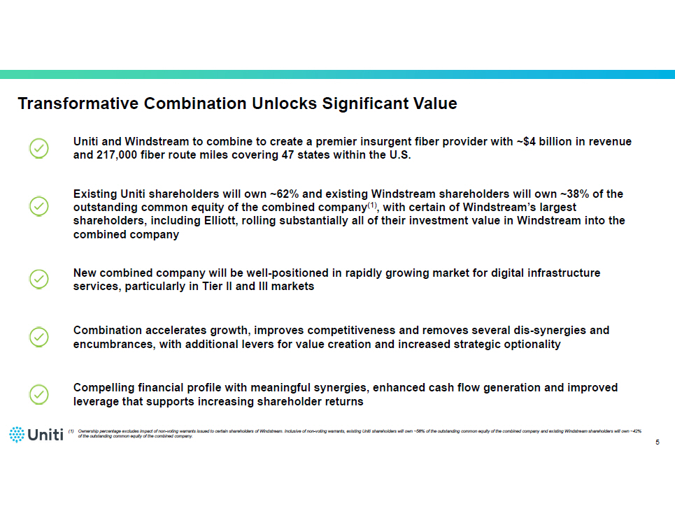 Cautionary Statement 3 Forward - Looking Statements This communication contains forward - looking statements, including within the meaning of the Private Securities Litigation Reform Act of 1995 . Forward - looking statements can often be identified by terms such as “may,” “will,” “appears,” “should,” “expects,” “plans,” “anticipates,” “could,” “intends,” “target,” “projects,” “contemplates,” “believes,” “estimates,” “predicts,” “potential,” or “continue,” or the negative of these words or other similar terms or expressions that concern expectations, strategy, plans, or intentions . However, the absence of these words or similar terms does not mean that a statement is not forward - looking . All forward - looking statements are based on information and estimates available to Uniti and Windstream at the time of this communication and are not guarantees of future performance . Examples of forward - looking statements in this communication (made at the date of this communication unless otherwise indicated) include, among others, statements regarding our merger with Windstream and the future performance of New Uniti (together with Windstream and Uniti, the “Merged Group”), the perceived and potential synergies and other benefits of the Transaction, and expectations around the financial impact of the Transaction on the Merged Group’s financials . In addition, this communication contains statements concerning the intentions, beliefs and expectations, plans, strategies and objectives of the directors and management of Uniti and Windstream for Uniti and Windstream, respectively, and the Merged Group, the anticipated timing for and outcome and effects of the Transaction (including expected benefits to shareholders of Uniti), expectations for the ongoing development and growth potential of the Merged Group and the future operation of Uniti, Windstream and the Merged Group . These statements involve known and unknown risks, uncertainties and other factors that may cause actual results to be materially different from any results, levels of activity, performance or achievements expressed or implied by any forward - looking statement and may include statements regarding the expected timing and structure of the Transaction ; the ability of the parties to complete the Transaction considering the various closing conditions ; the expected benefits of the Transaction, such as improved operations, enhanced revenues and cash flow, synergies, growth potential, market profile, business plans, expanded portfolio and financial strength ; the competitive ability and position of New Uniti following completion of the Transaction ; and anticipated growth strategies and anticipated trends in Uniti’s, Windstream’s and, following the expected completion of the Transaction, New Uniti’s business . In addition, other factors related to the Transaction that contribute to the uncertain nature of the forward - looking statements and that could cause actual results and financial condition to differ materially from those expressed or implied include, but are not limited to : the satisfaction of the conditions precedent to the consummation of the Transaction, including, without limitation, the receipt of shareholder and regulatory approvals on the terms desired or anticipated ; unanticipated difficulties or expenditures relating to the Transaction, including, without limitation, difficulties that result in the failure to realize expected synergies, efficiencies and cost savings from the Transaction within the expected time period (if at all) ; potential difficulties in Uniti’s and Windstream’s ability to retain employees as a result of the announcement and pendency of the Transaction ; risks relating to the value of New Uniti’s securities to be issued in the Transaction ; disruptions of Uniti’s and Windstream’s current plans, operations and relationships with customers caused by the announcement and pendency of the Transaction ; legal proceedings that may be instituted against Uniti or Windstream following announcement of the Transaction ; funding requirements ; regulatory restrictions (including changes in regulatory restrictions or regulatory policy) and risks associated with general economic conditions . Additional factors that could cause actual results, level of activity, performance or achievements to differ materially from the results, level of activity, performance or achievements expressed or implied by the forward - looking statements are detailed in the filings with the SEC, including Uniti’s annual report on Form 10 - K, periodic quarterly reports on Form 10 - Q, periodic current reports on Form 8 - K and other documents filed with the SEC . There can be no assurance that the Transaction will be implemented or that plans of the respective directors and management of Uniti and Windstream for the Merged Group will proceed as currently expected or will ultimately be successful . Investors are strongly cautioned not to place undue reliance on forward - looking statements, including in respect of the financial or operating outlook for Uniti, Windstream or the Merged Group (including the realization of any expected synergies) . Except as required by applicable law, Uniti does not assume any obligation to, and expressly disclaims any duty to, provide any additional or updated information or to update any forward - looking statements, whether as a result of new information, future events or results, or otherwise . Nothing in this communication will, under any circumstances (including by reason of this communication remaining available and not being superseded or replaced by any other presentation or publication with respect to Uniti, Windstream or the Merged Group, or the subject matter of this communication), create an implication that there has been no change in the affairs of Uniti or Windstream since the date of this communicatio
