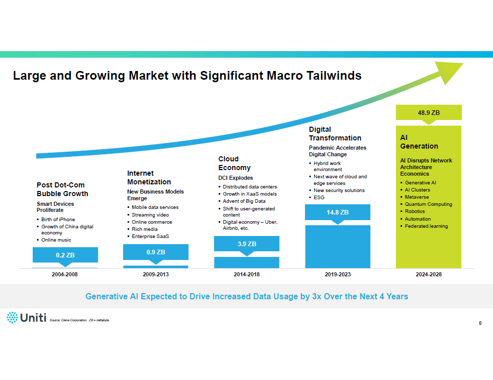 Large and Growing Market with Significant Macro Tailwinds 8 2004-2008 2009-2013 2014-2018 2019-2023 2024-2028 AI Generation Post Dot - Com Bubble Growth Smart Devices Proliferate ▪ Birth of iPhone ▪ Growth of China digital economy ▪ Online music Internet Monetization New Business Models Emerge ▪ Mobile data services ▪ Streaming video ▪ Online commerce ▪ Rich media ▪ Enterprise SaaS Cloud Economy DCI Explodes ▪ Distributed data centers ▪ Growth in XaaS models ▪ Advent of Big Data ▪ Shift to user - generated content ▪ Digital economy – Uber, Airbnb, etc. Digital Transformation Pandemic Accelerates Digital Change ▪ Hybrid work environment ▪ Next wave of cloud and edge services ▪ New security solutions ▪ ESG AI Disrupts Network Architecture Economics ▪ Generative AI ▪ AI Clusters ▪ Metaverse ▪ Quantum Computing ▪ Robotics ▪ Automation ▪ Federated learning 0.9 ZB 0.2 ZB 3.9 ZB 14.8 ZB 48.9 ZB Source: Ciena Corporation. ZB = zettabyte. Generative AI Expected to Drive Increased Data Usage by 3x Over the Next 4 Years