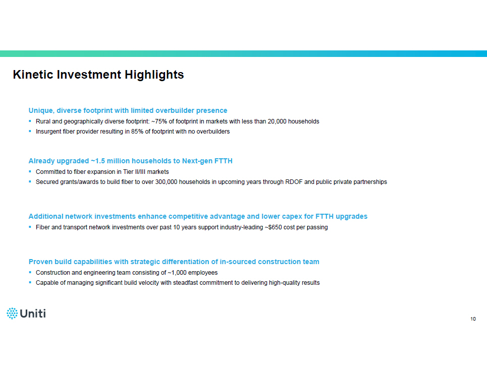 Creating a Premier Insurgent Fiber Provider 9 Market Expansion Opportunity Metro Markets with Uniti Enterprise Service Combined Uniti Network Residential Households ~4.3M Fiber Route Miles (1) ~217K On - Net Locations (2) ~150K % Network Inventory Available ~75% Metro Markets (4) 300+ Near - Net Locations (3) ~600K Fiber - to - the - Tower Connections ~12.8K Small Cell Connections ~2.6K Source: Uniti and Windstream filings and earnings p resentations ; c ompany websites. Note: Data as of December 31, 2023. (1) Excludes ~9,000 of overlapping route miles. (2) Represents on - net buildings connected to the combined network. (3) Includes ~275,000 locations on Uniti network and ~325,000 locations on Windstream network that are within 2,000 feet of the o ver all network. (4) Presence in 30+ enterprise enabled markets. Company’s Combined Tier II and III Market Footprint Creates Significant Competitive Advantage