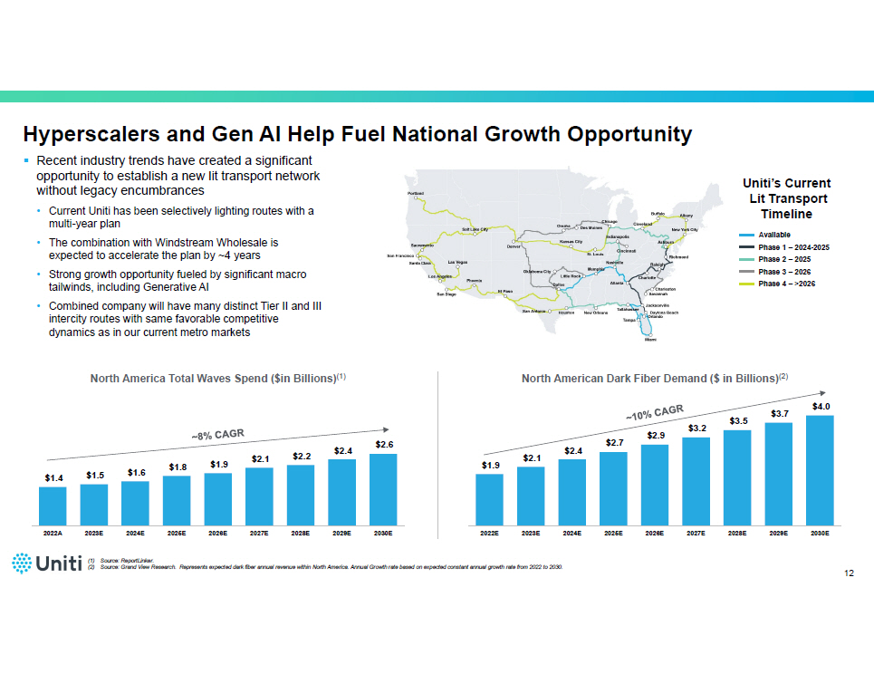 Hyperscalers and Gen AI Help Fuel National Growth Opportunity 12 $1.9 $2.1 $2.4 $2.7 $2.9 $3.2 $3.5 $3.7 $4.0 2022E 2023E 2024E 2025E 2026E 2027E 2028E 2029E 2030E $1.4 $1.5 $1.6 $1.8 $1.9 $2.1 $2.2 $2.4 $2.6 2022A 2023E 2024E 2025E 2026E 2027E 2028E 2029E 2030E ▪ Recent industry trends have created a significant opportunity to establish a new lit transport network without legacy encumbrances • Current Uniti has been selectively lighting routes with a multi - year plan • The combination with Windstream Wholesale is expected to accelerate the plan by ~4 years • Strong growth opportunity fueled by significant macro tailwinds, including Generative AI • Combined company will have many distinct Tier II and III intercity routes with same favorable competitive dynamics as in our current metro markets North American Dark Fiber Demand ($ in Billions) (2) North America Total Waves Spend ($in Billions) (1) (1) Source: ReportLinker. (2) Source: Grand View Research. Represents expected dark fiber annual revenue within North America. Annual Growth rate based on ex pected constant annual growth rate from 2022 to 2030. Available Phase 1 – 2024 - 2025 Phase 2 – 2025 Phase 3 – 2026 Phase 4 – >2026 Uniti’s Current Lit Transport Timeline