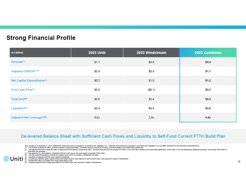 National Insurgent Fiber Powerhouse with Multiple Levers for Value Creation 14 ▪ Consumer broadband business with 1.5 million fiber households and ~400,000 current fiber subscribers ▪ Significant growth opportunity – expected to reach ~1.9 million homes by 2027 (1) ▪ Wholesale and commercial fiber infrastructure serving carriers, hyper - scalers and enterprises ▪ Underpinned by long - term contracts with blue - chip customers ▪ Leads with wholesale approach and effectively leverages network to capture near - net enterprise lease - up opportunity KINETIC FIBER INFRASTRUCTURE Note: All financial data as of December 31, 2023. Excludes corporate expenses and legacy Windstream revenue. Uniti is Well - Positioned to Unlock V alue and Deliver Long - Term Returns ~$1.0 Billion 2023 Adjusted EBITDA ~$2.2 Billion 2023 Revenue ~$0.8 Billion 2023 Revenue ~$0.4 Billion 2023 Adjusted EBITDA ▪ Provides cloud - enabled connectivity, communications and security solutions to enterprise customers ▪ Underpinned by long - term contracts with high - quality customer base ▪ Go forward strategy will focus on facilities - based services Managed Services ~$0.3 Billion 2023 Adjusted EBITDA ~$1.0 Billion 2023 Revenue (1) Does not include expanded build plan.