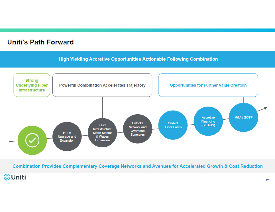 Meaningful Near - Term Savings & Additional Long - Term Synergies 16 Opex Savings Targeted annual opex savings of up to $100 million ▪ Corporate technology, system and software integration ▪ On - net / off - net savings including backhaul savings ▪ Corporate functions and process efficiencies Capex Savings Targeted annual capex savings of $20 - $30 million ▪ Plan to forego Kinetic transport network upgrades by leveraging existing Uniti network ▪ Elimination of redundant builds / routes ▪ Purchasing power from enhanced scale Enhanced Sales ▪ Optimizes Uniti’s Wireless relationships ▪ Optimizes Windstream’s Hyperscaler relationships ▪ Greater network reach and coverage Optimize Kinetic Build ▪ Aligns incentives to invest in Uniti owned fiber markets ▪ Optionality to expand residential broadband build by up to one million additional households Accelerate Uniti Fiber Metro Growth ▪ More national coverage enables cost efficient entry into new metros ▪ Potential FTTH edge - out in certain Uniti Fiber metro markets Cost of Capital Improvement ▪ No renewal friction hindering refinancing options ▪ Provides greater flexibility for ABS financing on combined company