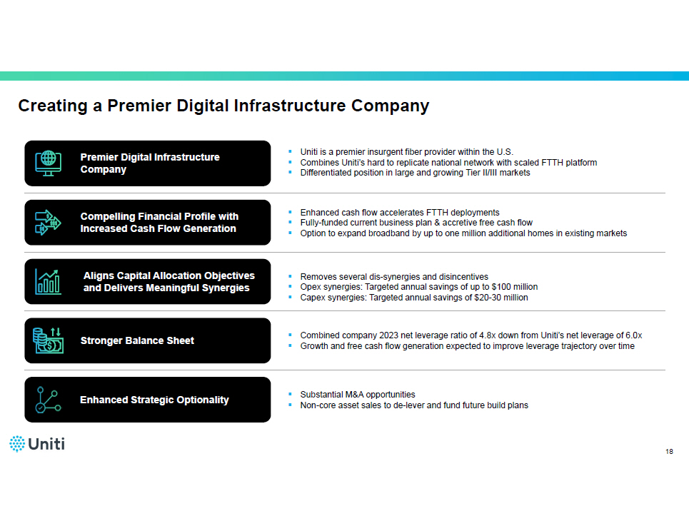 Uniti’s Path Forward 17 FTTH Upgrade and Expansion Fiber Infrastructure Metro Market & Waves Expansion On - Net Fiber Focus Accretive Financing (i.e. ABS) M&A / SOTP Unlocks Network and Overhead Synergies Powerful Combination Accelerates Trajectory Opportunities for Further Value Creation Strong Underlying Fiber Infrastructure Combination Provides Complementary Coverage Networks and Avenues for Accelerated Growth & Cost Reduction High Yielding Accretive Opportunities Actionable Following Combination