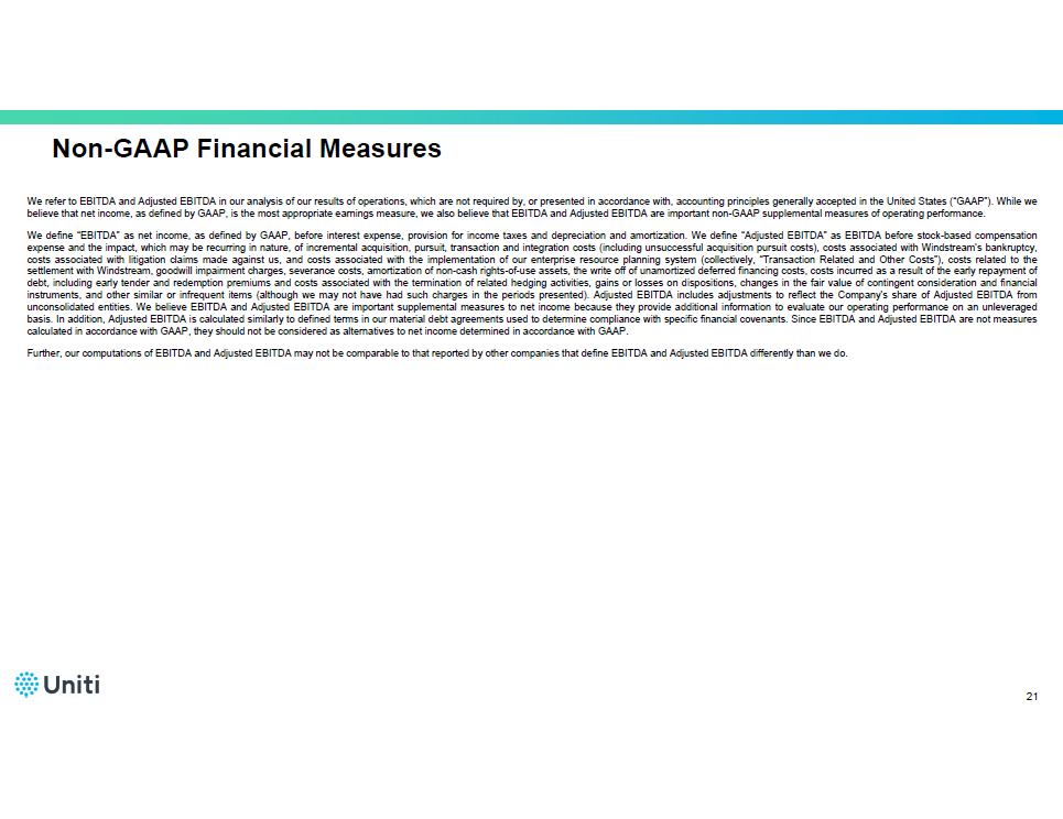 Reconciliation of Non - GAAP Financial Measures (1) $ in millions 2023 Windstream Uniti ($210) ($82) Net loss (2) 791 311 Depreciation and amortization 210 512 Interest expense (61) (68) Income tax benefit $730 $673 EBITDA 13 13 Stock - based compensation - 3 Adjustments for unconsolidated entities (2) 172 235 Transaction related costs & Other (2) $914 $924 Adjusted EBITDA (1) Amounts may not foot due to rounding. Combined Adjusted EBITDA excludes $70 million of non - cash items related to the master lease agreements, $130 million of GCI and Windstream settlement payments , and includes $100 million of estimated cost synergies. (2) Uniti includes $204 million goodwill impairment charge related to our Uniti Fiber segment and $9 million of Adjusted EBITDA r ela ted to recent asset sales. Windstream includes $98 million of settlement payments received from Uniti. 20