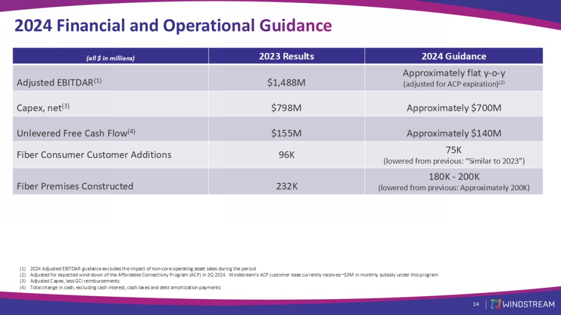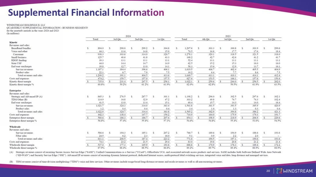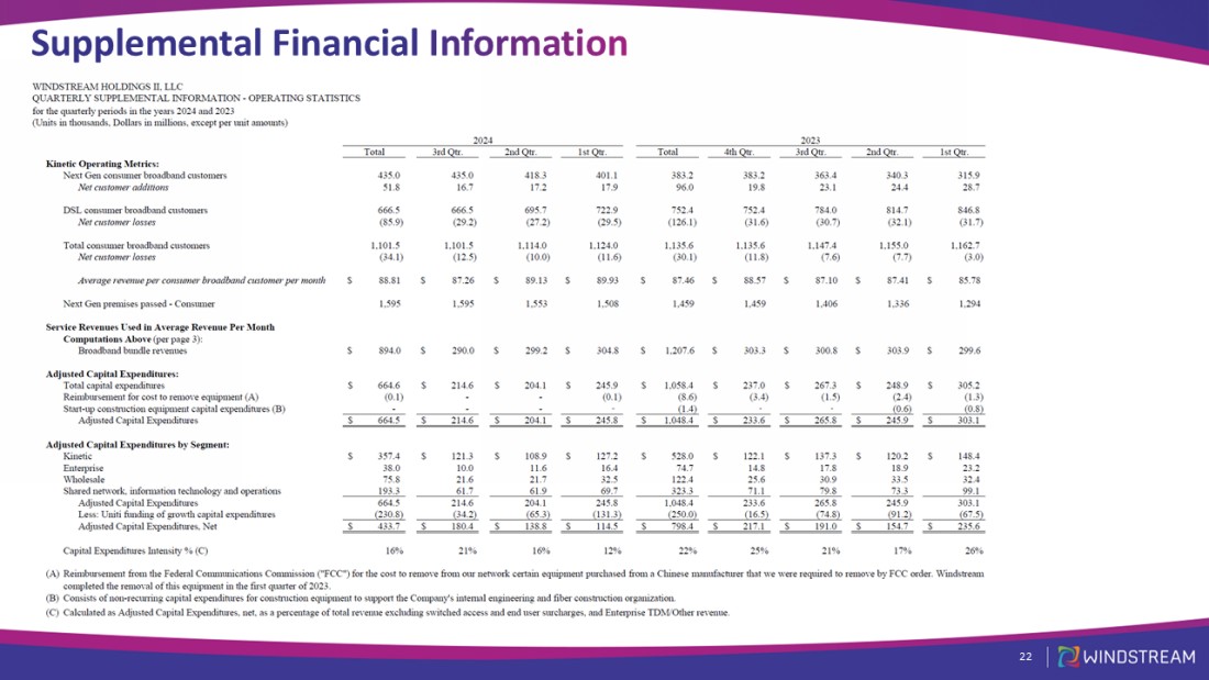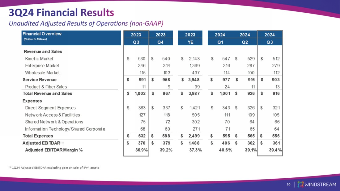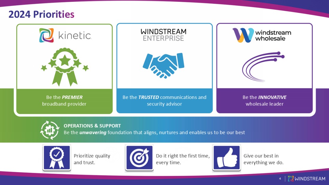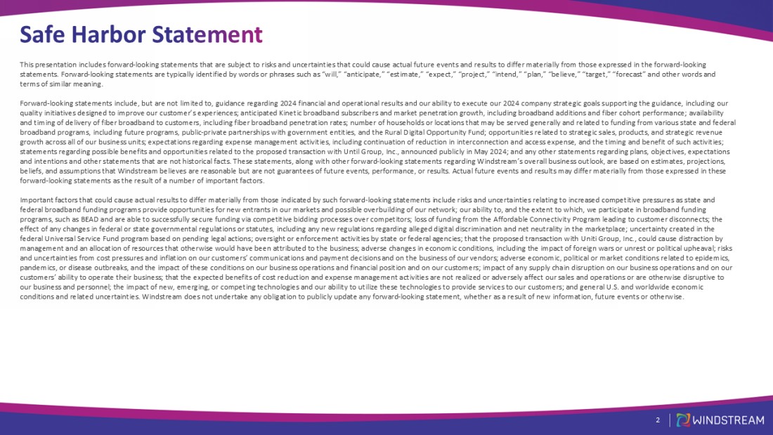 2 This presentation includes forward - looking statements that are subject to risks and uncertainties that could cause actual future events and results to differ materially from those expressed in the forward - looking statements. Forward - looking statements are typically identified by words or phrases such as “will,” “anticipate,” “estimate,” “e xpect,” “project,” “intend,” “plan,” “believe,” “target,” “forecast” and other words and terms of similar meaning. Forward - looking statements include, but are not limited to, guidance regarding 2024 financial and operational results and our ab ility to execute our 2024 company strategic goals supporting the guidance, including our quality initiatives designed to improve our customer’s experiences; anticipated Kinetic broadband subscribers and market pene tra tion growth, including broadband additions and fiber cohort performance; availability and timing of delivery of fiber broadband to customers, including fiber broadband penetration rates; number of households or loc ations that may be served generally and related to funding from various state and federal broadband programs, including future programs, public - private partnerships with government entities, and the Rural Digital Oppor tunity Fund; opportunities related to strategic sales, products, and strategic revenue growth across all of our business units; expectations regarding expense management activities, including continuation of redu cti on in interconnection and access expense, and the timing and benefit of such activities; statements regarding possible benefits and opportunities related to the proposed transaction with Until Group, Inc., announce d p ublicly in May 2024; and any other statements regarding plans, objectives, expectations and intentions and other statements that are not historical facts. These statements, along with other forward - looking statements regarding Windstream’s overall business outlook, are based on estimates, projections, beliefs, and assumptions that Windstream believes are reasonable but are not guarantees of future events, performance, or res ult s. Actual future events and results may differ materially from those expressed in these forward - looking statements as the result of a number of important factors. Important factors that could cause actual results to differ materially from those indicated by such forward - looking statements i nclude risks and uncertainties relating to increased competitive pressures as state and federal broadband funding programs provide opportunities for new entrants in our markets and possible overbuilding of our network; our ability to, and the extent to which, we participate in broadband funding programs, such as BEAD and are able to successfully secure funding via competitive bidding processes over competitors; loss o f f unding from the Affordable Connectivity Program leading to customer disconnects; the effect of any changes in federal or state governmental regulations or statutes, including any new regulations regarding alleg ed digital discrimination and net neutrality in the marketplace; uncertainty created in the federal Universal Service Fund program based on pending legal actions; oversight or enforcement activities by state or federa l a gencies; that the proposed transaction with Uniti Group, Inc., could cause distraction by management and an allocation of resources that otherwise would have been attributed to the business; adverse changes in econo mic conditions, including the impact of foreign wars or unrest or political upheaval; risks and uncertainties from cost pressures and inflation on our customers’ communications and payment decisions and on the business of our vendors; adverse economic, political or market conditions related to epidemics, pandemics, or disease outbreaks, and the impact of these conditions on our business operations and financial position and on our customers; impact of any supply chain disruption on our business operations and on our customers’ ability to operate their business; that the expected benefits of cost reduction and expense management activities are not realized or adversely affect our sales and operations or are otherwise disruptive to our business and personnel; the impact of new, emerging, or competing technologies and our ability to utilize these technolog ies to provide services to our customers; and general U.S. and worldwide economic conditions and related uncertainties. Windstream does not undertake any obligation to publicly update any forward - looking statem ent, whether as a result of new information, future events or otherwise.
