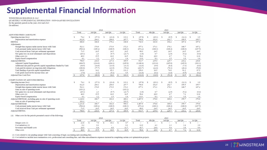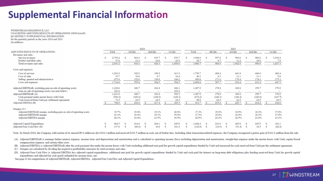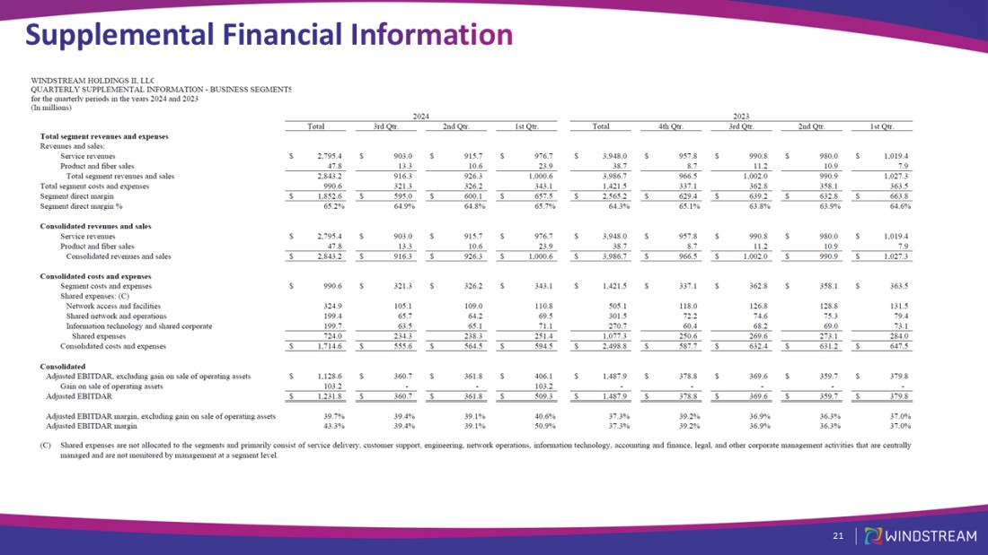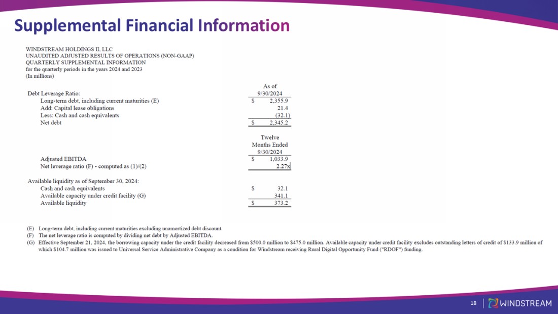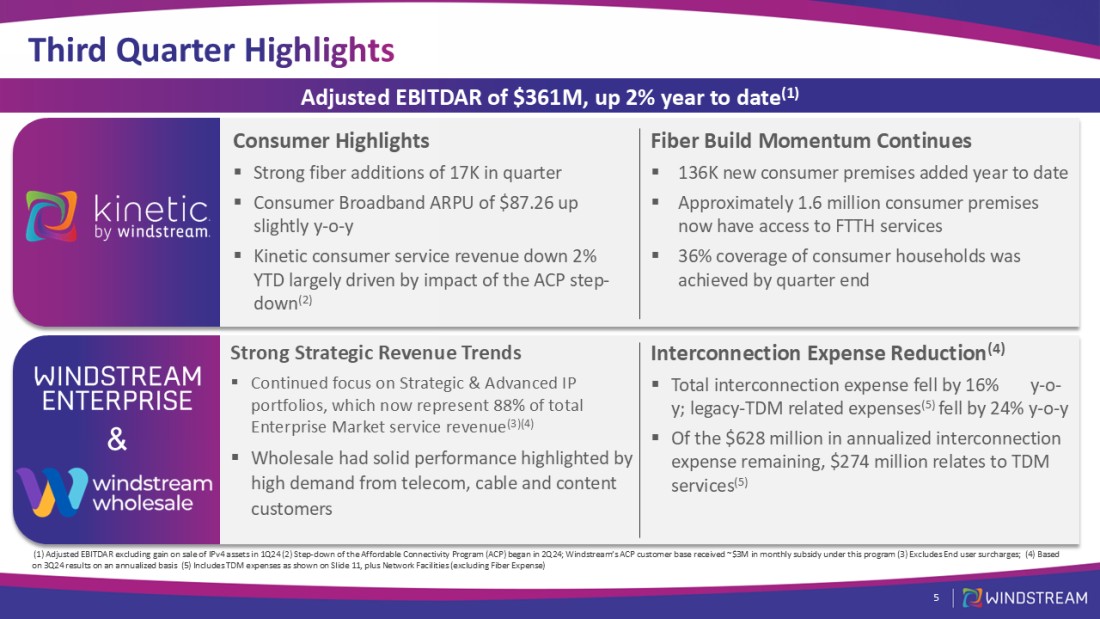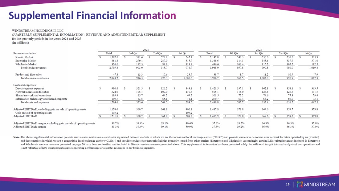2 This presentation includes forward - looking statements that are subject to risks and uncertainties that could cause actual future events and results to differ materially from those expressed in the forward - looking statements. Forward - looking statements are typically identified by words or phrases such as “will,” “anticipate,” “estimate,” “e xpect,” “project,” “intend,” “plan,” “believe,” “target,” “forecast” and other words and terms of similar meaning. Forward - looking statements include, but are not limited to, guidance regarding 2024 financial and operational results and our ab ility to execute our 2024 company strategic goals supporting the guidance, including our quality initiatives designed to improve our customer’s experiences; anticipated Kinetic broadband subscribers and market pene tra tion growth, including broadband additions and fiber cohort performance; availability and timing of delivery of fiber broadband to customers, including fiber broadband penetration rates; number of households or loc ations that may be served generally and related to funding from various state and federal broadband programs, including future programs, public - private partnerships with government entities, and the Rural Digital Oppor tunity Fund; opportunities related to strategic sales, products, and strategic revenue growth across all of our business units; expectations regarding expense management activities, including continuation of redu cti on in interconnection and access expense, and the timing and benefit of such activities; statements regarding possible benefits and opportunities related to the proposed transaction with Until Group, Inc., announce d p ublicly in May 2024; and any other statements regarding plans, objectives, expectations and intentions and other statements that are not historical facts. These statements, along with other forward - looking statements regarding Windstream’s overall business outlook, are based on estimates, projections, beliefs, and assumptions that Windstream believes are reasonable but are not guarantees of future events, performance, or res ult s. Actual future events and results may differ materially from those expressed in these forward - looking statements as the result of a number of important factors. Important factors that could cause actual results to differ materially from those indicated by such forward - looking statements i nclude risks and uncertainties relating to increased competitive pressures as state and federal broadband funding programs provide opportunities for new entrants in our markets and possible overbuilding of our network; our ability to, and the extent to which, we participate in broadband funding programs, such as BEAD and are able to successfully secure funding via competitive bidding processes over competitors; loss o f f unding from the Affordable Connectivity Program leading to customer disconnects; the effect of any changes in federal or state governmental regulations or statutes, including any new regulations regarding alleg ed digital discrimination and net neutrality in the marketplace; uncertainty created in the federal Universal Service Fund program based on pending legal actions; oversight or enforcement activities by state or federa l a gencies; that the proposed transaction with Uniti Group, Inc., could cause distraction by management and an allocation of resources that otherwise would have been attributed to the business; adverse changes in econo mic conditions, including the impact of foreign wars or unrest or political upheaval; risks and uncertainties from cost pressures and inflation on our customers’ communications and payment decisions and on the business of our vendors; adverse economic, political or market conditions related to epidemics, pandemics, or disease outbreaks, and the impact of these conditions on our business operations and financial position and on our customers; impact of any supply chain disruption on our business operations and on our customers’ ability to operate their business; that the expected benefits of cost reduction and expense management activities are not realized or adversely affect our sales and operations or are otherwise disruptive to our business and personnel; the impact of new, emerging, or competing technologies and our ability to utilize these technolog ies to provide services to our customers; and general U.S. and worldwide economic conditions and related uncertainties. Windstream does not undertake any obligation to publicly update any forward - looking statem ent, whether as a result of new information, future events or otherwise.